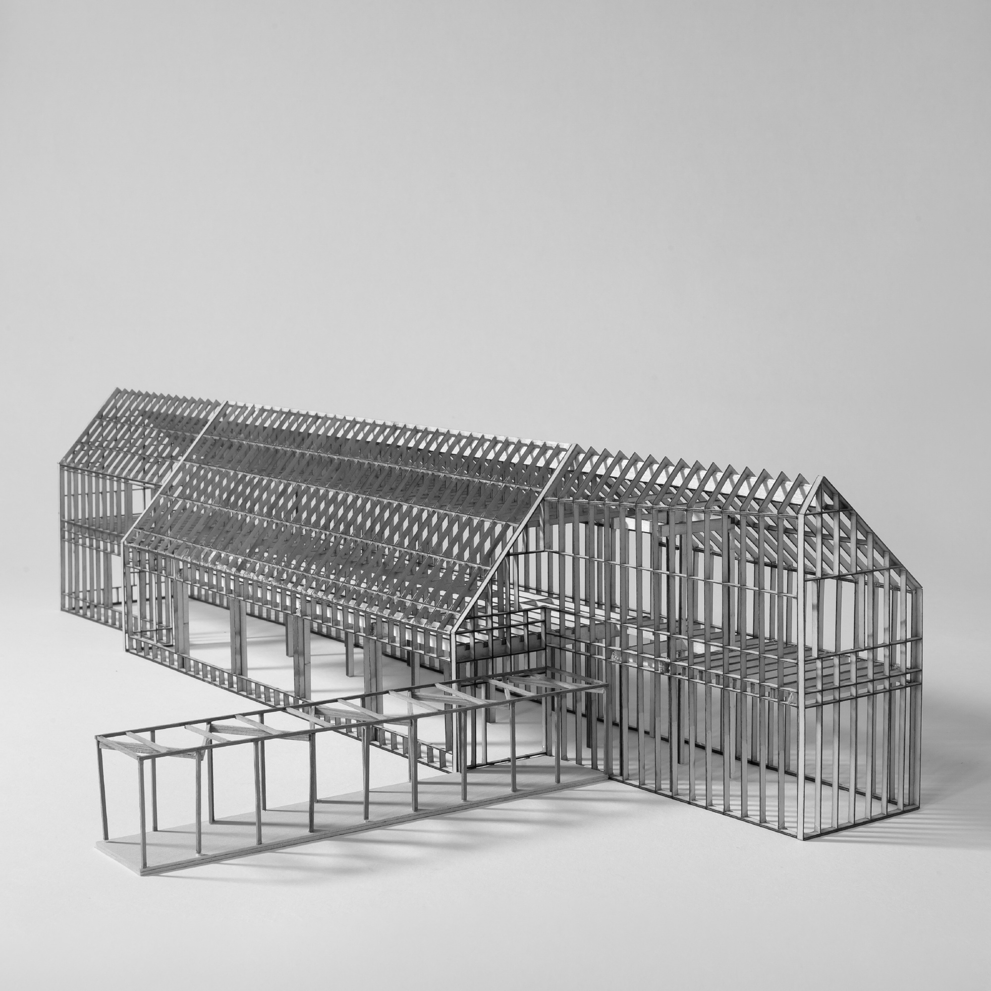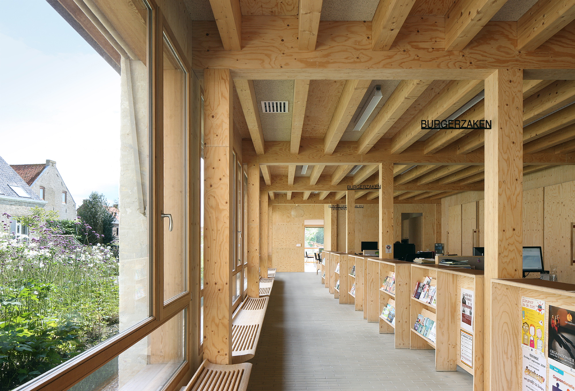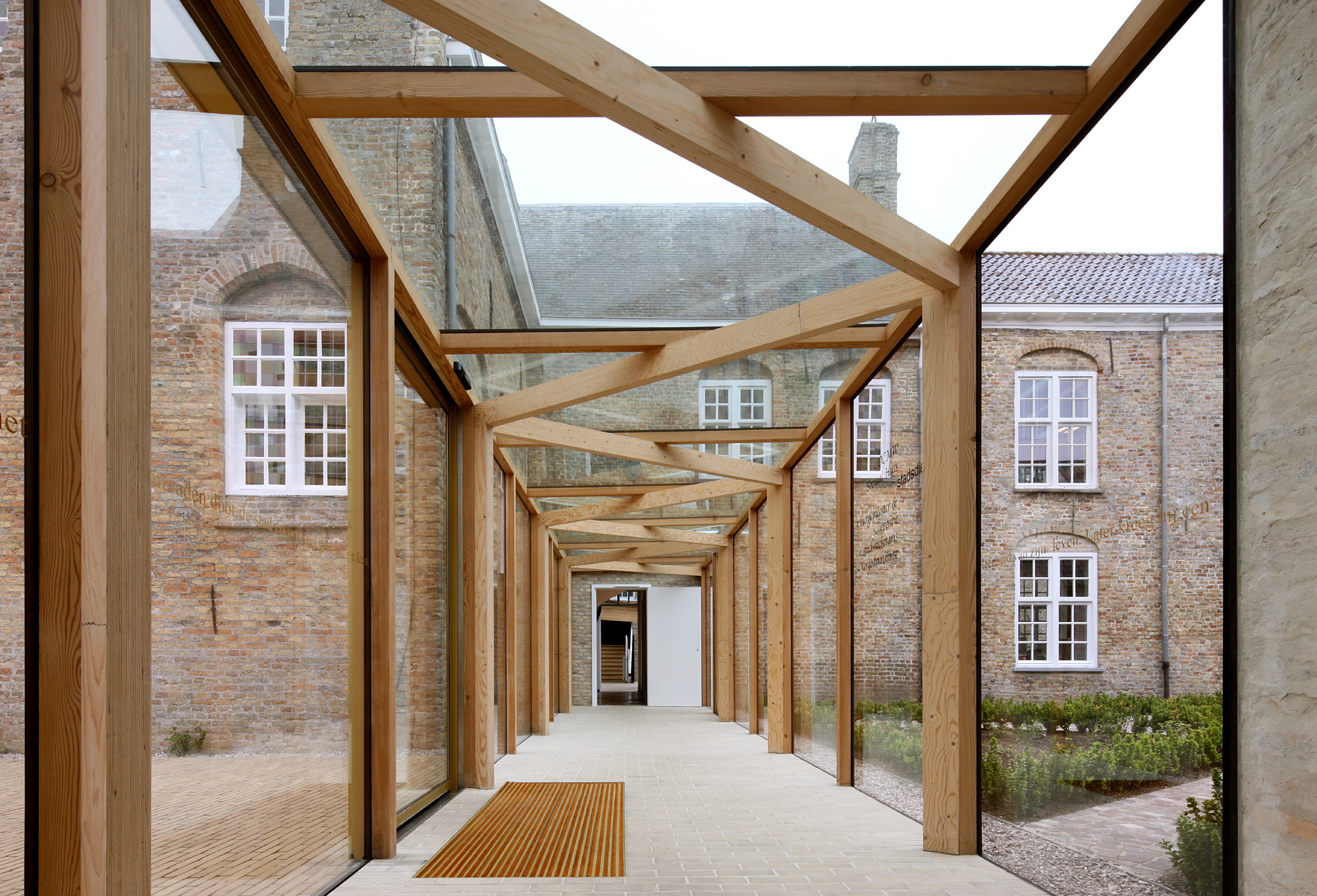 The new building unfolds like one of the typical long-gable farmhouses of the polders, with living quarters, barn and stables all in a single row. Everything is built in wood to contrast with the brick outer shells of the buildings. The choice of wood as a structural material defines the atmosphere of the public area and the weight of the extended archives on the floor above is reflected in the wooden columns and distinctive beamed ceiling that plays a defining role in this small but elongated space.