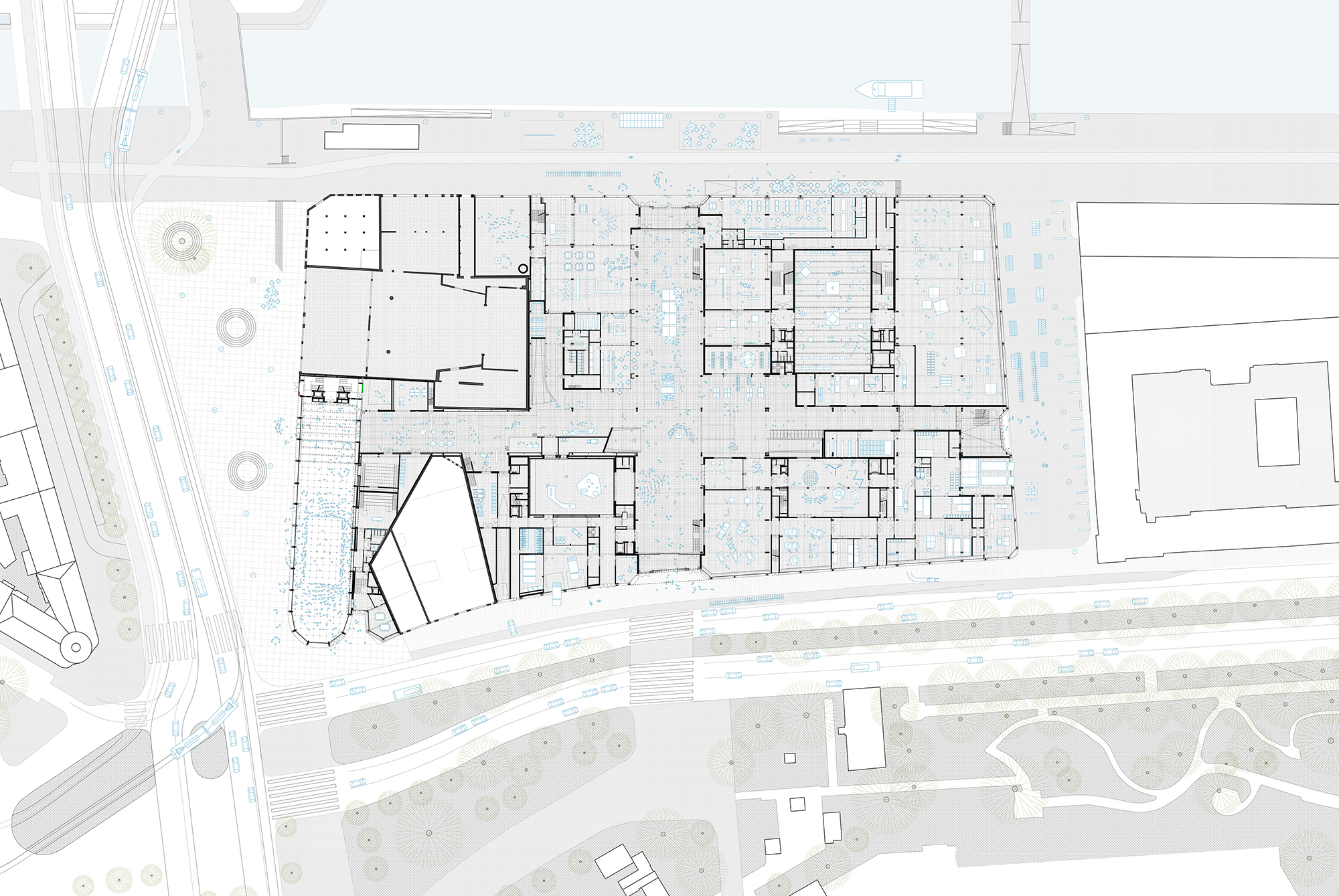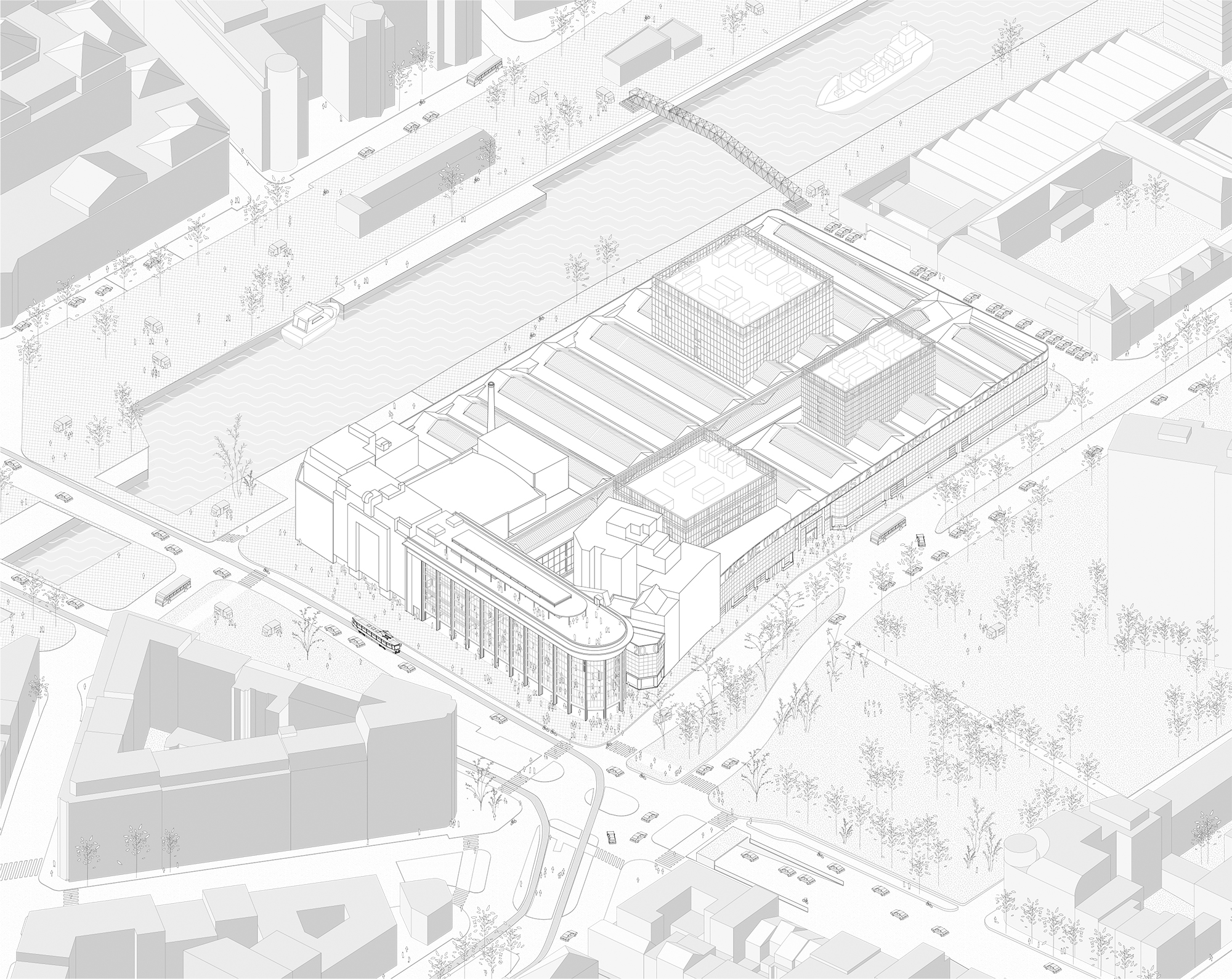 The proposal for KANAL reflects on the position of the twenty-first century museum in society. The former Citroën garage is the starting point. The fact that a building of this scale – 100 × 200 metres – is available in the heart of the Brussels-Capital region offers unmatched opportunities that it would be diffucult to achieve with a new building. The building is located in the heart of the Plan Canal, the area where new developments focus on a contemporary mix of housing, working, leisure and production spaces– the activity that is historically linked to the canal area. This is also the centre of the so-called ‘croissant pauvre’ – an area of Brussels that bears the marks of poverty and unemployment, but is for that very reason attractive to newcomers of all kinds: people new to Brussels, young families, artists, young creative practices.