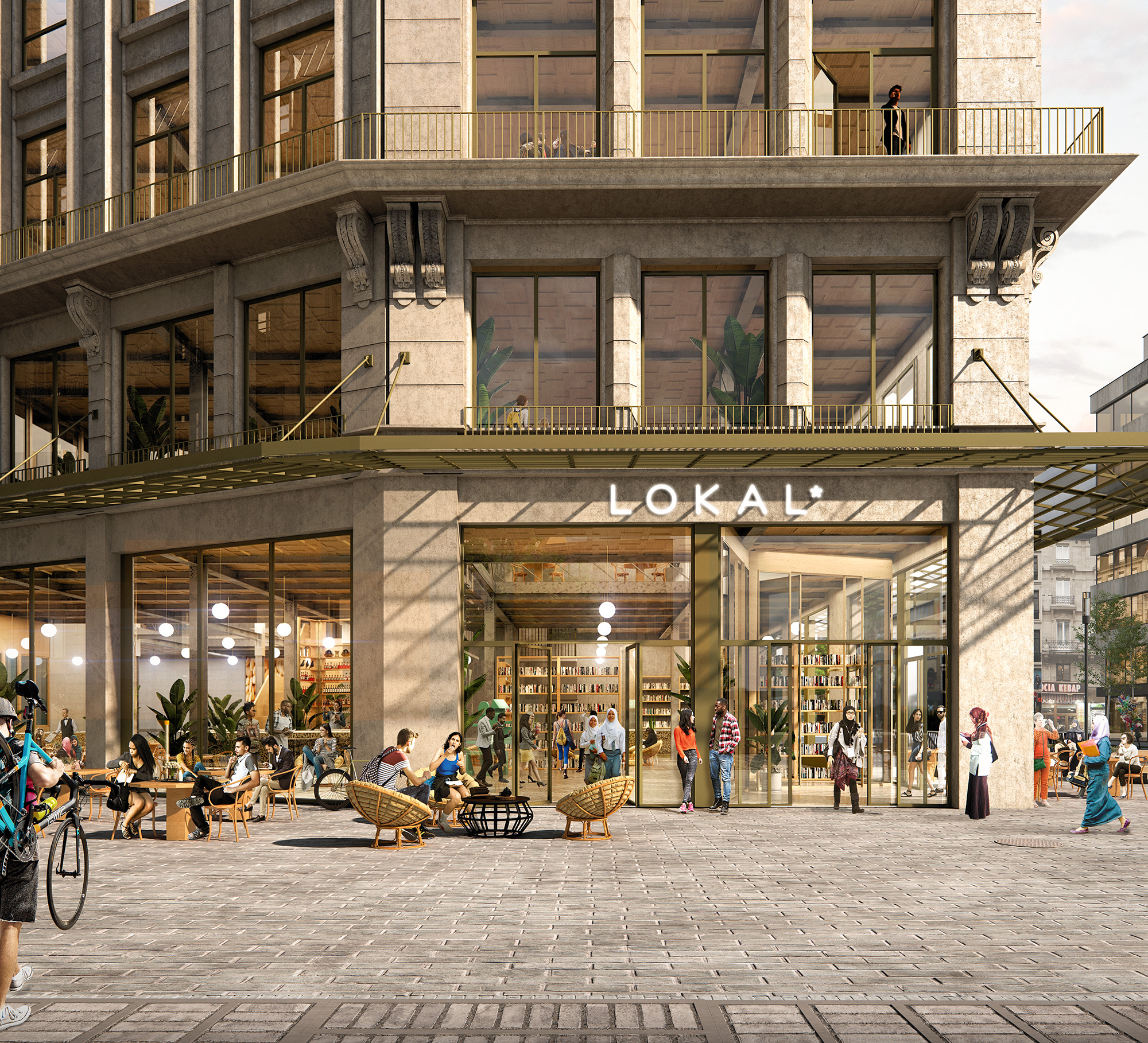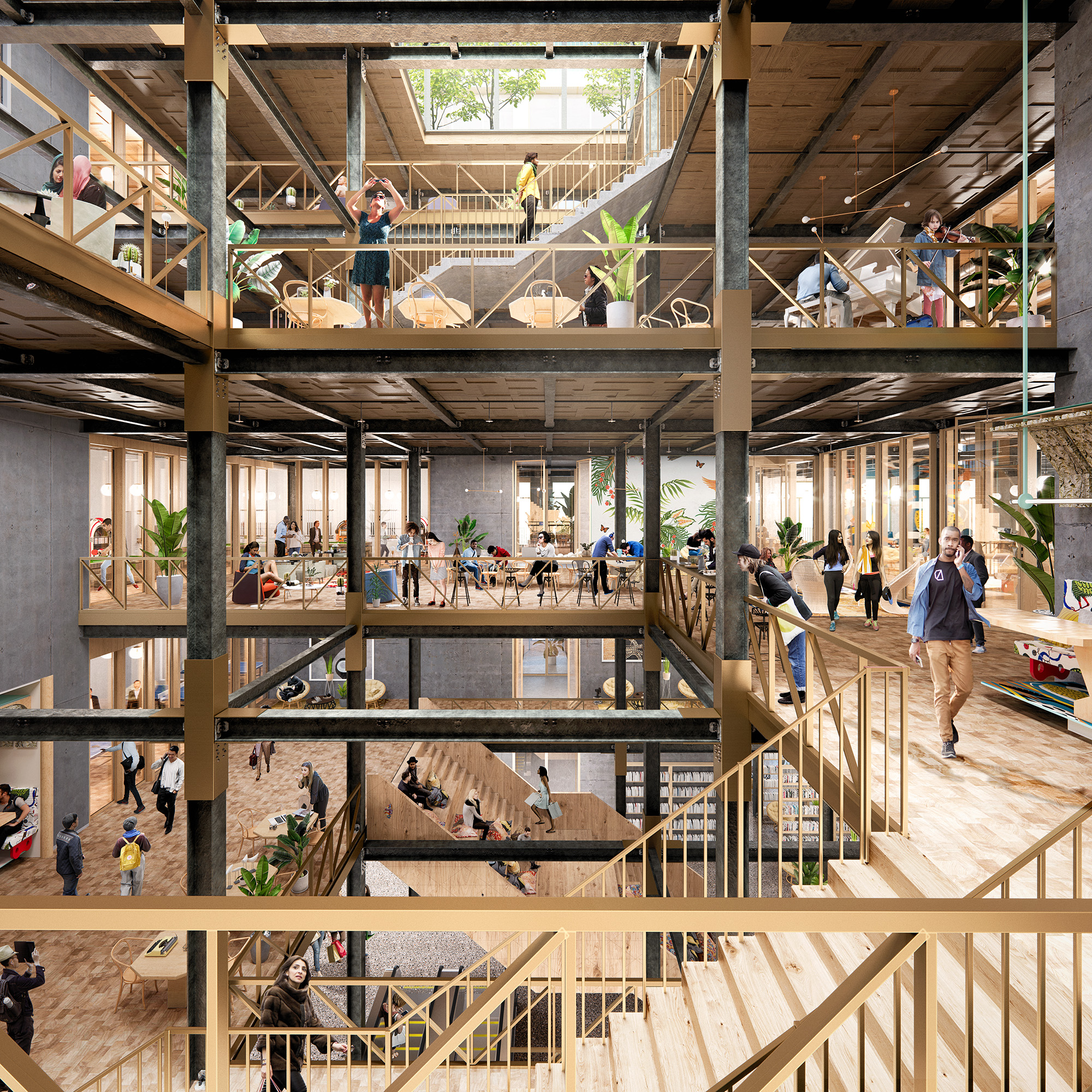 The old steel structure is preserved and conceived as a large three-dimensional structure that is filled in and hollowed out in the middle to form a spatial atrium. As a programme, we are collaborating with various local partners (Cohabs for cohousing, Silversquare for coworking, ULB for university education, research and student home) to create a place that appeals to the people of Brussels and gives Brussels its own character. The ground floor is like a covered market, open and walk-through.