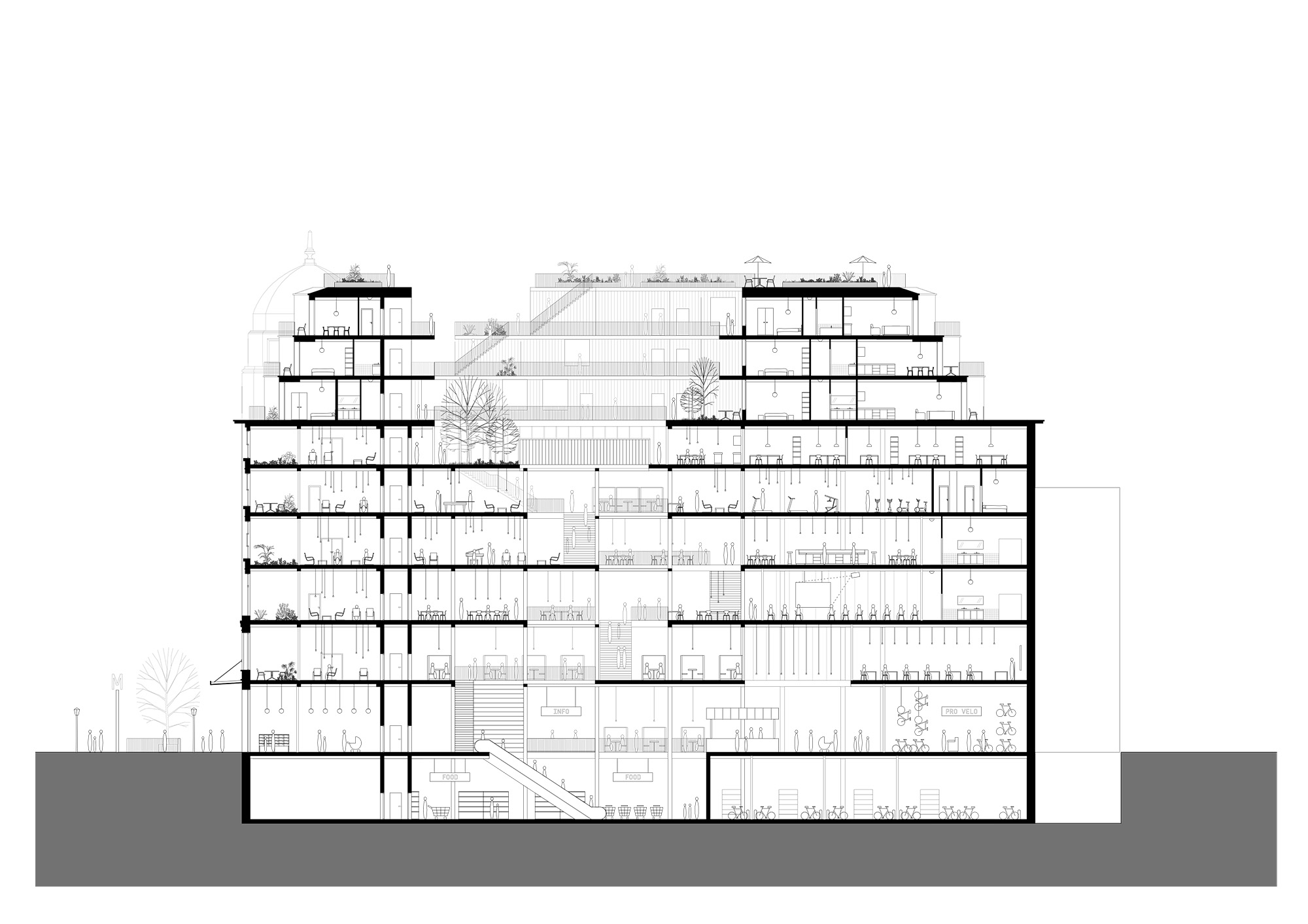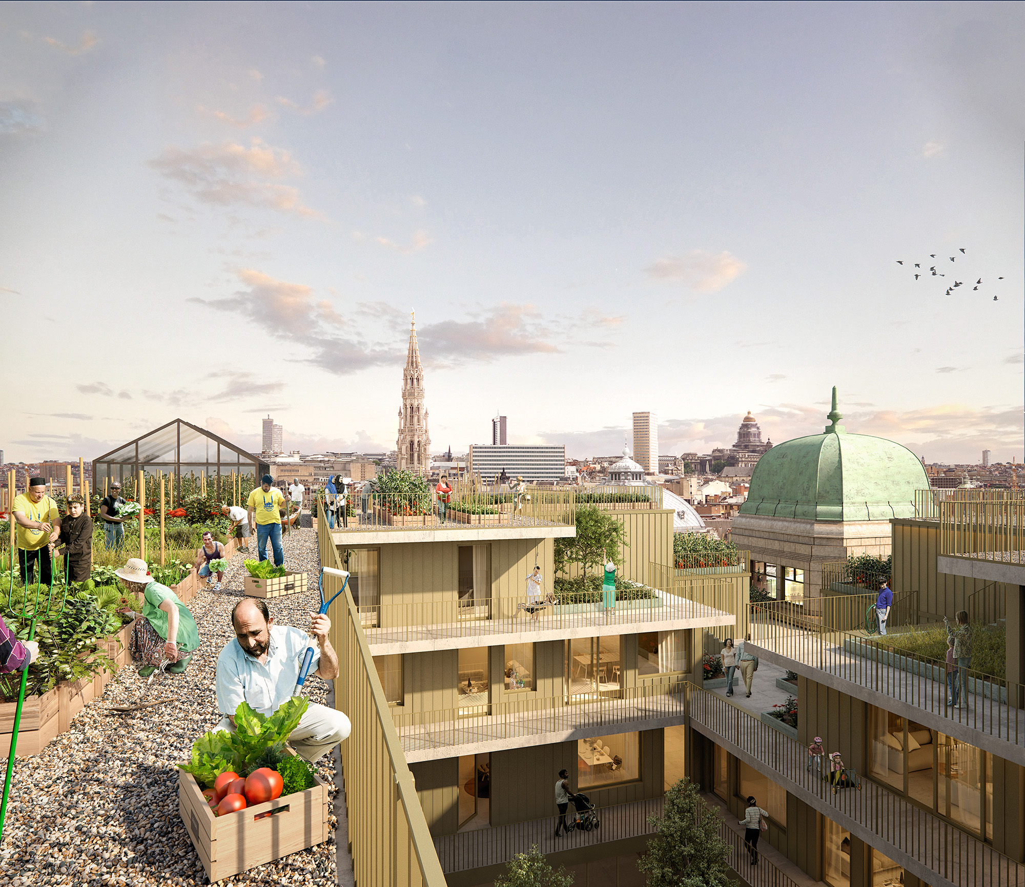 Flats will be built on the roof levels, there will be room for festivities under the dome, and on the roof the Brussels city farmer Love&Peas will grow vegetables for everyone who is willing to come and pick them.