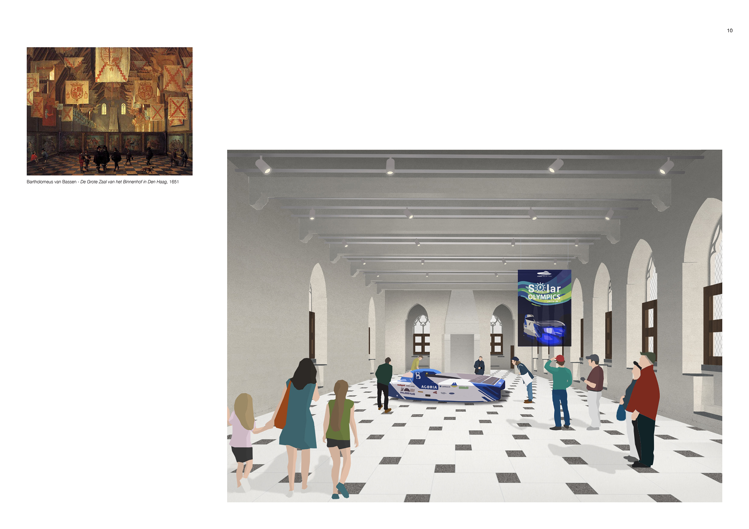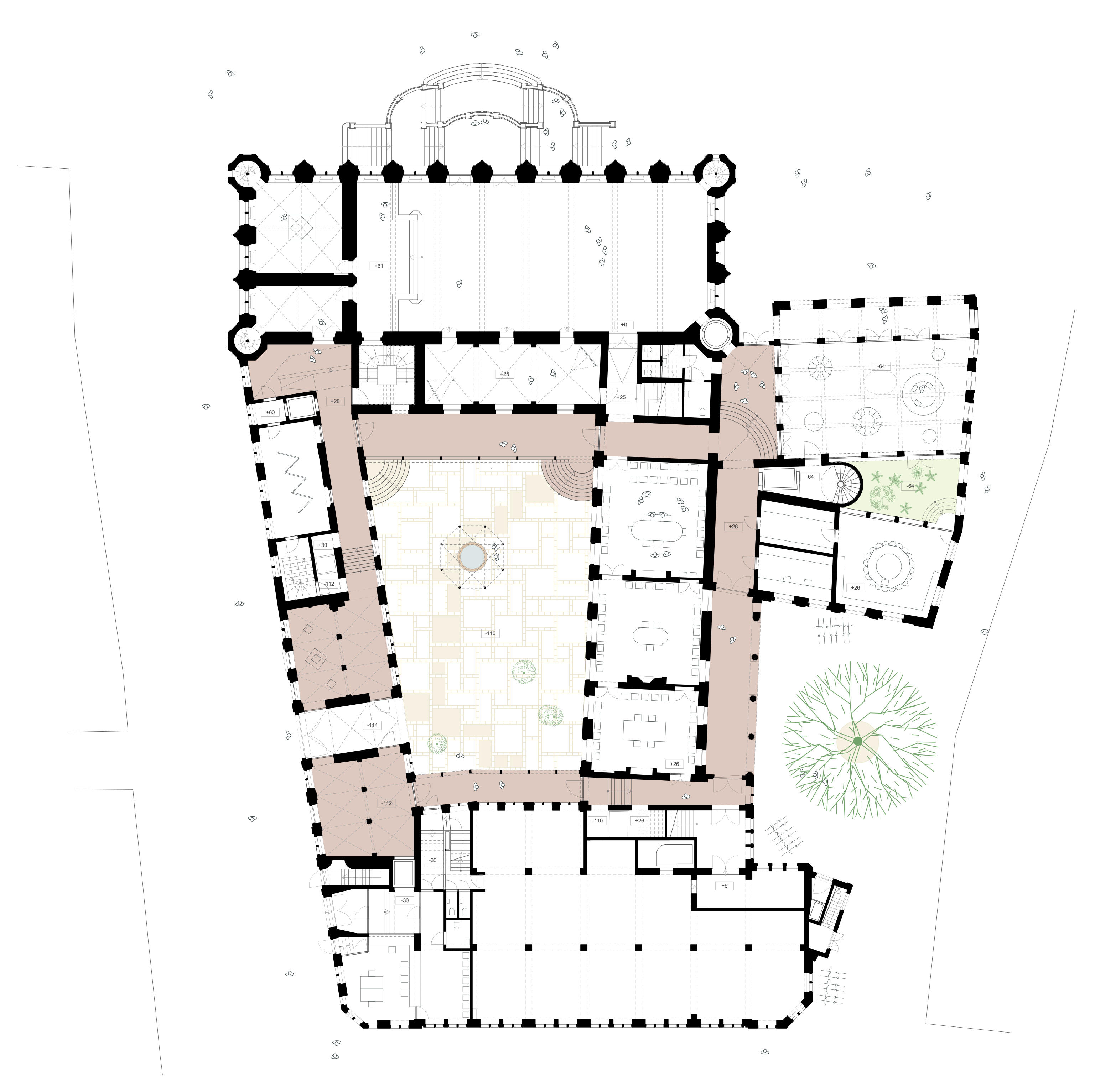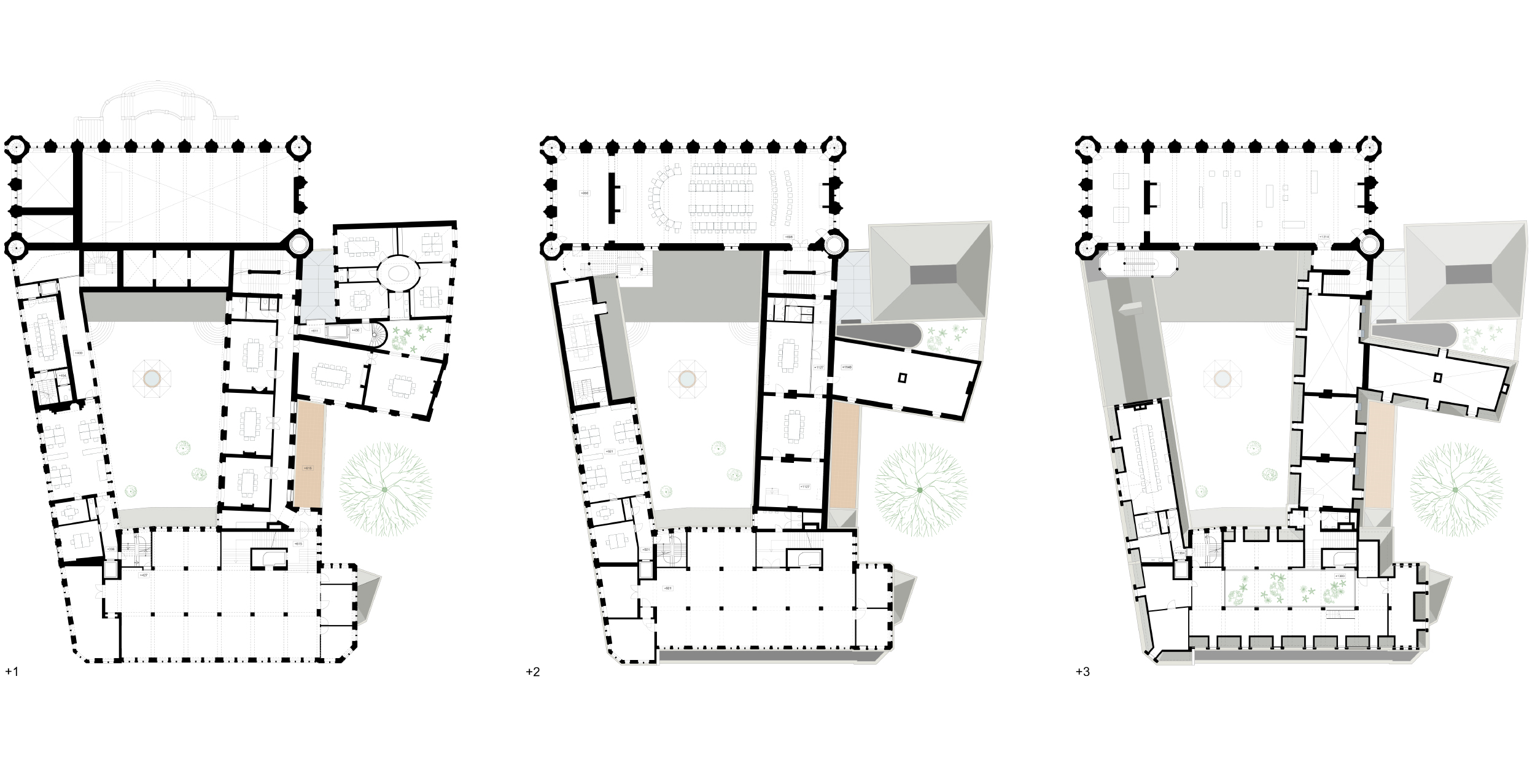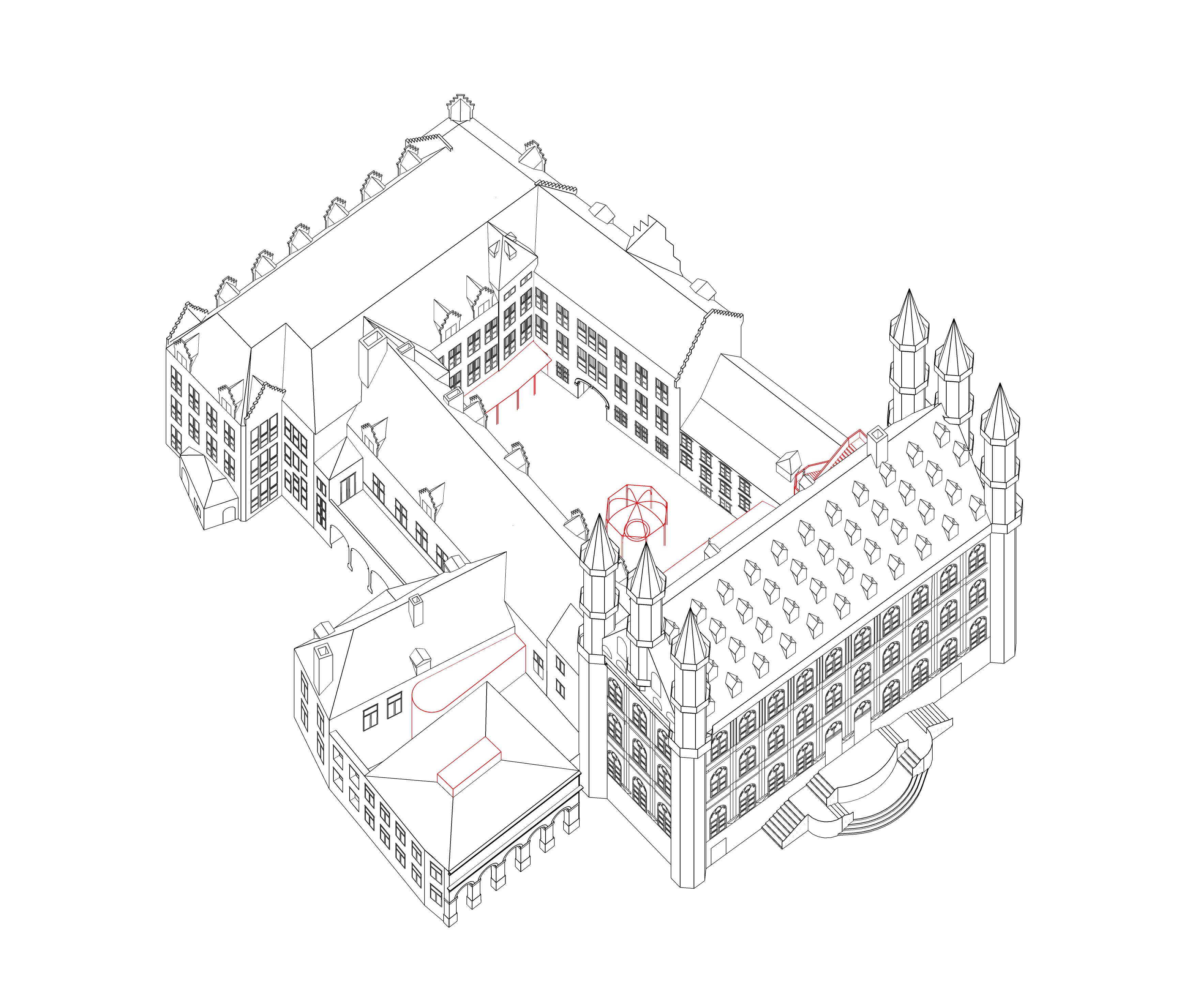 We combine the historical situation, a loose collection of individual fragments, with the desire to unite them into a working whole. The central courtyard Vrijthof remains free. The court as a space of decompression and respite amid the dense building area. Around it a circular tour that threads the existing corridors together and breaks through or completes sections where necessary. A circular walk with indoor and outdoor moments, which also connects existing and new stairs and elevators; a chain with the buildings as pearls.