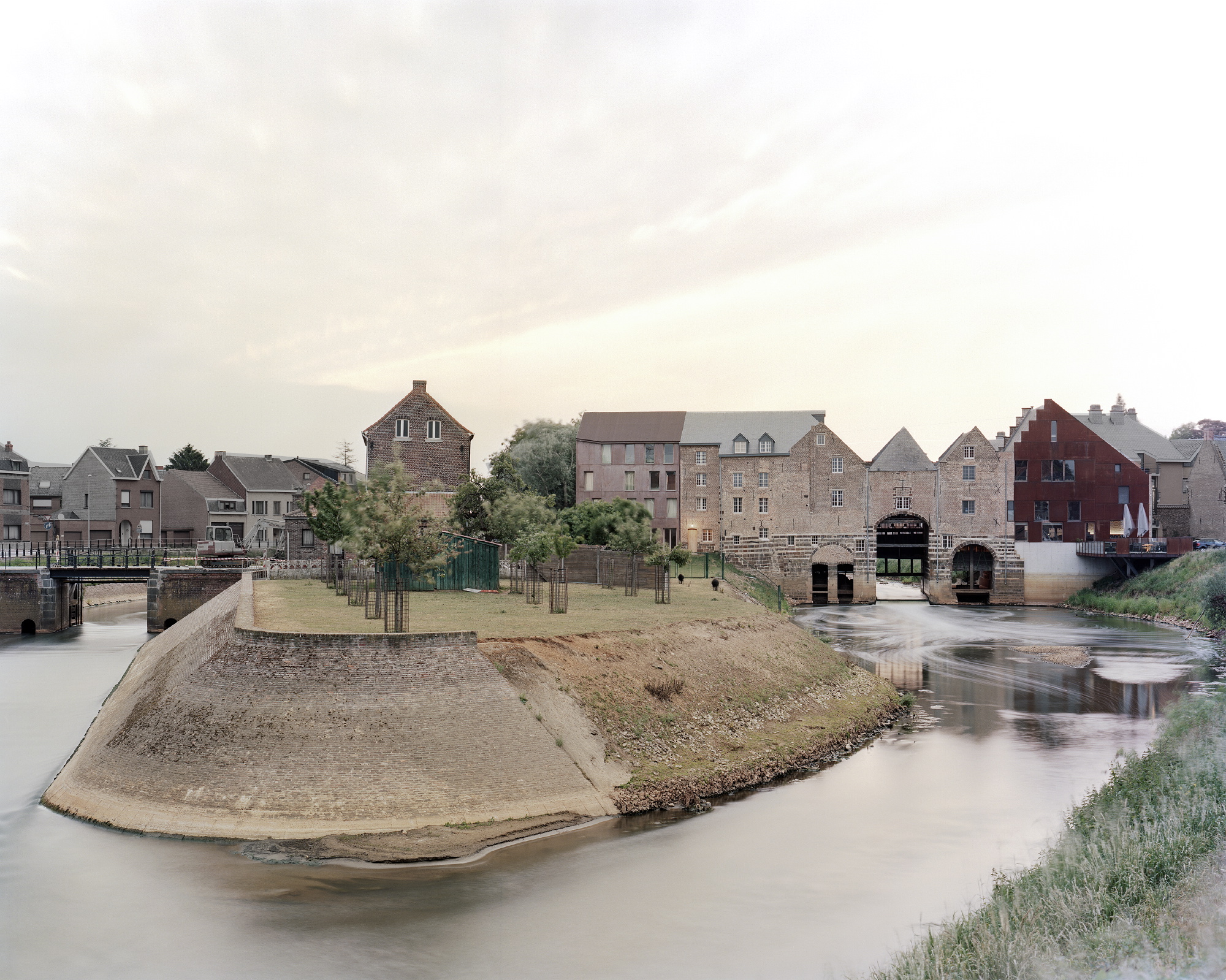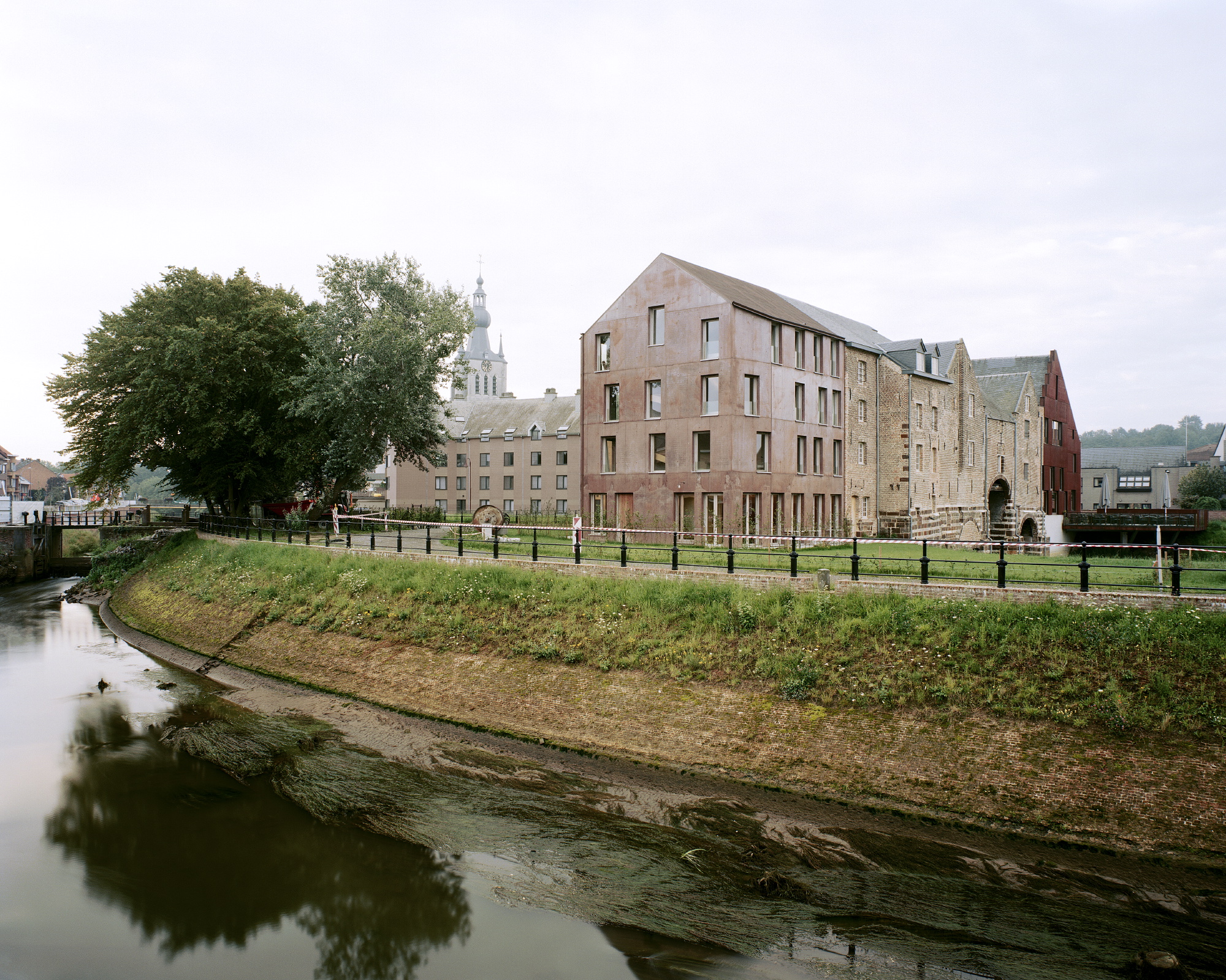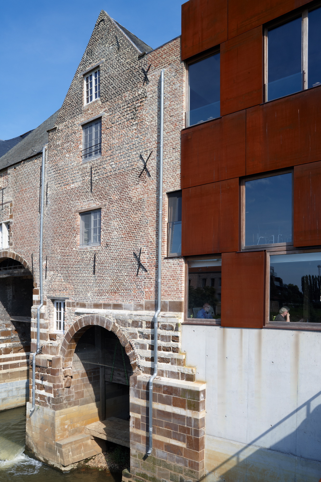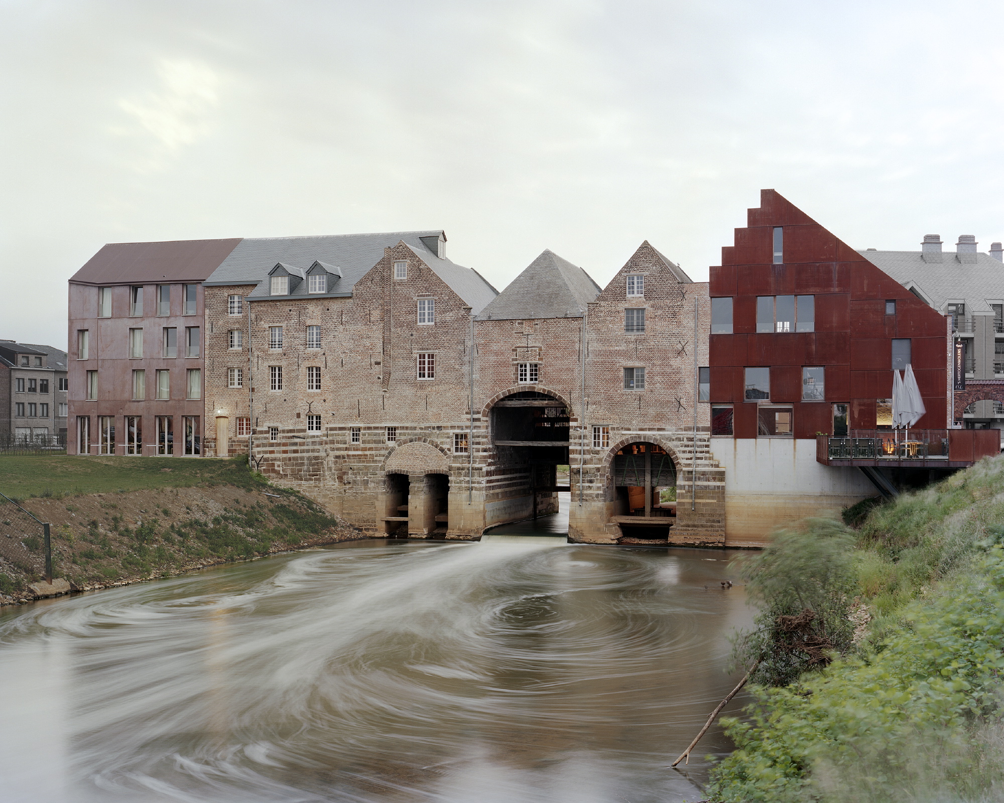 The ‘s Hertogmolens were built at the beginning of the sixteenth century. Over a period of almost 400 years they evolved step by step into a double mill with a central lock, which formed both a bridge over the River Demer and a part of the town walls. At the end of the twentieth century the north wing burnt down and the west façade of the complex collapsed. The bridge was closed. So the mills had remained as a ruin on an inaccessible site in the town for more than 20 years, making their restoration and re-use a matter of urgency.