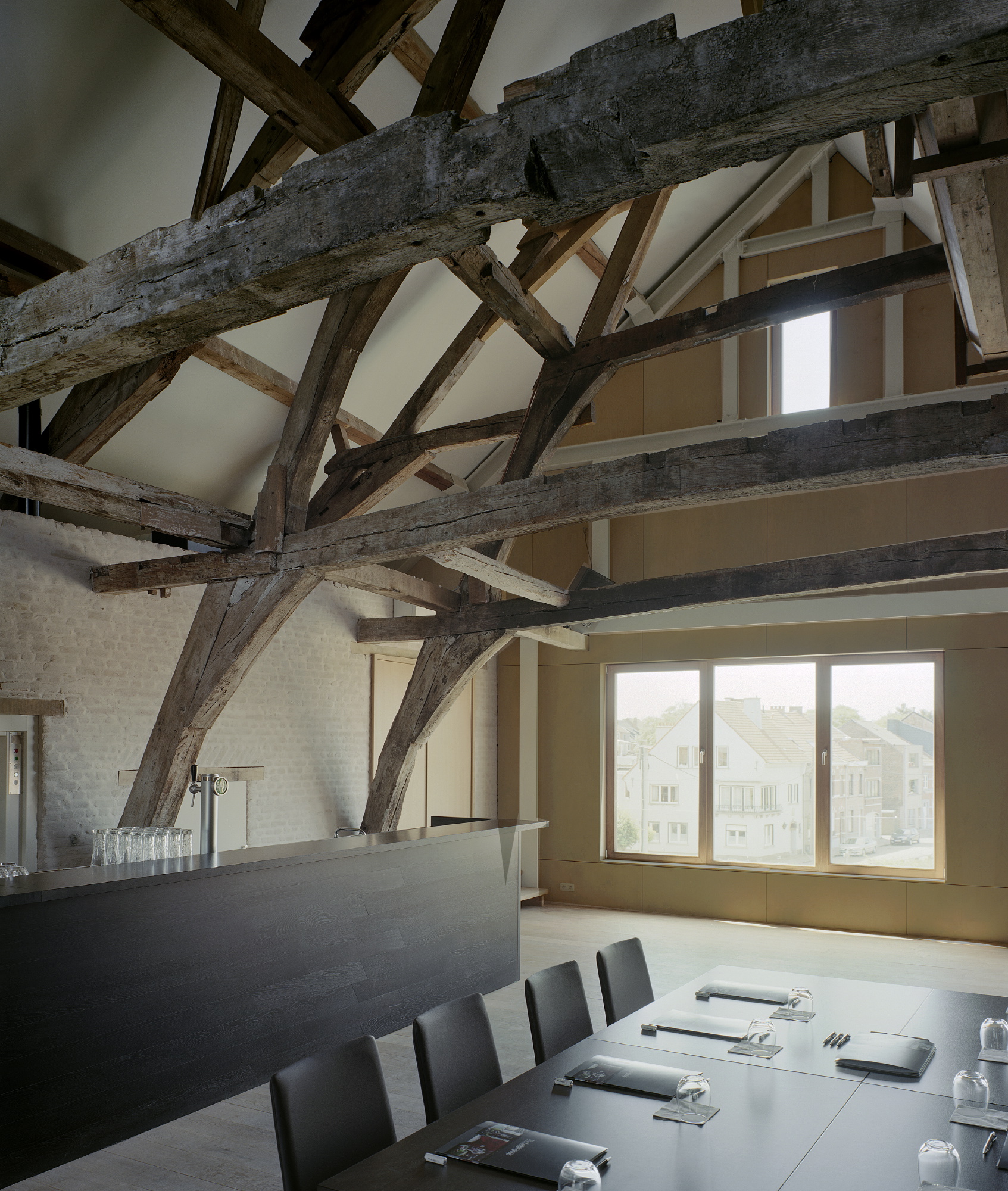 Despite having a building history covering several centuries, the materials used have always remained unambiguous: a plinth with alternating bands of white stone and the characteristic local Diestian ferruginous sandstone, facades in red brick and slate roofs. Time had given the ensemble a monolithic appearance. The west façade with its weathered wooden boards had in the meantime become a familiar sight. We decided not to rebuild in masonry, even though it is perfectly well known what the original building was like. Our basic principle was to focus on the entire history of the complex.