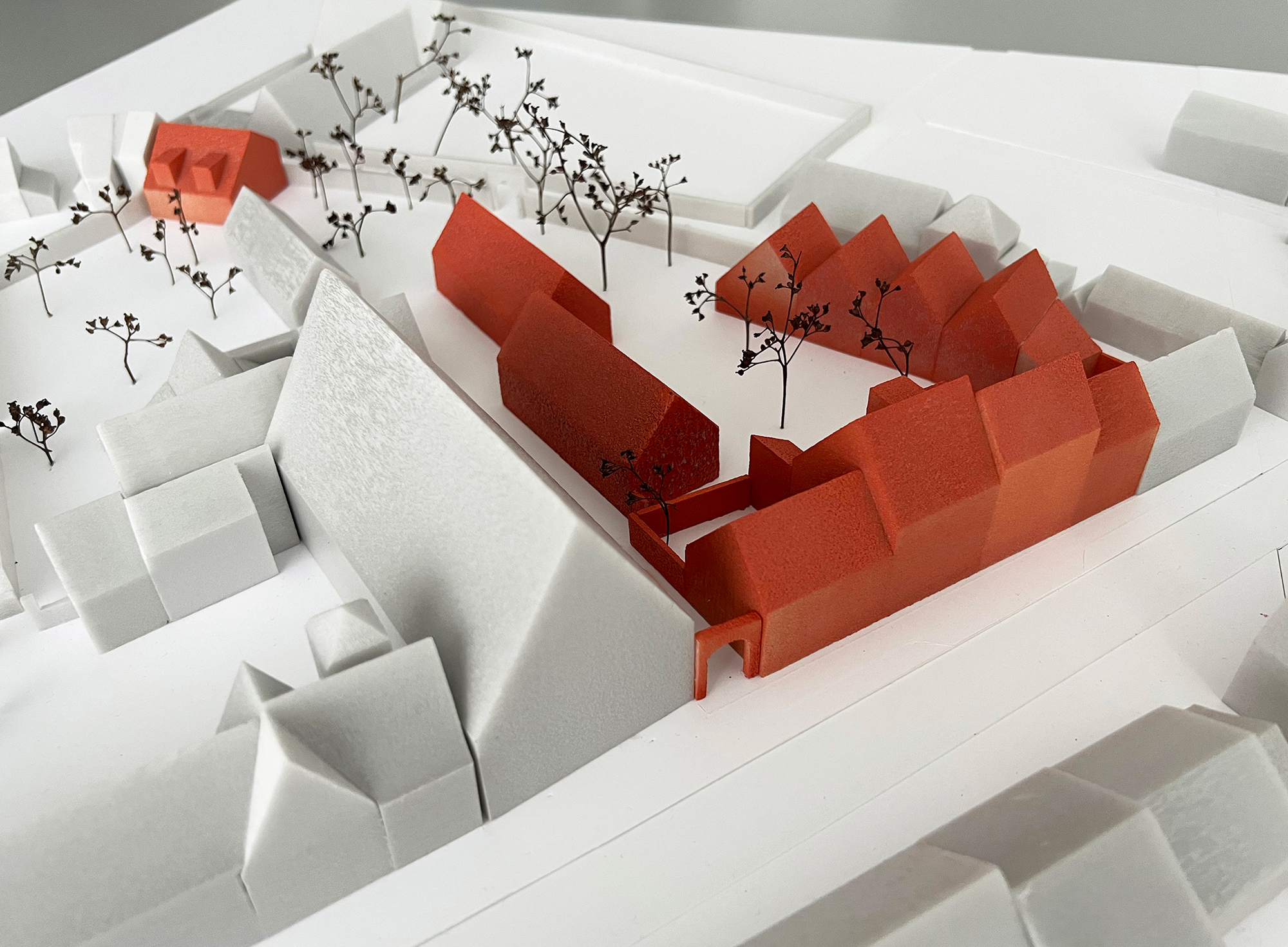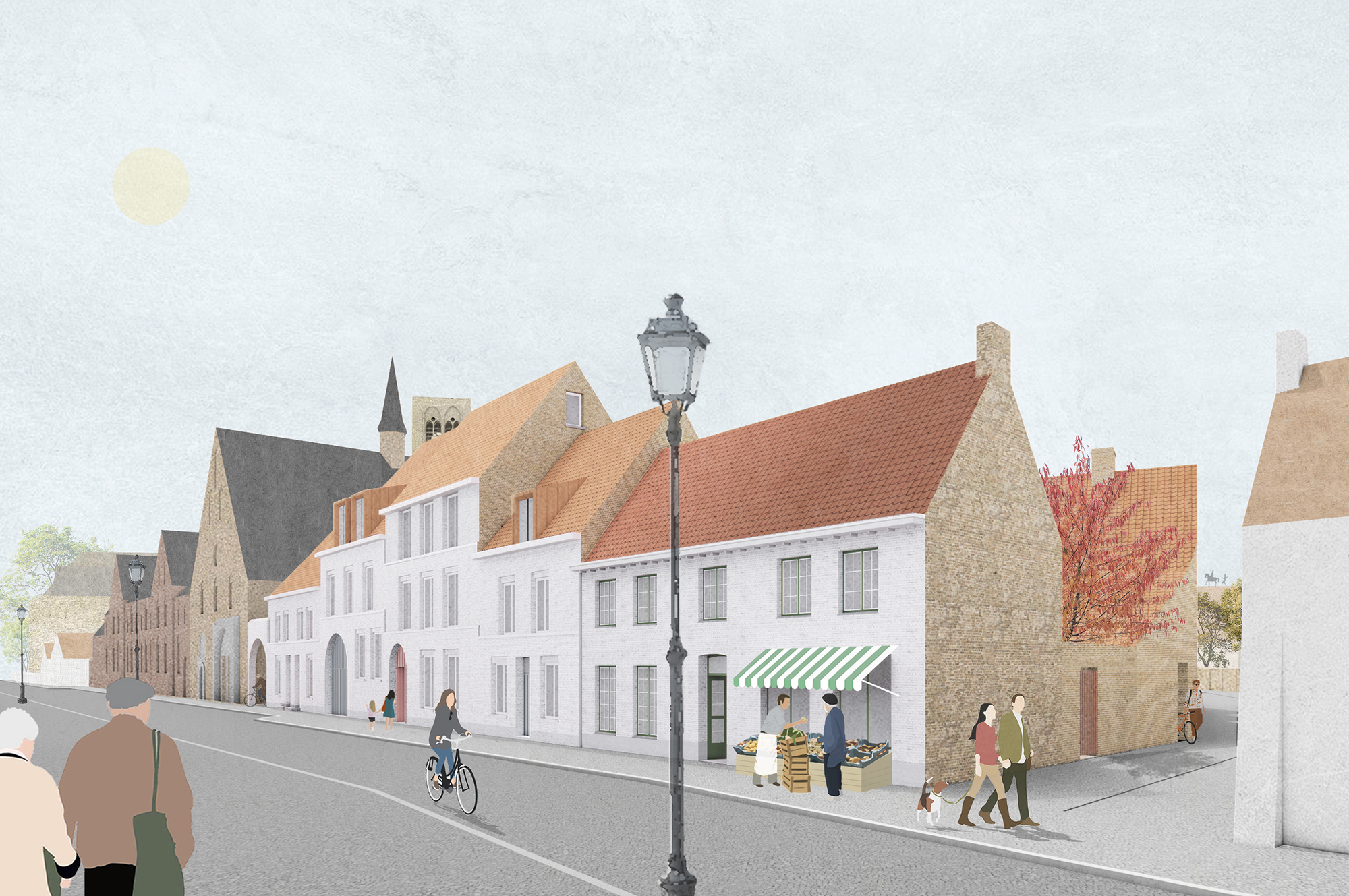 The master plan of Damme sets out an ambitious densification plan for the previous Saint John’s hospital site and its garden. The new development is of a scale unprecedented for the city Damme. This exceptional scale and the characteristics of the surroundings prompted us to create an arrangement of volumes with different heights and ridge directions that together form an ensemble that respects the scale and grain of the existing context. We looked at the different roof shapes found in the city, where steep gabled roofs with varying ridge heights and directions set the tone. Facades in brown-red brick, wooden joinery and sloping roofs with red clay tiles honour the existing facades of Damme and don’t distract attention from the exceptional architecture of the Saint John’s hospital.