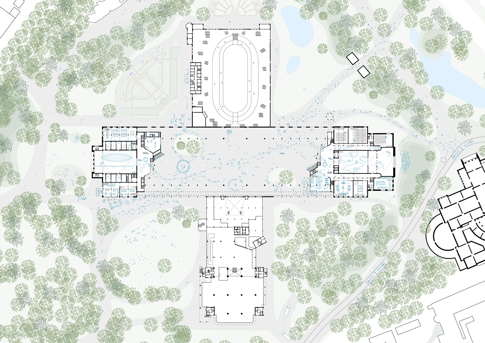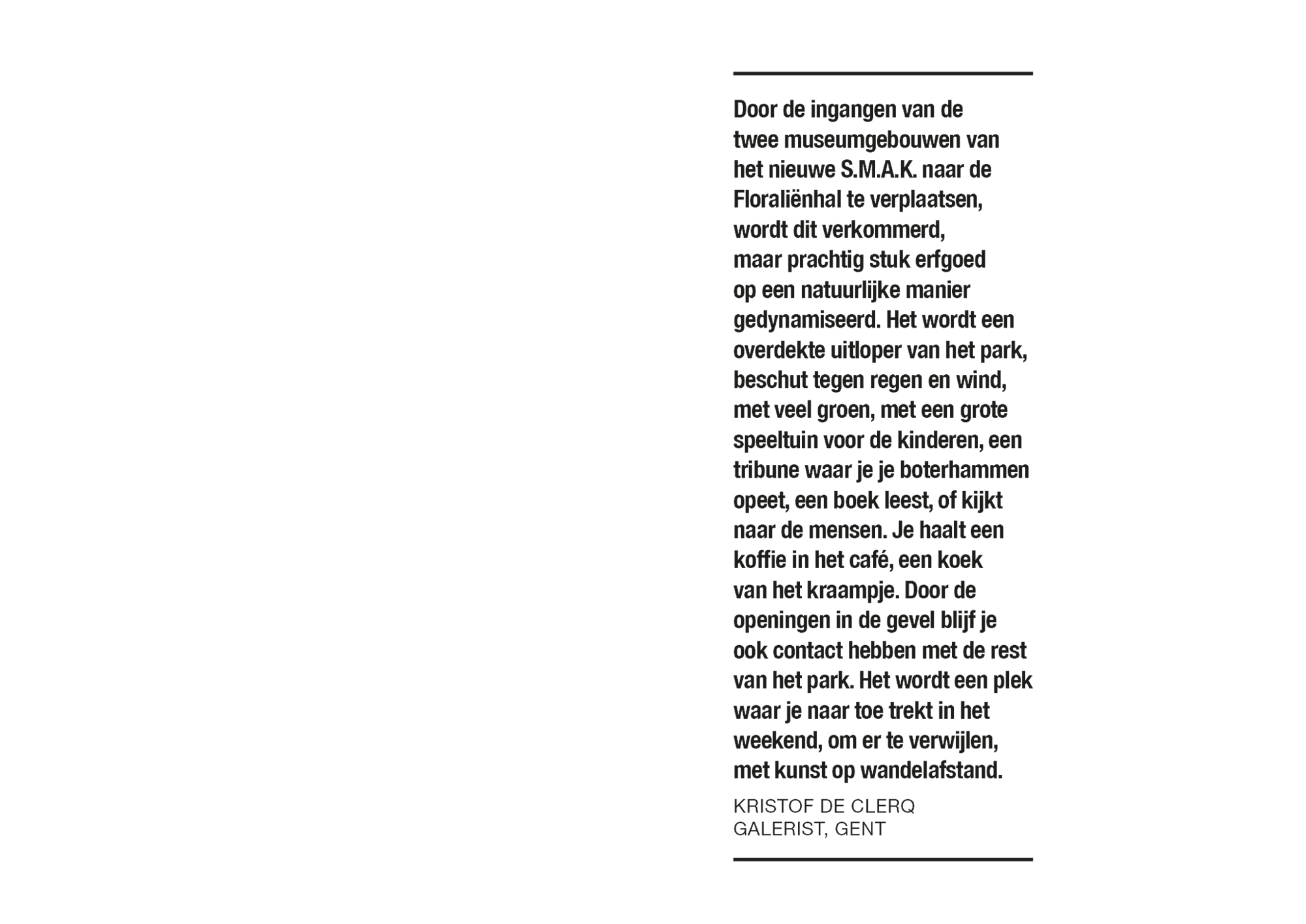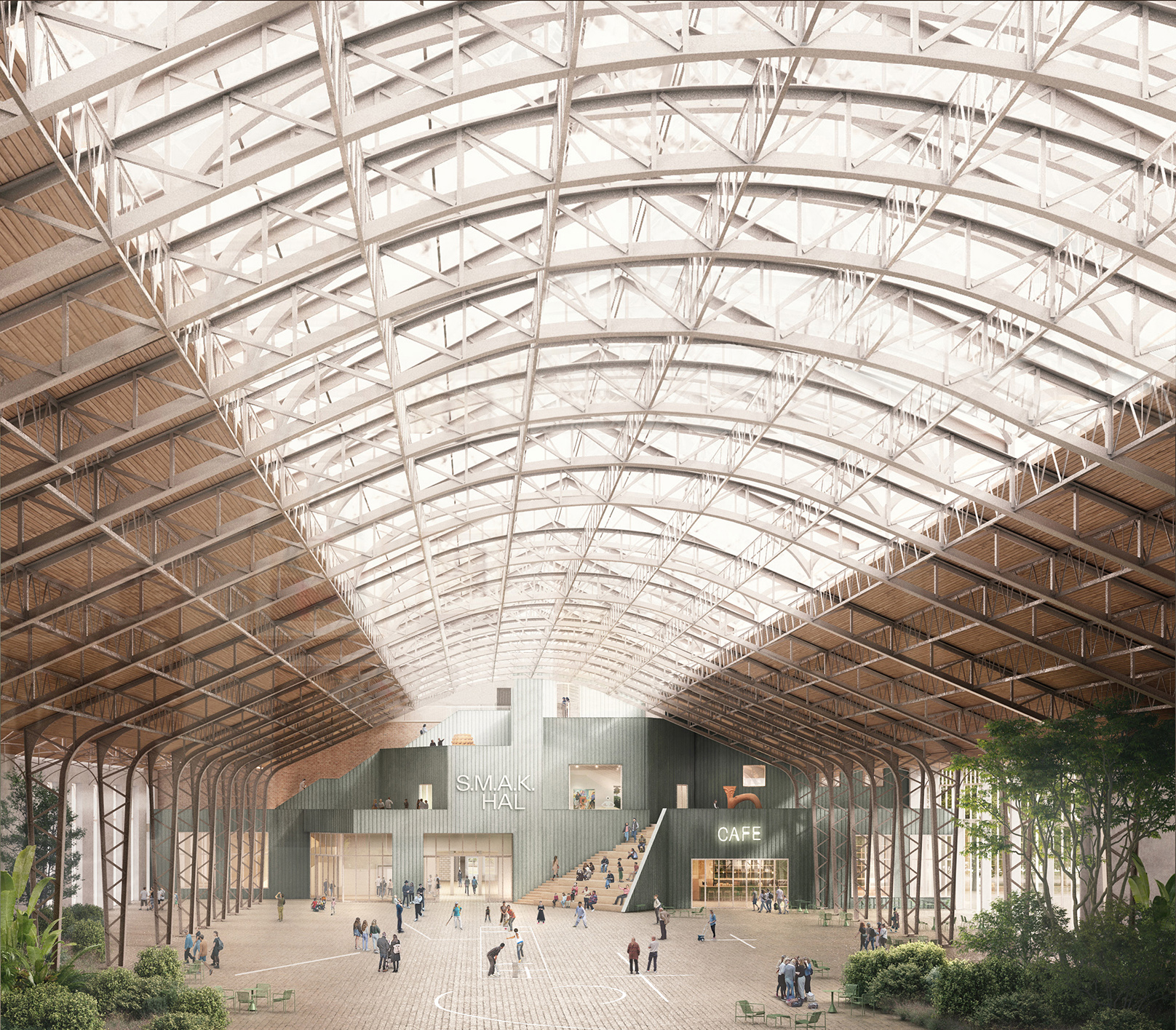 In het masterplan wordt de Floraliënhal deel van het Citadelpark en zijn de gebouwen te gast in het park. Het nieuwe, dubbele museum wordt terug betreden vanuit deze hal zoals in 1913 tijdens de Wereldtentoonstelling, toen de kopse paviljoenen erop geënt waren. De monumentale hal was toen in scène gezet als een buitenruimte, als een reusachtige serre. Willen we deze hal echt naar waarde schatten, dan moeten we haar niet alleen materieel-restauratief herstellen maar haar ook deze rol teruggeven. Het is een radicale omkering van het S.M.A.K., maar een evidente transformatie voor de Floraliënhal.