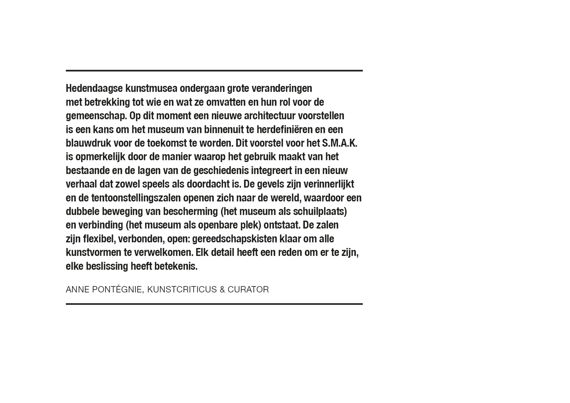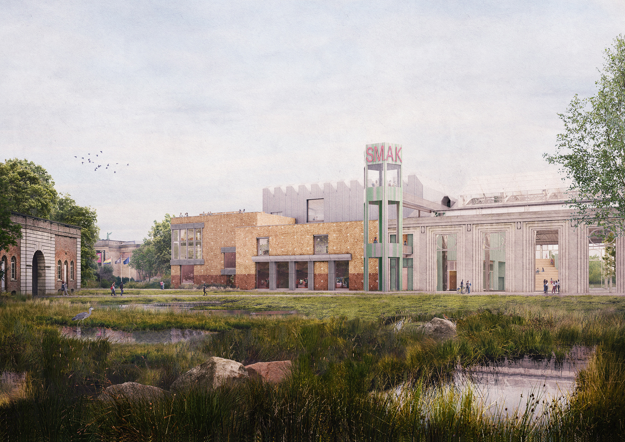Het nieuwe S.M.A.K. wordt gemaakt van het oude. Alle materialen van de afbraak blijven ter plaatse voor de bouw van het nieuwe S.M.A.K. De structuren blijven behouden, worden ontdaan van hun bakstenen huid, op de juiste manier geïsoleerd en terug aangekleed. De heropbouw van de gevels biedt de mogelijkheid om de uitstraling van het museum te herdefiniëren, om de afstandelijke symmetrie en formaliteit te vervangen door een speelser karakter. De markante materialen, zoals de decoratieve blauwe hardsteen en de bas-reliefs, worden gebruikt om nieuwe gevels of ‘gezichten’ te creëren, die inspelen op de nieuwe benaderingen van het museum.