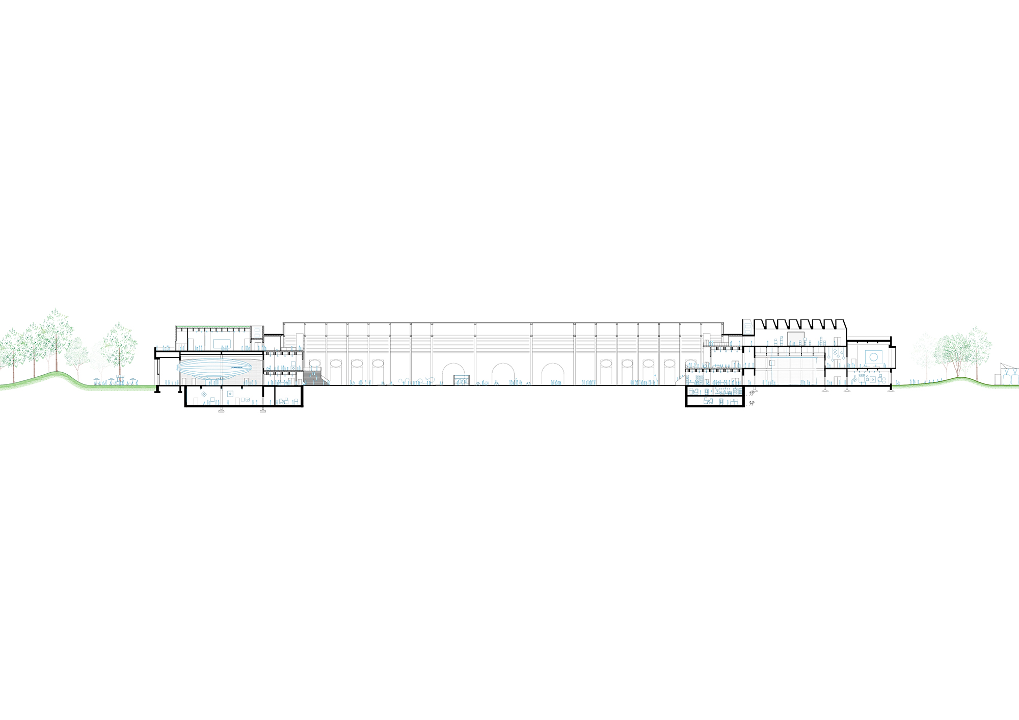 Het volledige nieuwe gezicht dat we tweemaal bouwen in de Floraliënhal is in vele opzichten verschillend van het bestaande gebouw. Het is een tweevoudige verderzetting van het landschap en biedt de bezoeker van de hal betreedbare topografieën zoals deze ook in het park aanwezig is. Bovenal is de nieuwe gevel informeel, vrij qua vorm. Drempelverlagend. Je stapt zo binnen.