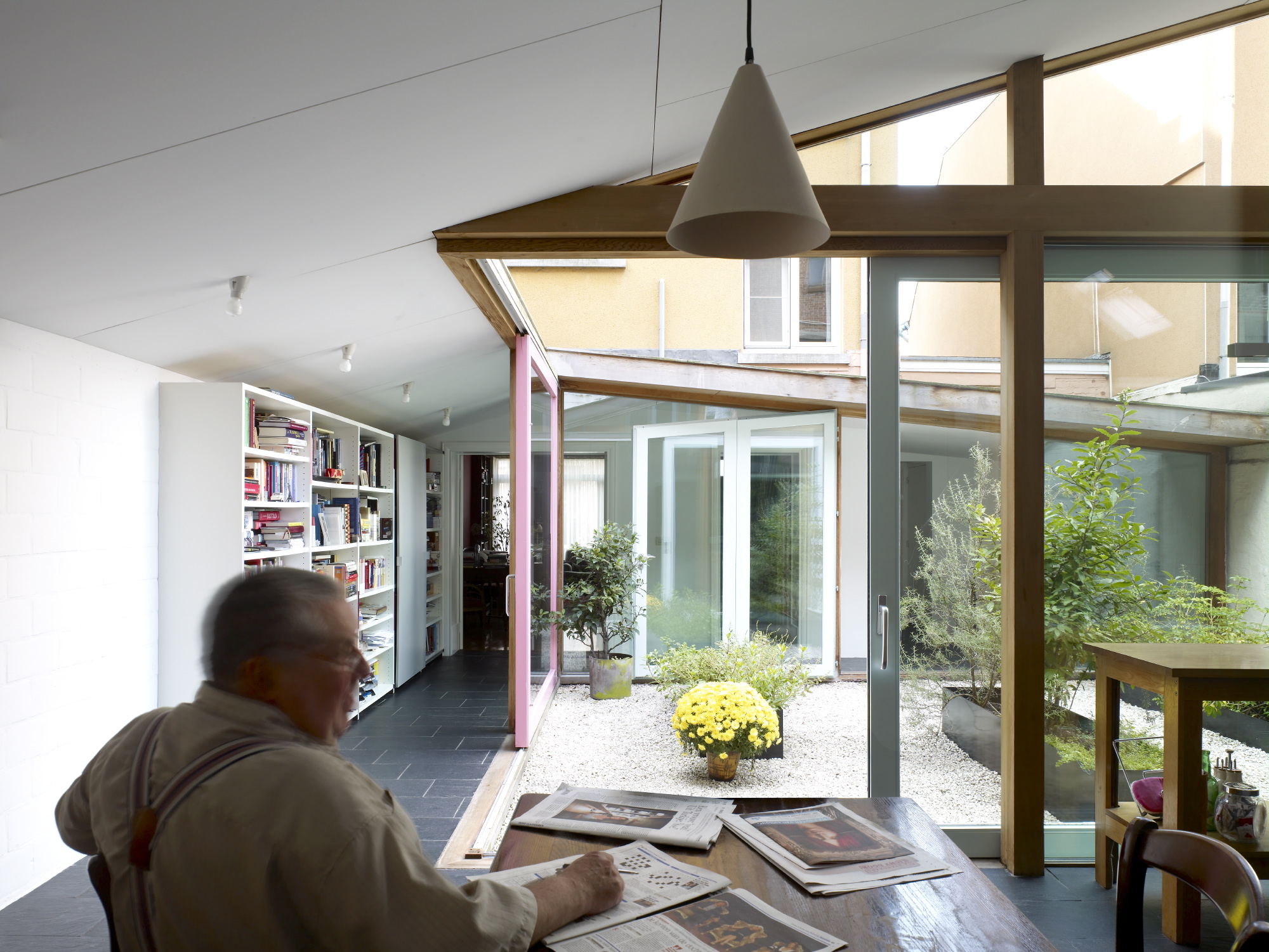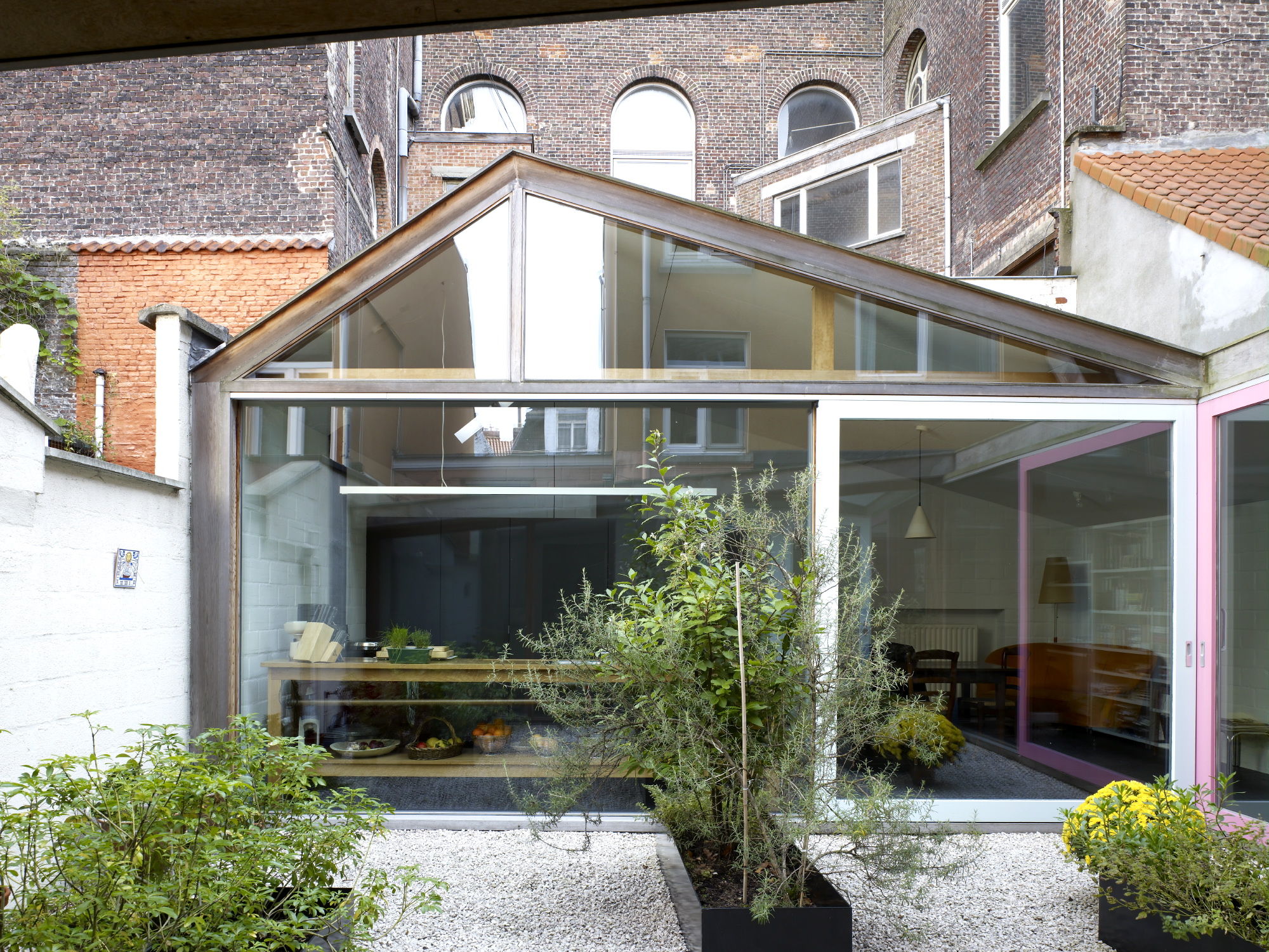 The new volume does not locate the kitchen directly adjacent to the rear of the house but at the back of the garden. The entire surface of the small plot becomes tangible and usable. An outdoor room is included in the succession of rooms. Maximum light ingress is achieved in existing and new spaces.