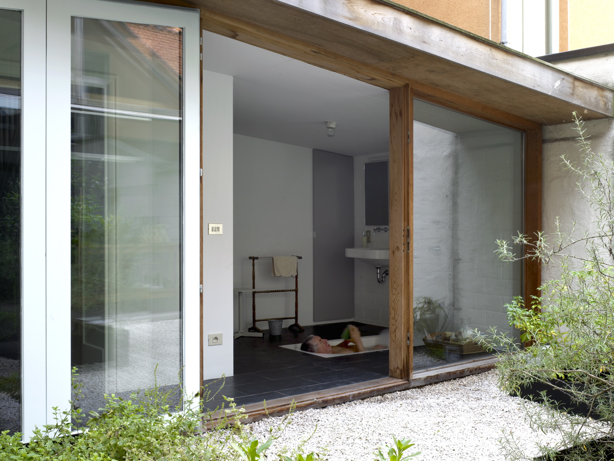 The bathroom connects to the existing house and enjoys a view of the outdoor space. A bathtub is sunk into the ground, a wooden platform on top of it makes it usable as an open shower. The connection between the house and the kitchen is furnished with a library cabinet and a small work table.
