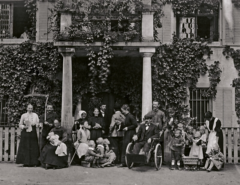 (Children’s voices drift in and out; a stroller rolls over the paving)