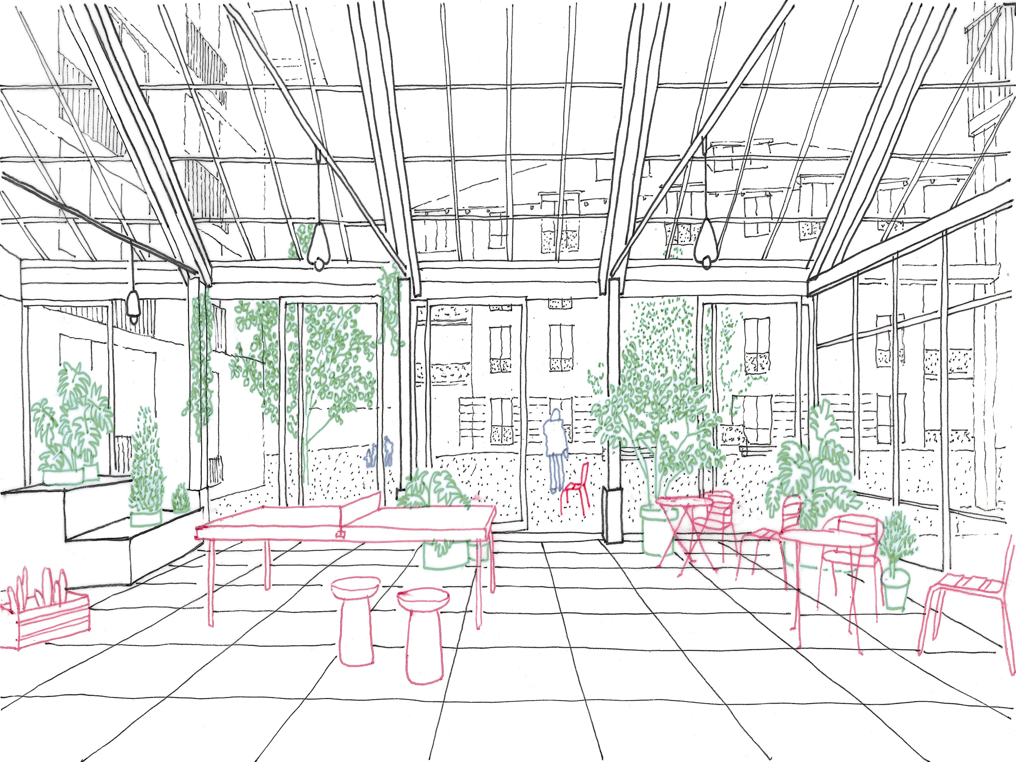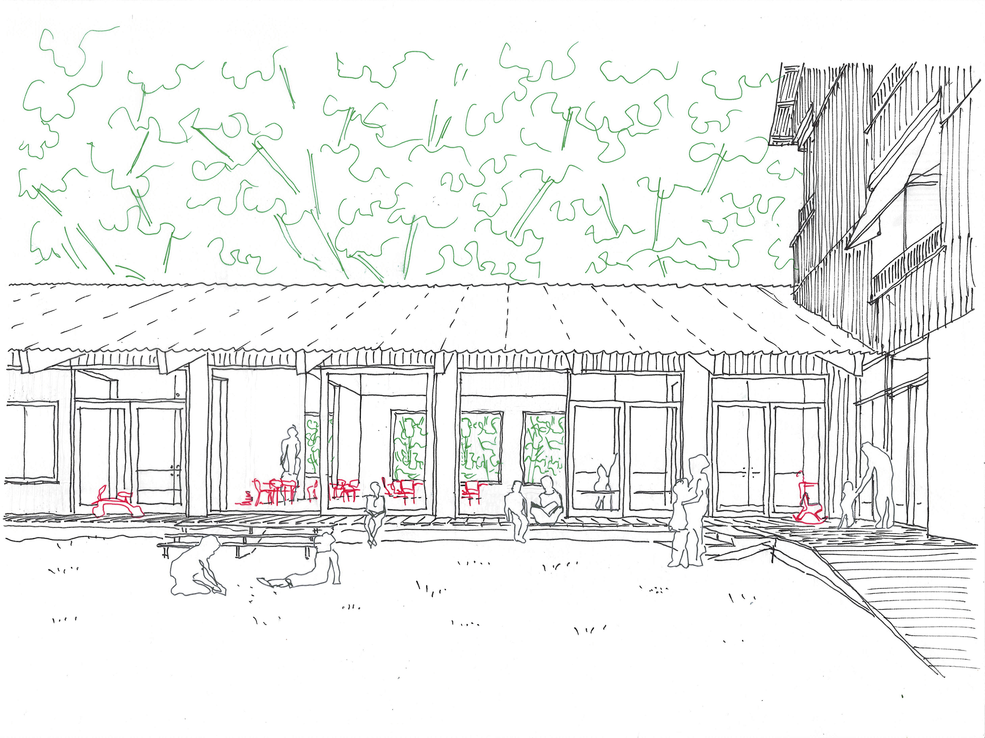 VSa: And then there’s the other centre — the park. Not paved, but soft. Community here happens between the buildings.