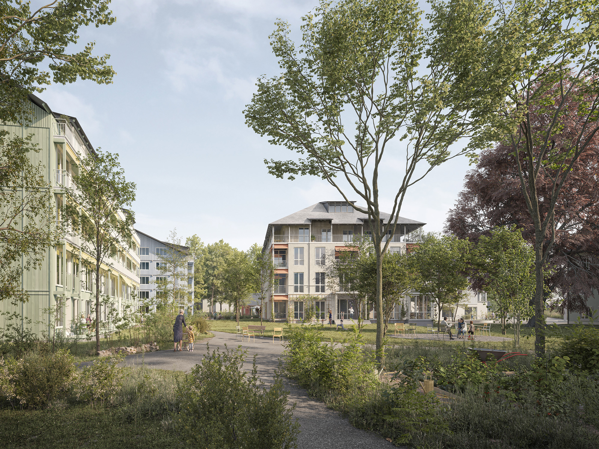 Caring community combining residential development with adaptive reuse of existing buildings and complementary public functions