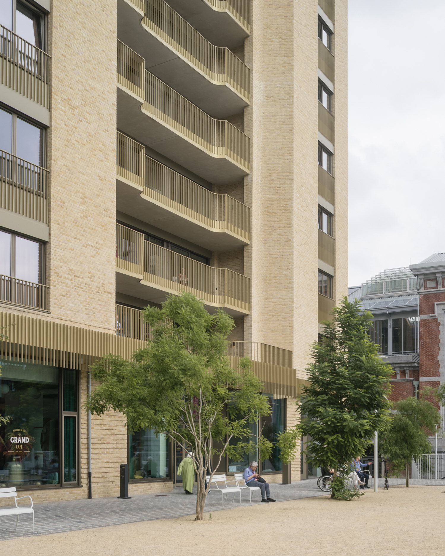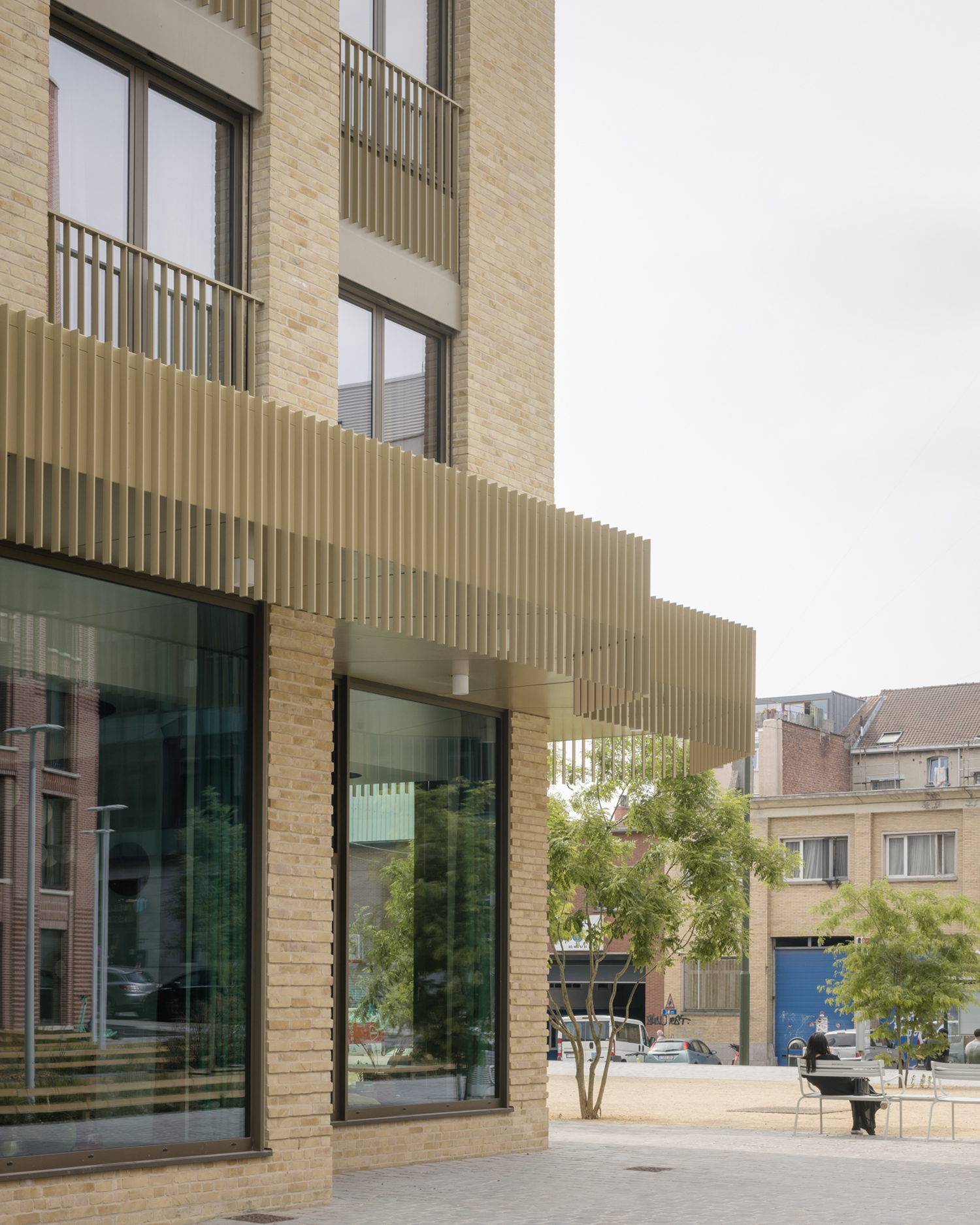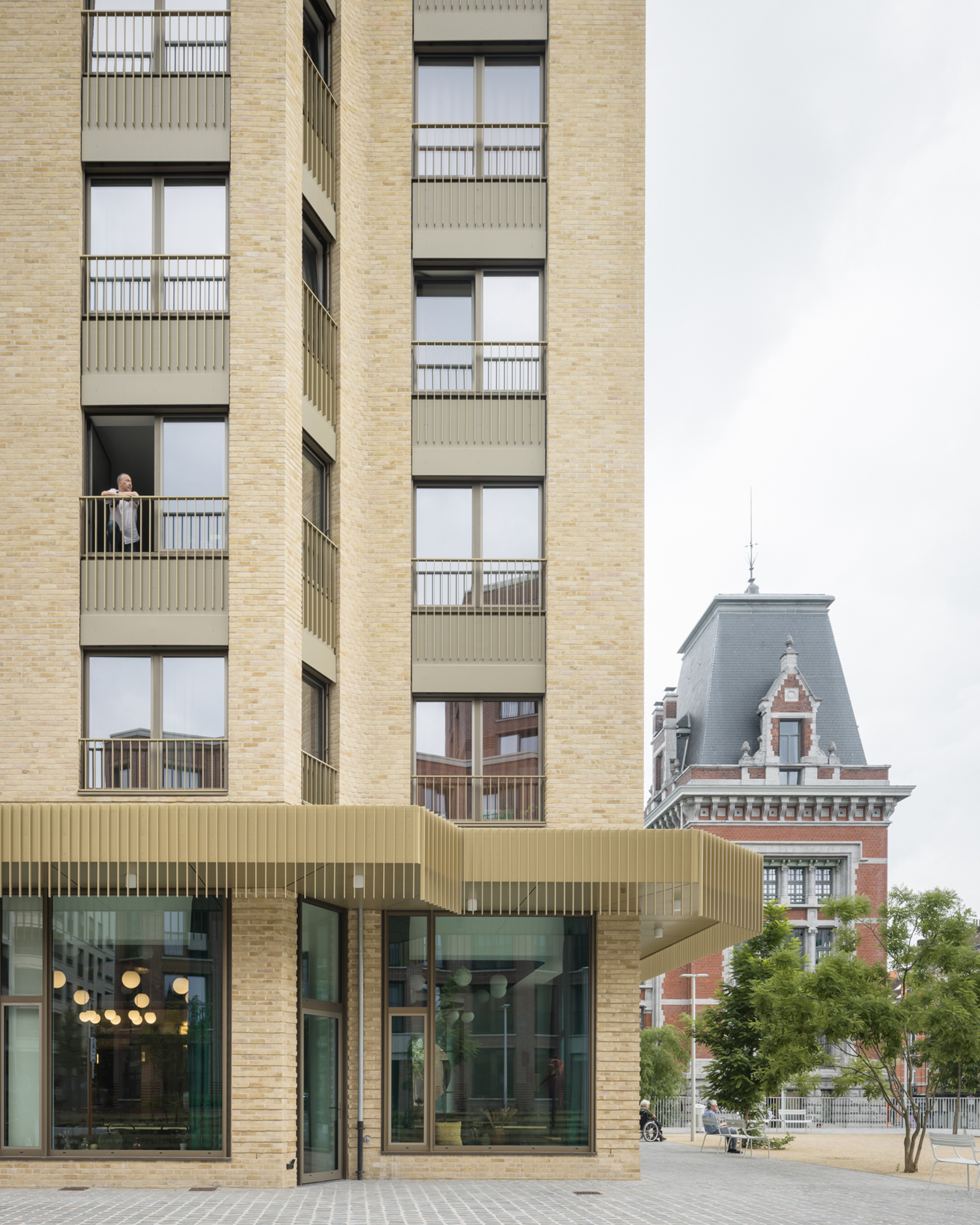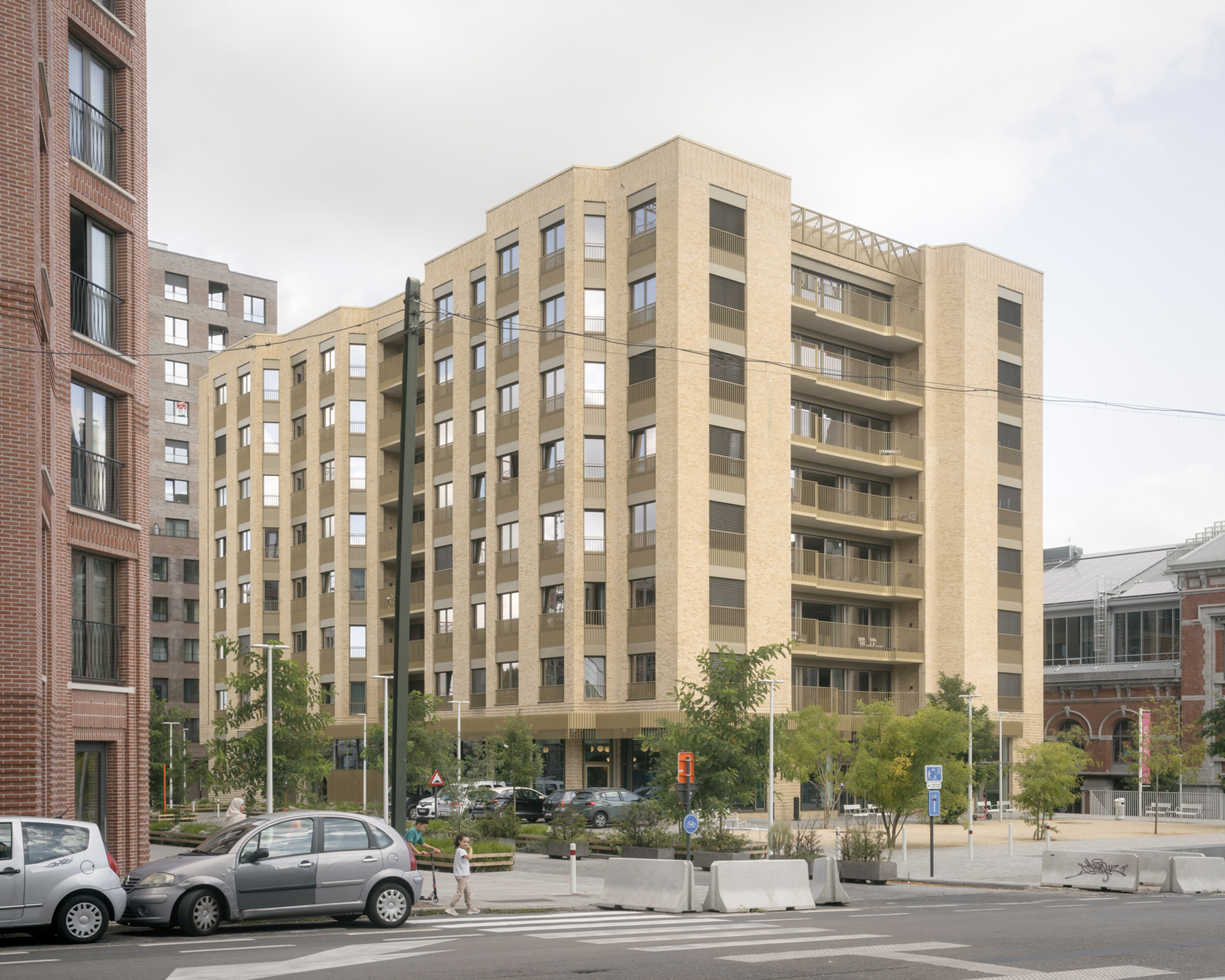 S1 is a compact, seven-storey residential care building, the first in a row of five ‘solitaires’ that connect the Tour&Taxis quarter with the urban fabric aligning the Rue Picardstraat. By setting the building back from the street, an inviting urban square is created. The residential care centre’s grand café is situated on the ground floor. It adjoins this square and is accessible to everyone.