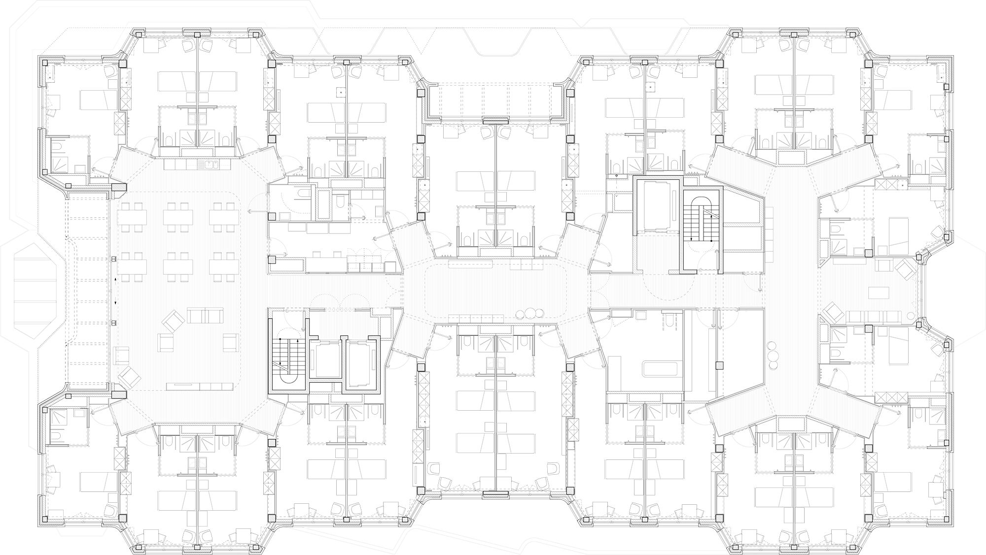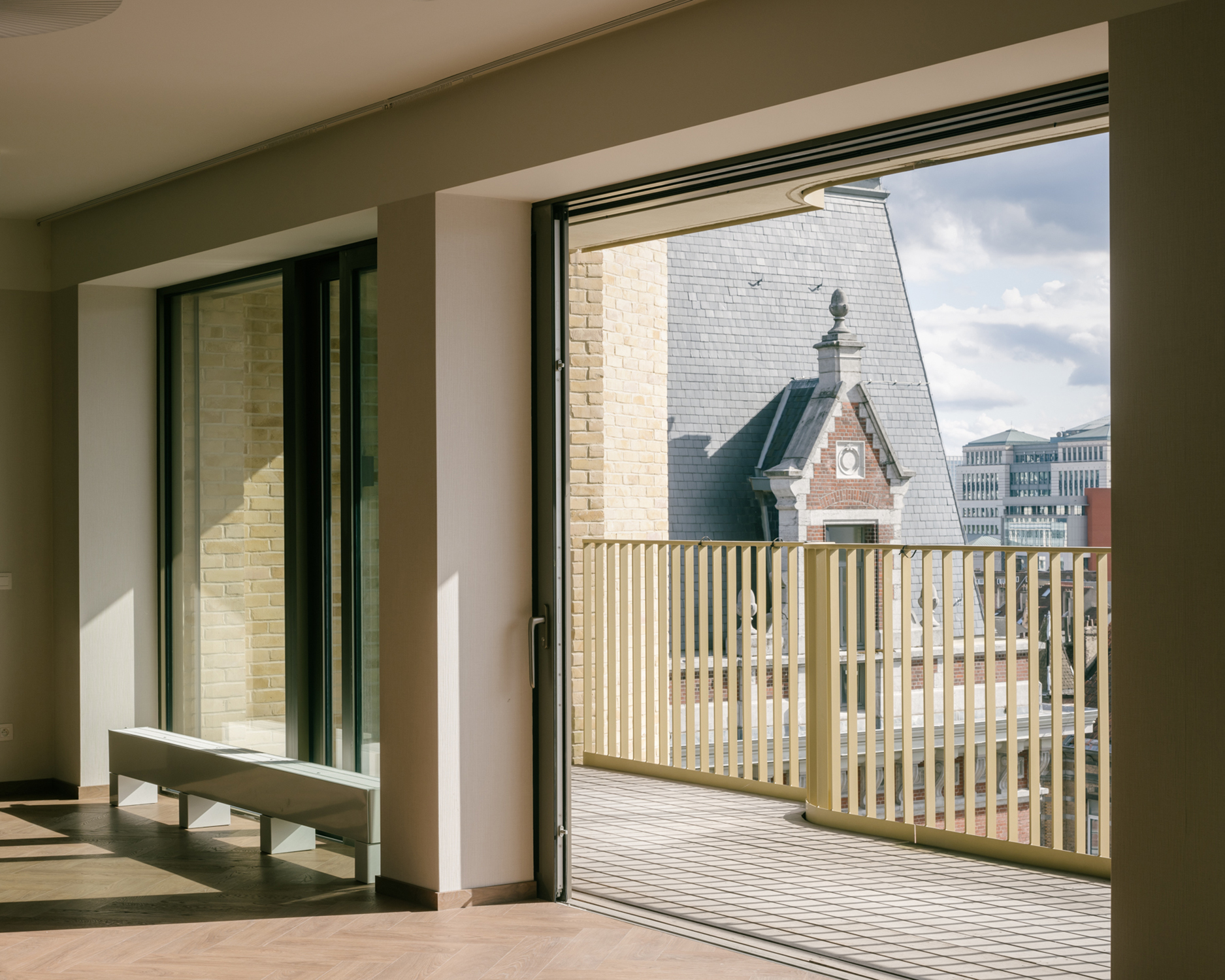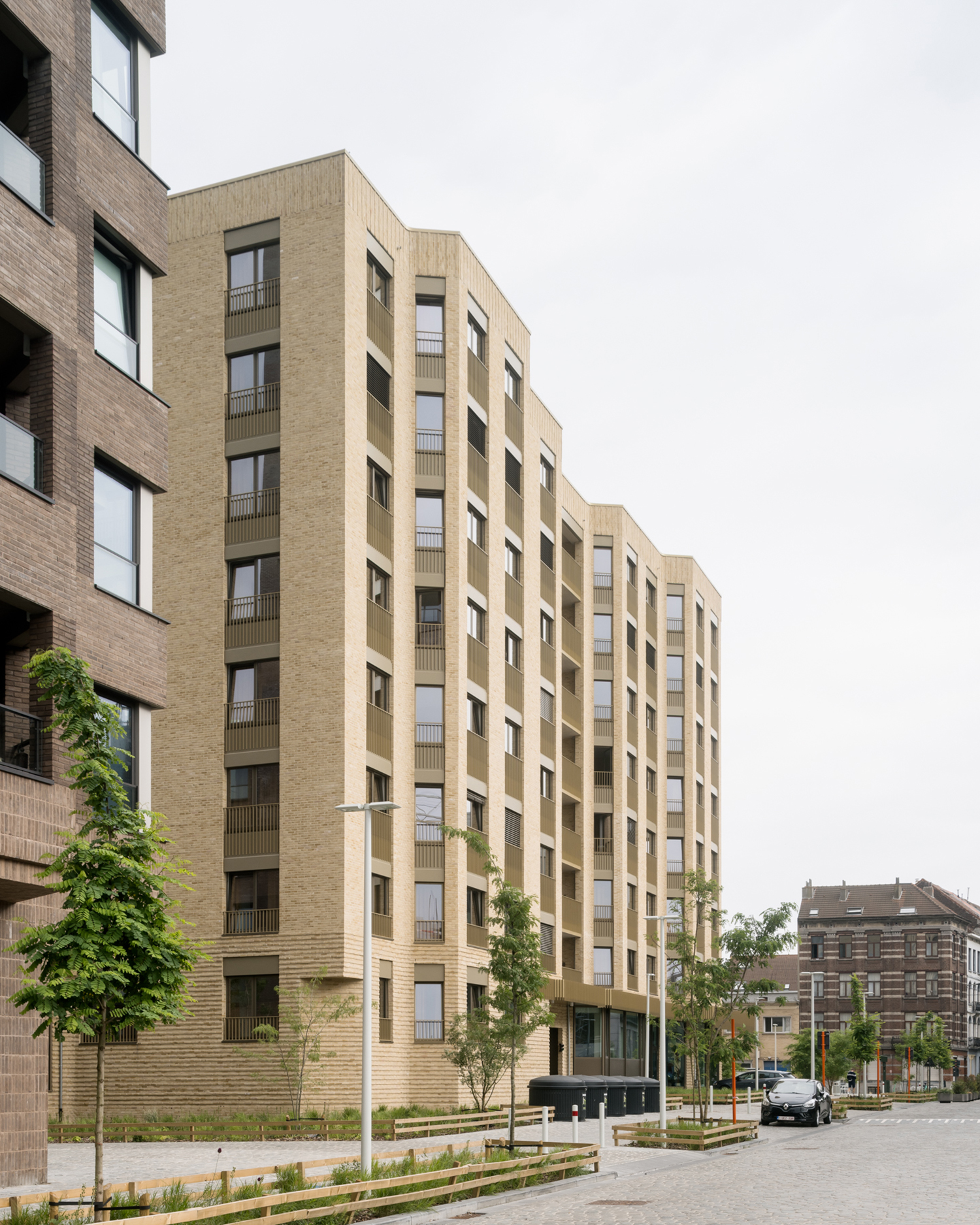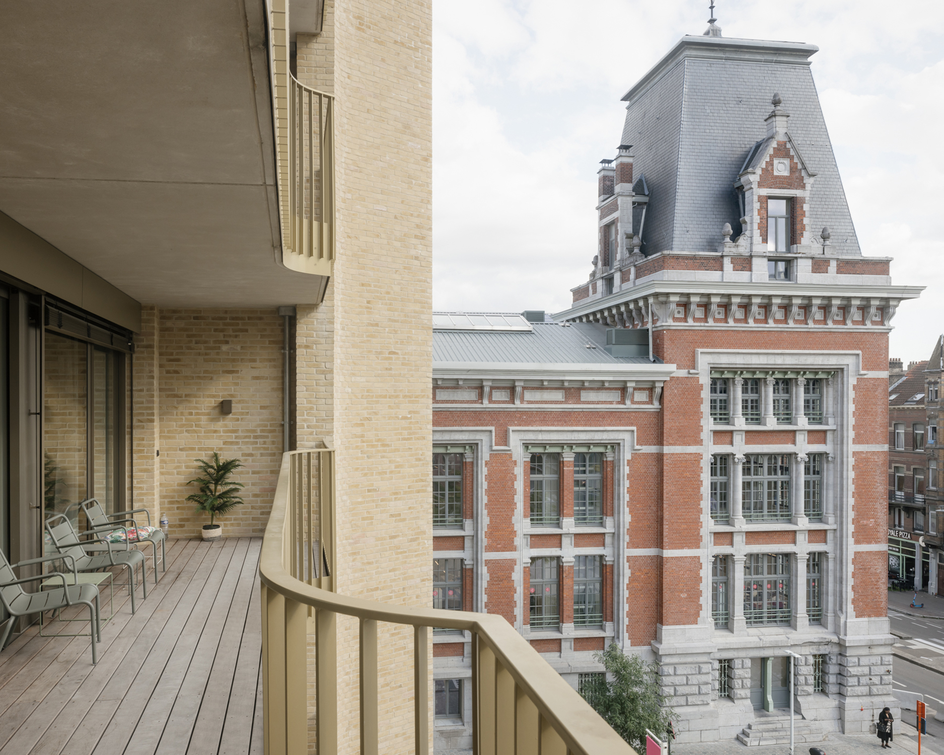 S1 is a compact, seven-storey residential care building, the first in a row of five ‘solitaires’ that connect the Tour&Taxis quarter with the urban fabric aligning the Rue Picardstraat. By setting the building back from the street, an inviting urban square is created. The residential care centre’s grand café is situated on the ground floor. It adjoins this square and is accessible to everyone.