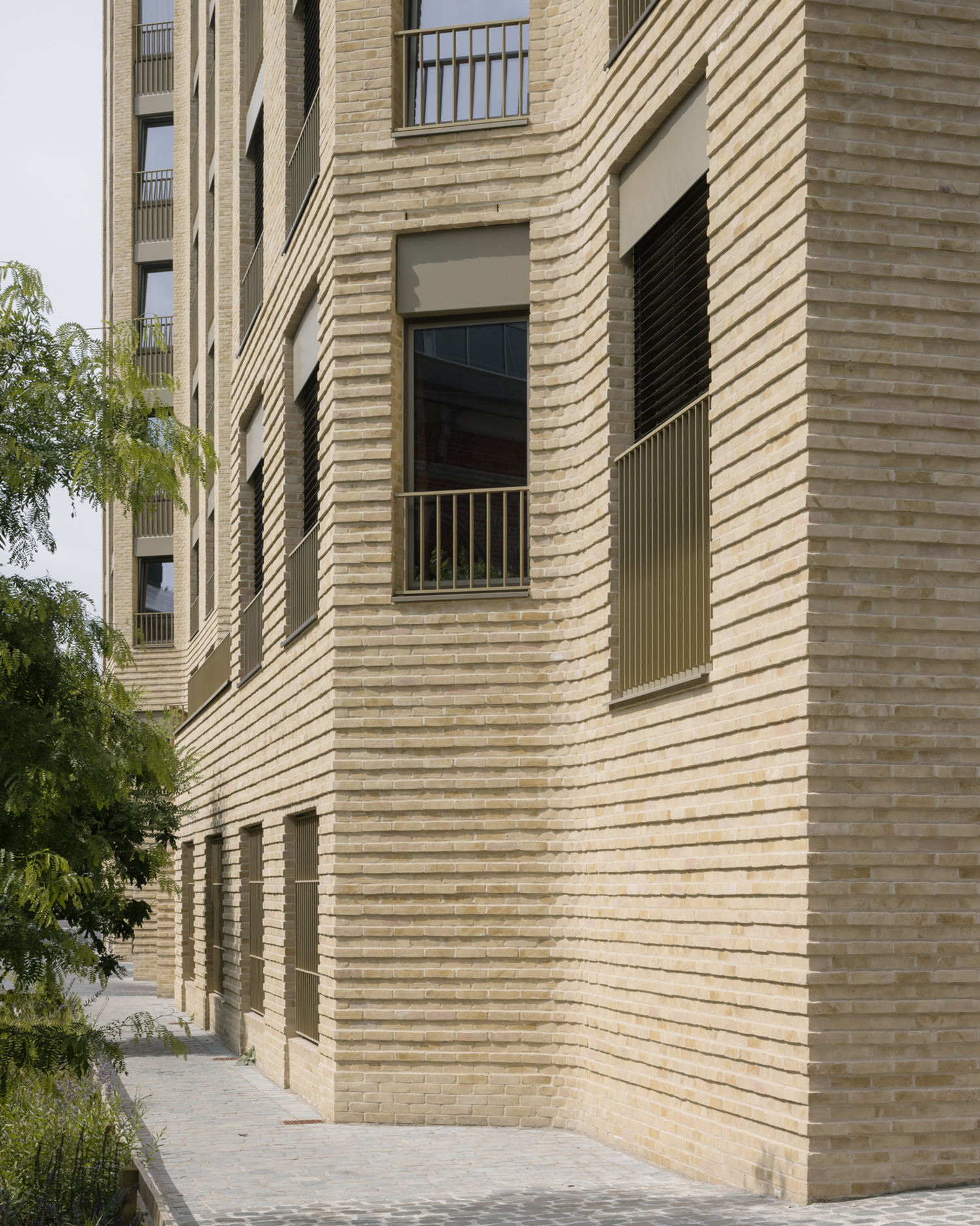 The facades are clad in light beige brick. We reinterpreted the bow window as a construction element that offers a wider view of the public domain from the interior and a structuring feature of the design of the facades, giving them an expressive relief and a strong vertical articulation. All of the metal parts of the façade, such as the awnings, window frames, garage doors and balustrades are made of light bronze-coloured anodised aluminium.