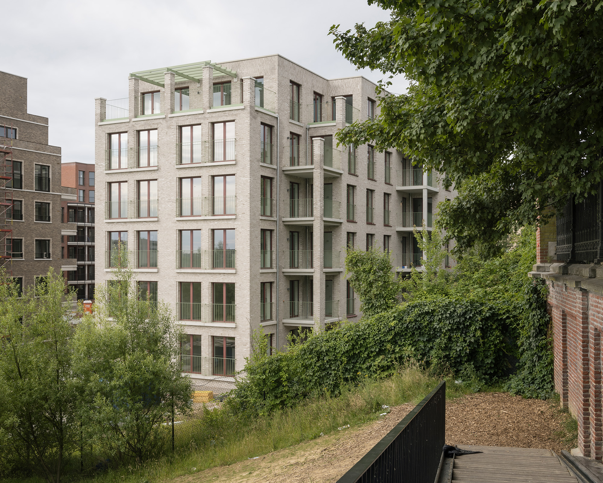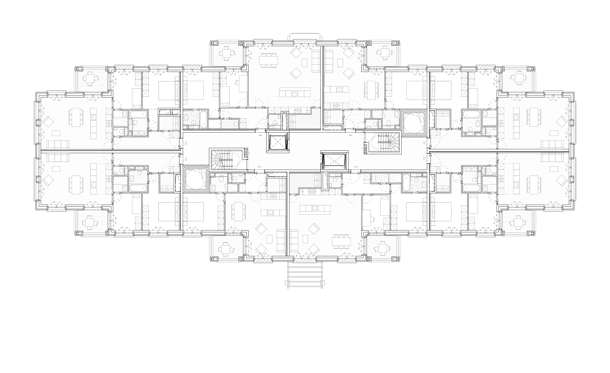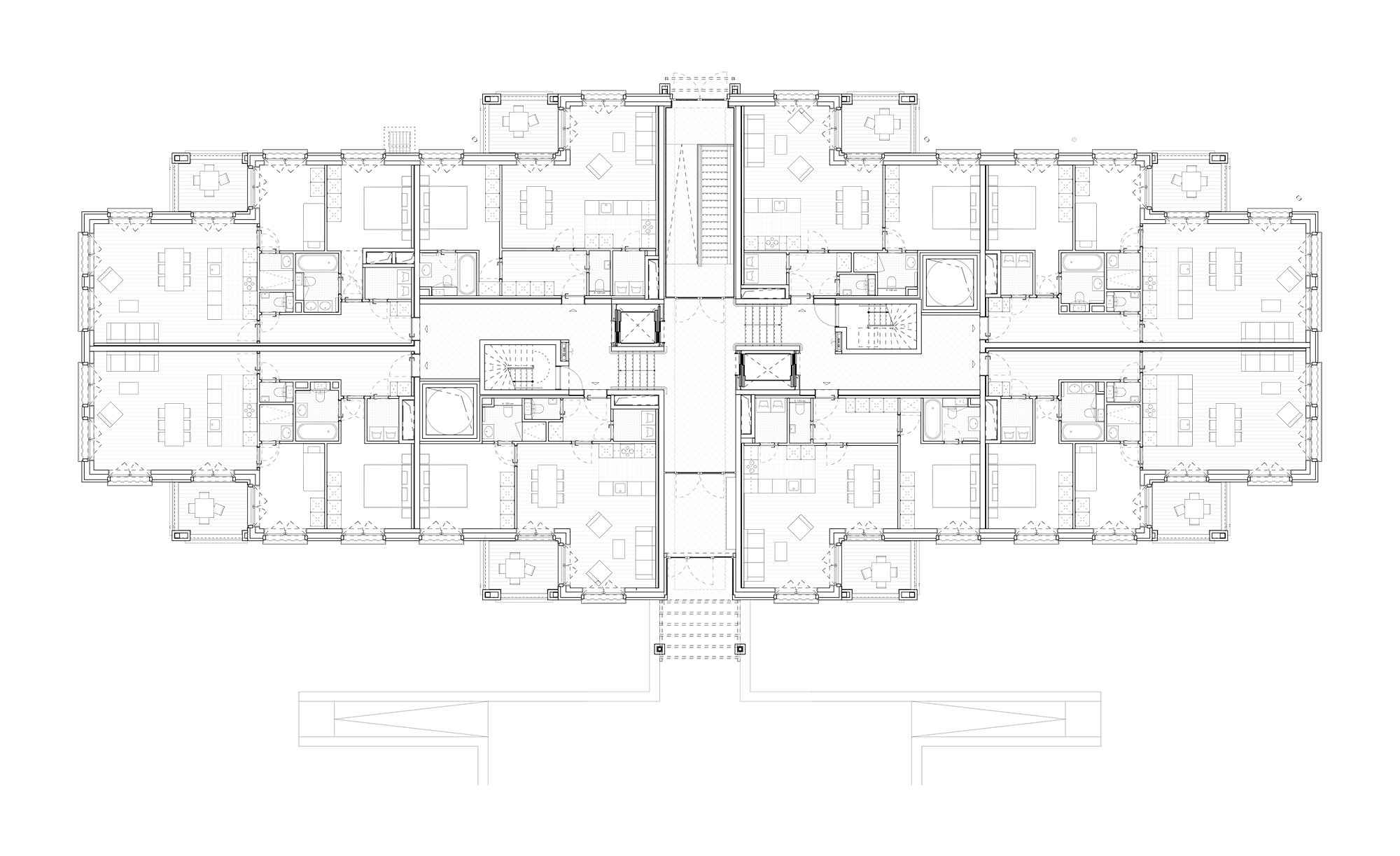 From the main entrance on the ground floor, a gently sloping staircase leads to the communal garden at the rear and the underground bicycle parking area. long communal hall connects the two side wings and distributes all the dwellings on each floor via two vertical circulation routes. Each floor has eight apartments, arranged in an L-shape, with the exception of the upper floors.