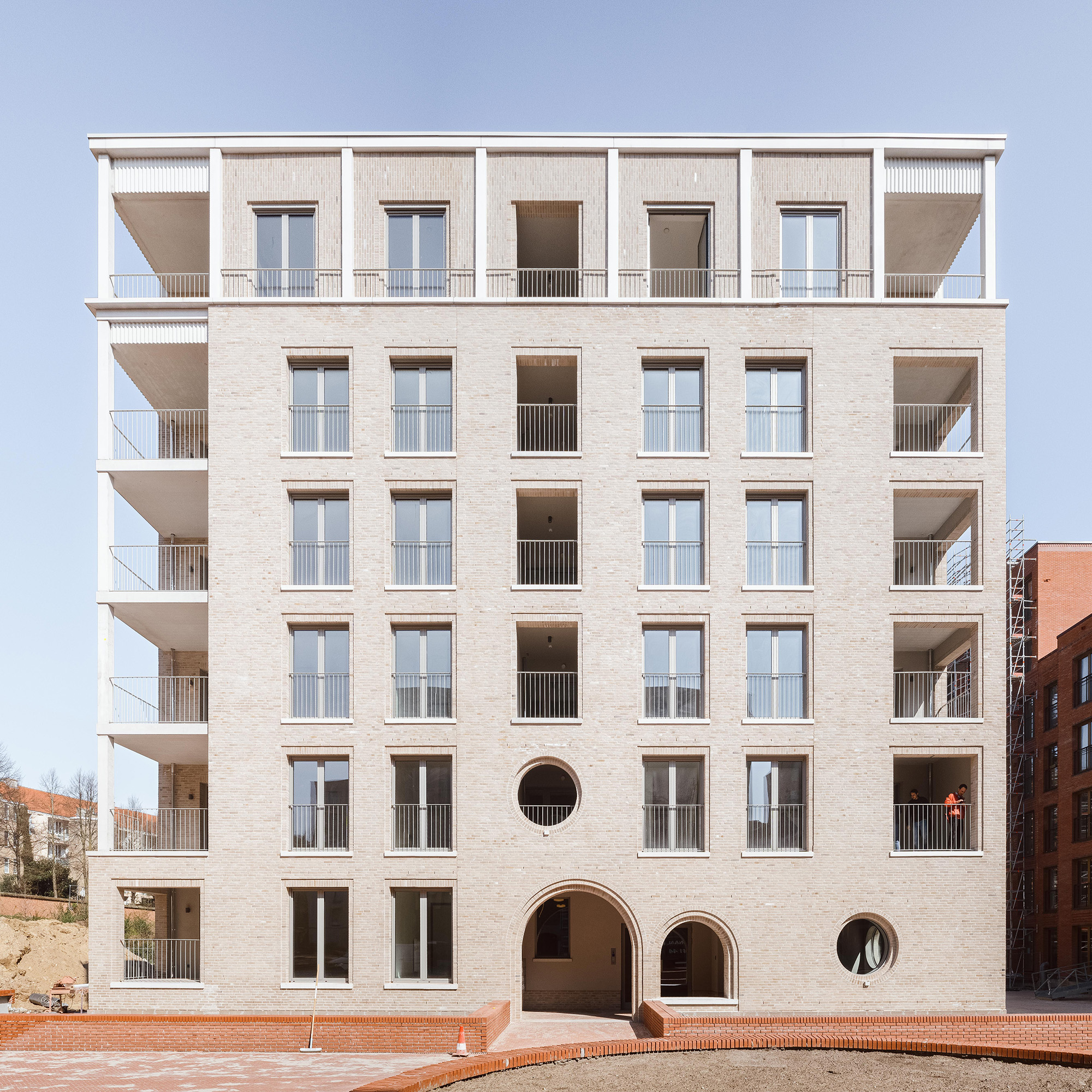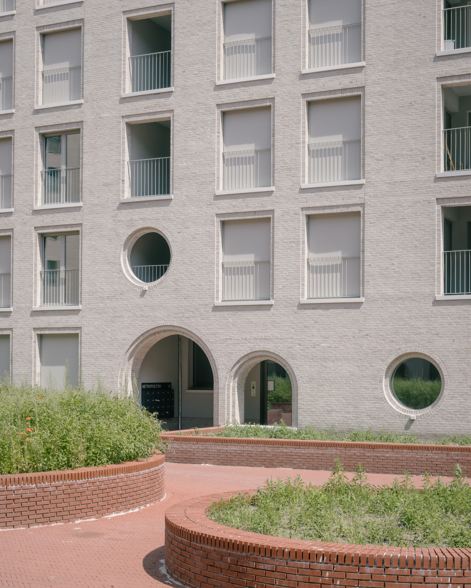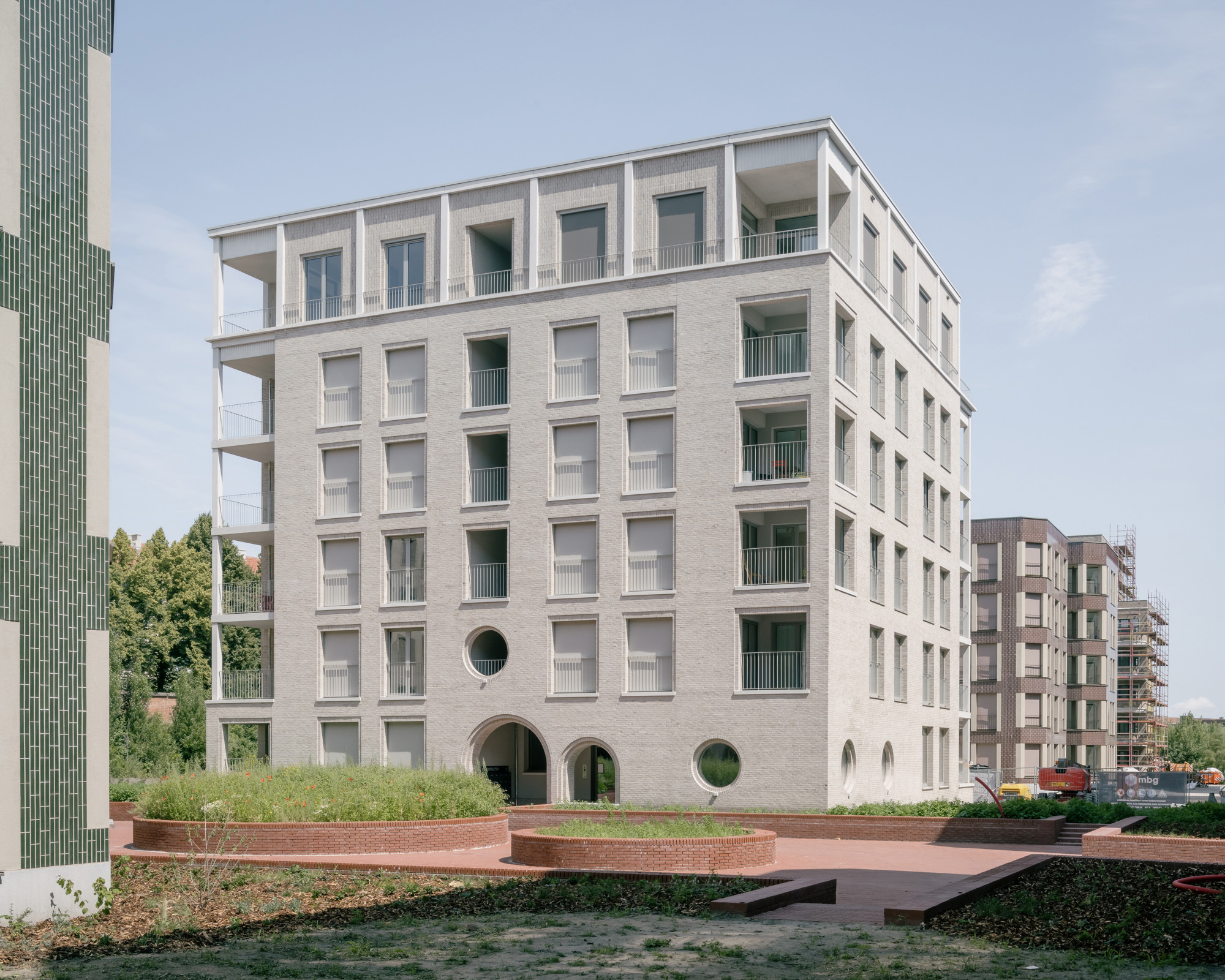 The façades are composed of white-grey brick combined with light grey precast concrete elements. The window frames are made of aluminium in a similar colour.