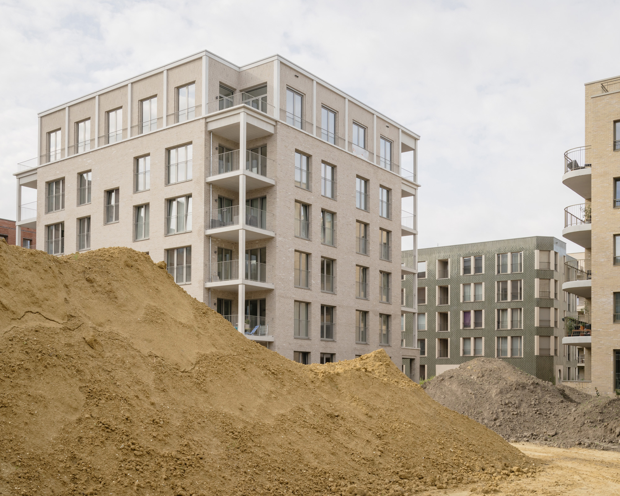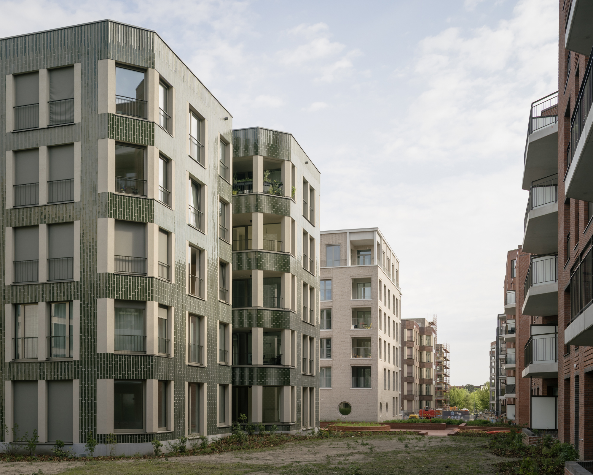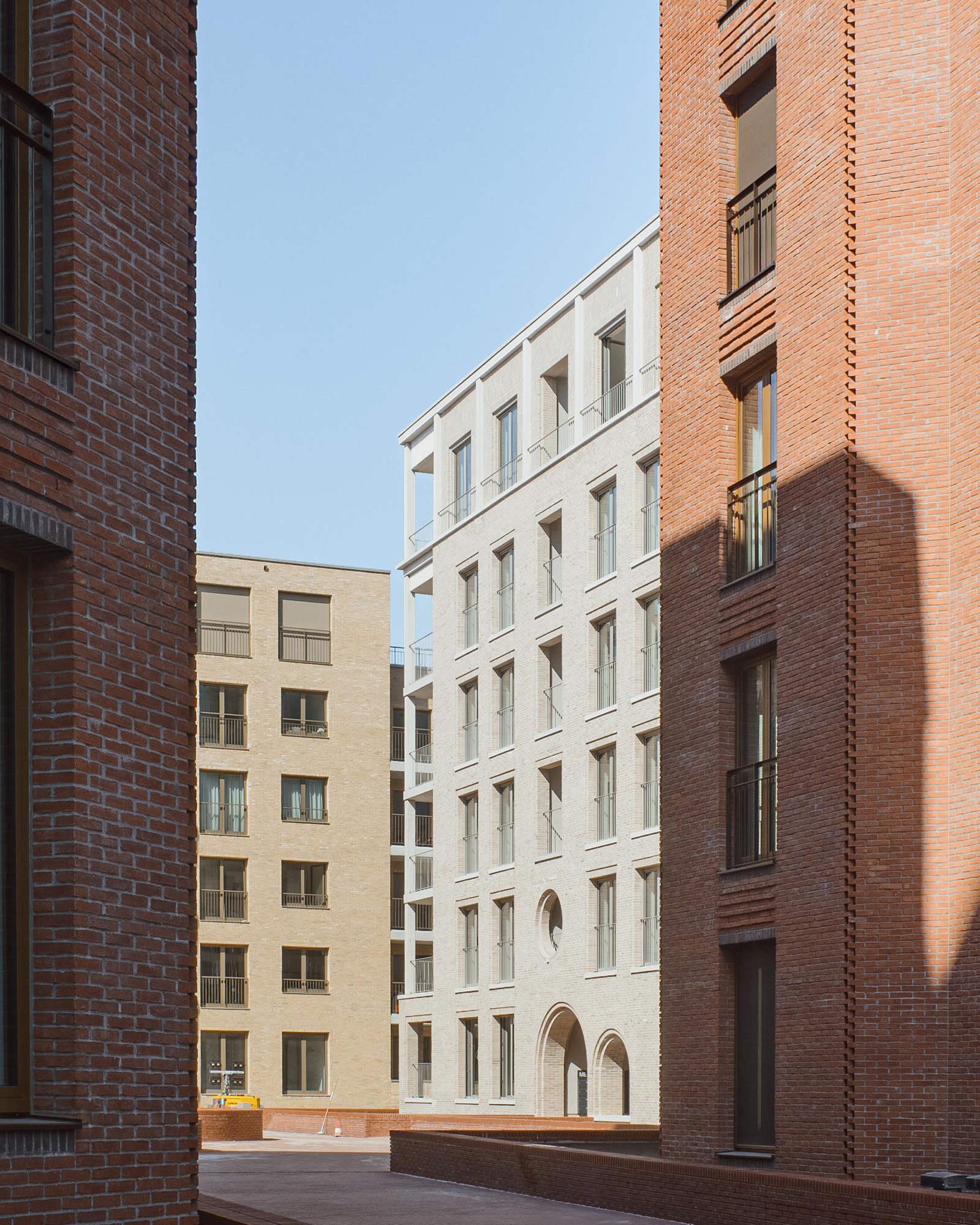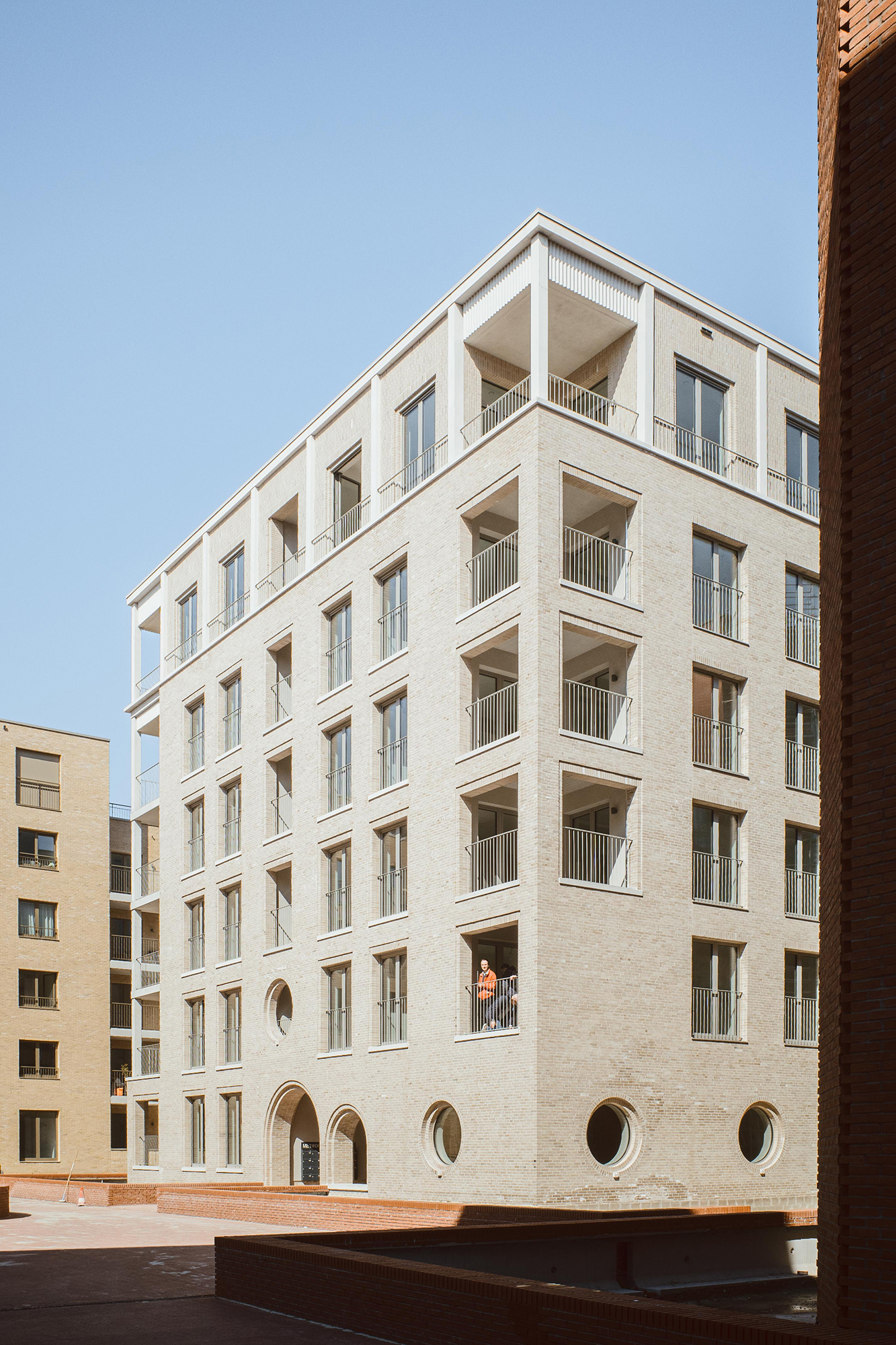 The façades are composed of white-grey brick combined with light grey precast concrete elements. The window frames are made of aluminium in a similar colour.