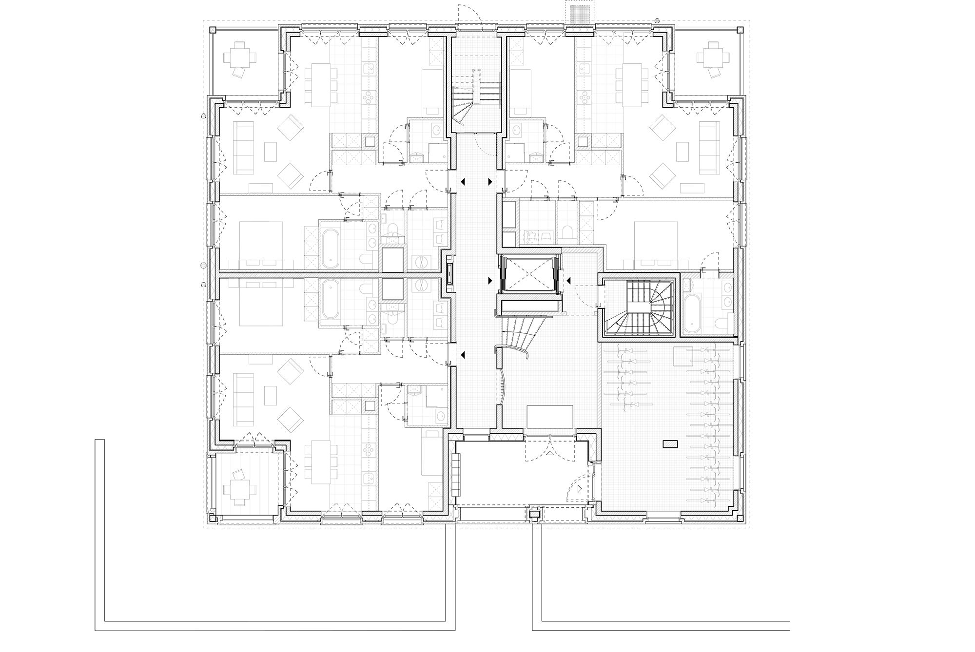 Each floor has four corner flats. These all have a loggia, which is positioned on the corner of the building and offers views of the garden.