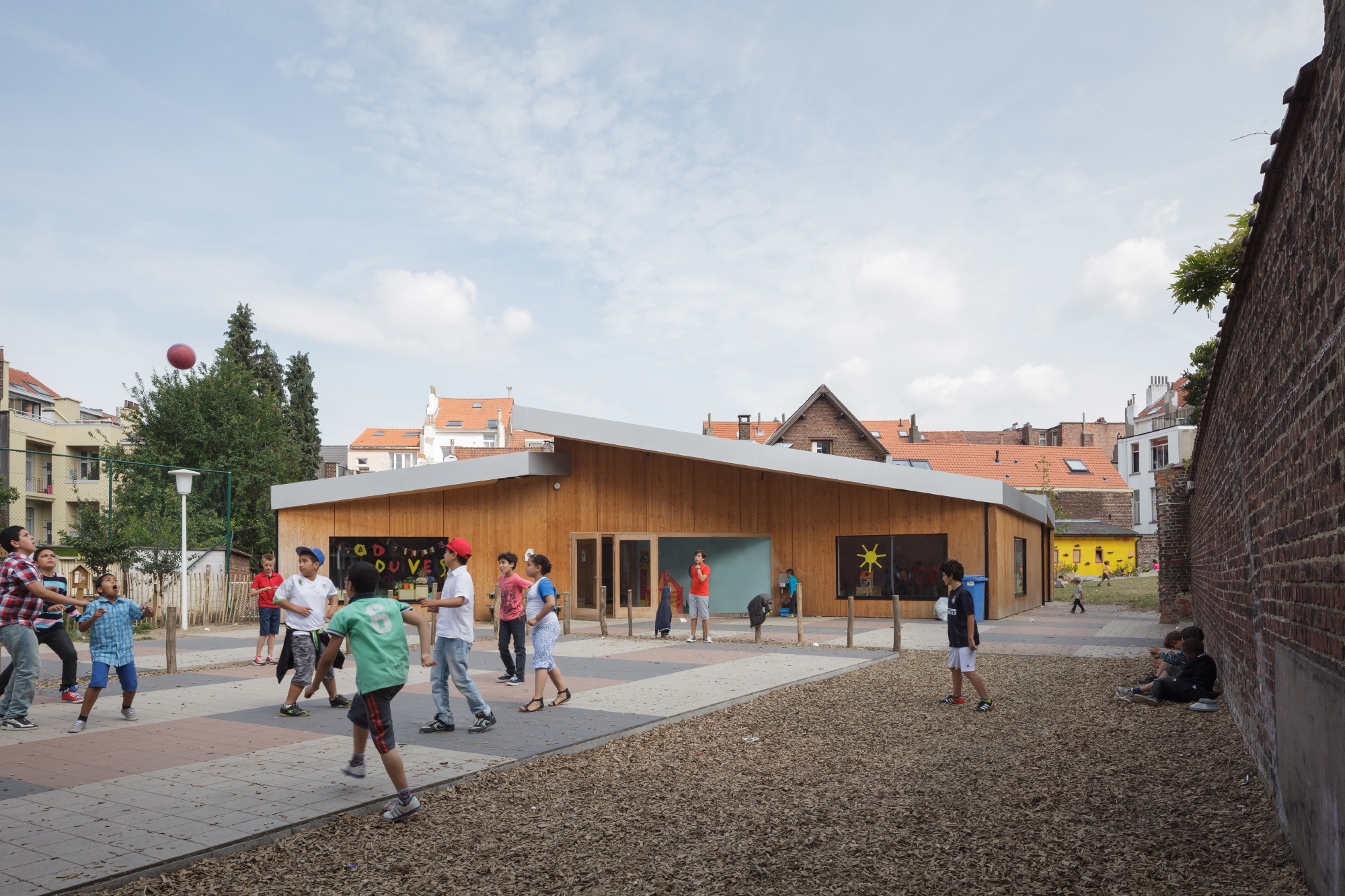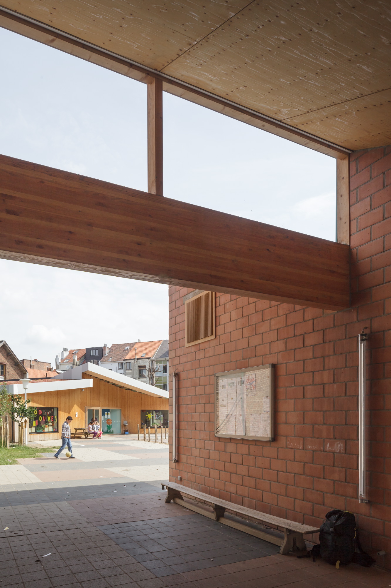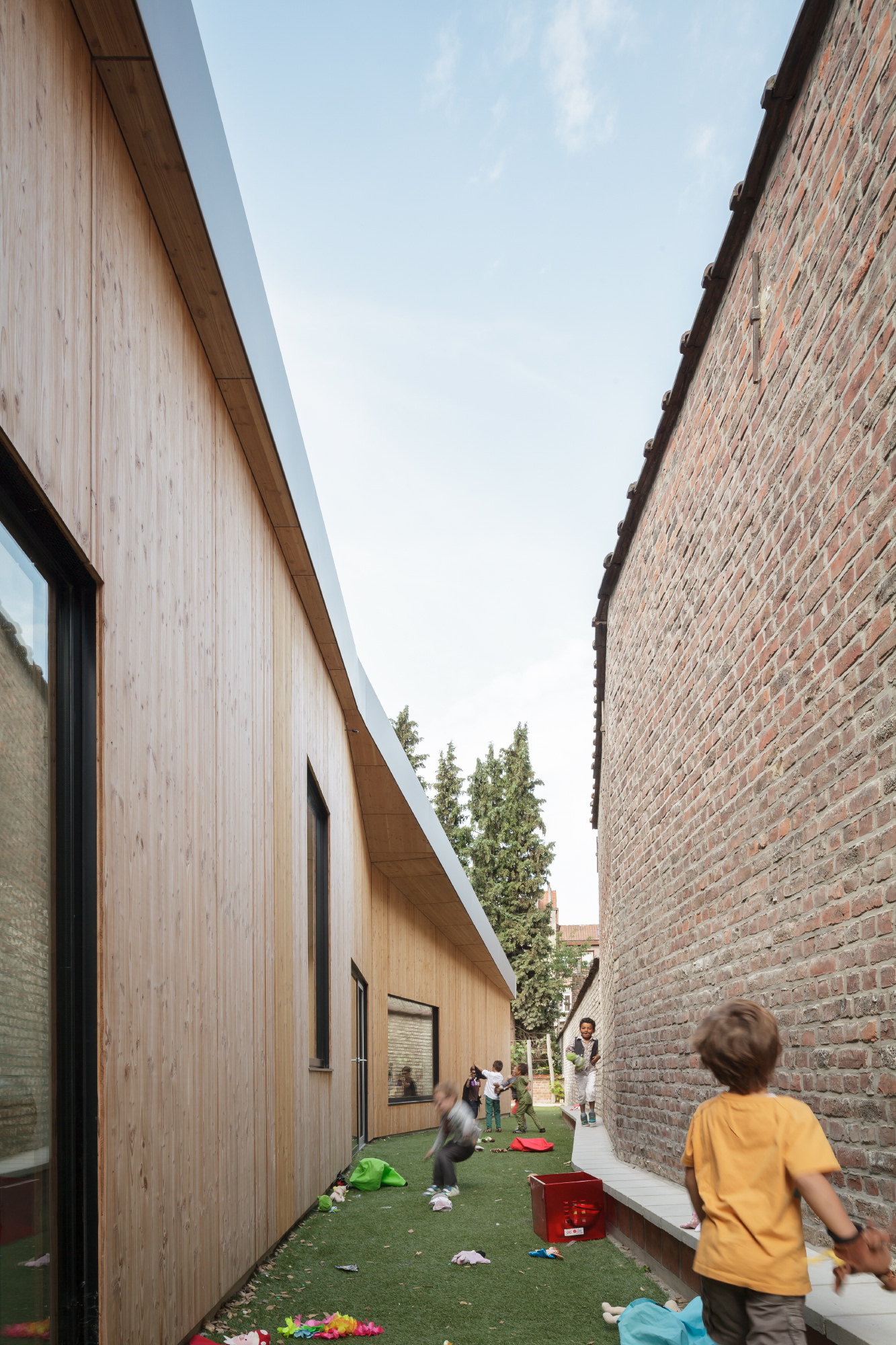 A school in Brussels wanted real classrooms for its infants rather than Portakabins in the playground. The site lies bent between two streets. The primary school stands in a row of houses on one side of the plot and the other side was open and free.