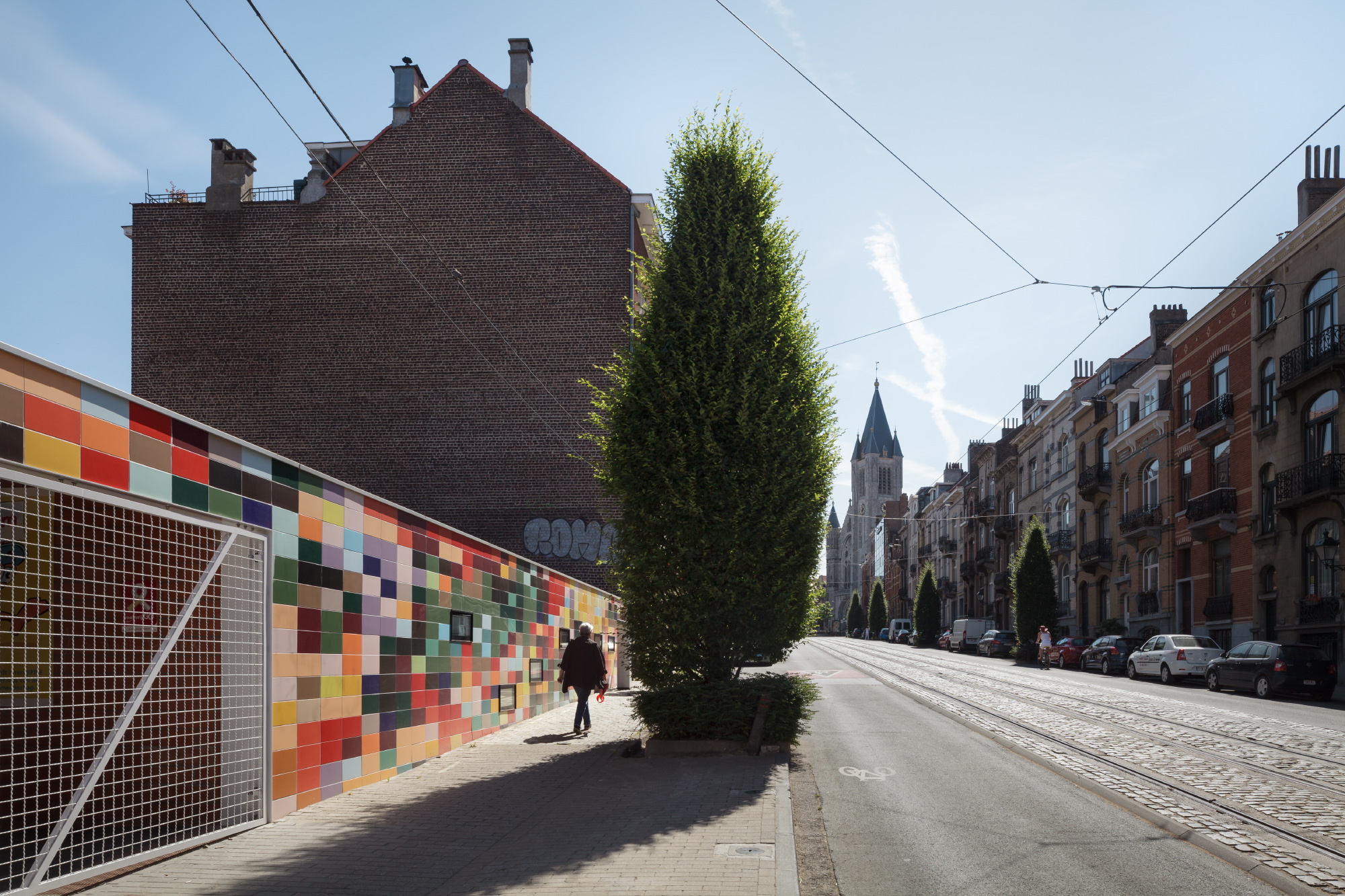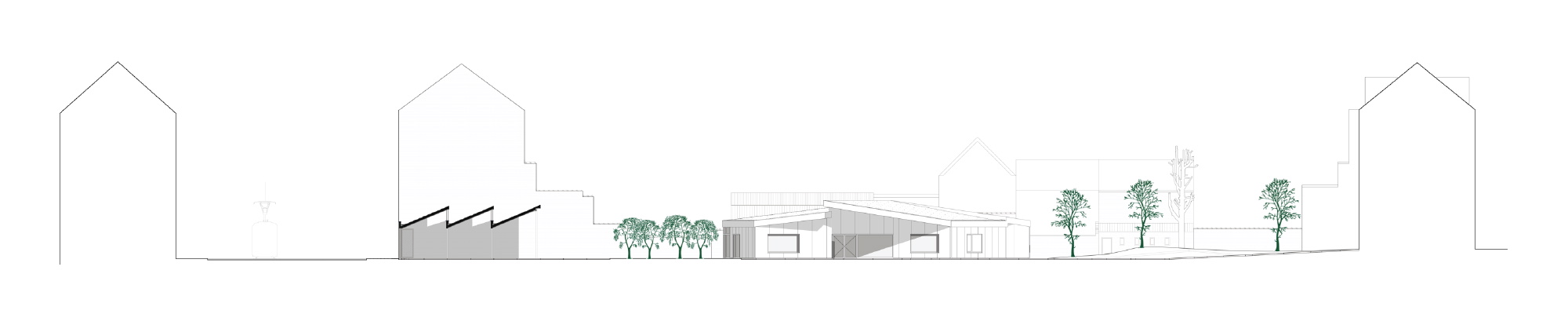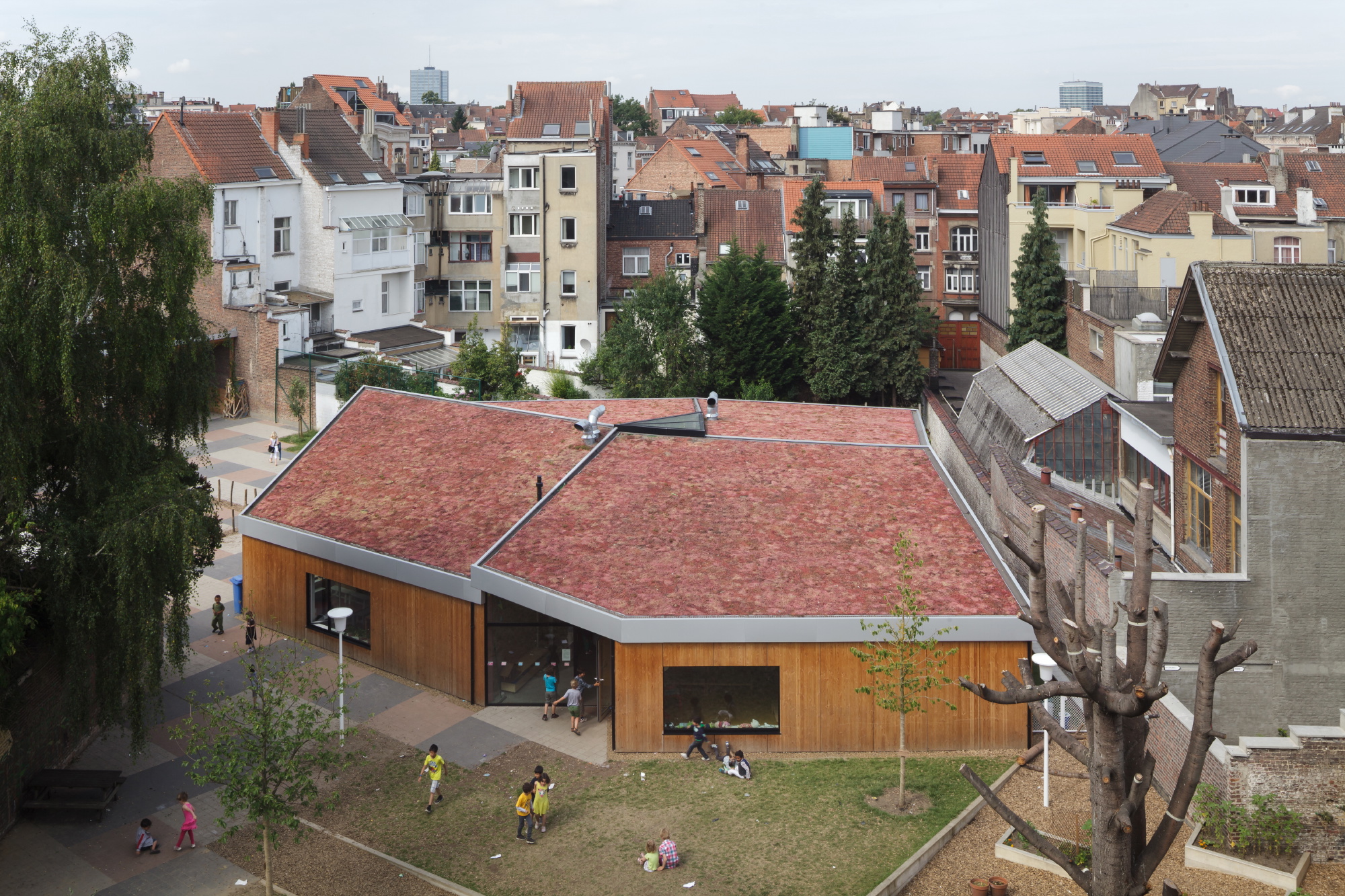 A school in Brussels wanted real classrooms for its infants rather than Portakabins in the playground. The site lies bent between two streets. The primary school stands in a row of houses on one side of the plot and the other side was open and free.