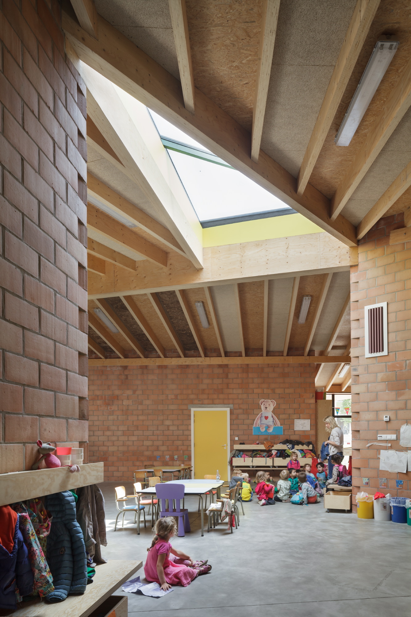 The building process is shown quite literally. Bricks are stacked on top of each other, beams are laid over them, and wooden boards cover the whole ensemble. The act of building remains a tangible presence in the finished school. Its construction tells the children a brief story about architecture.