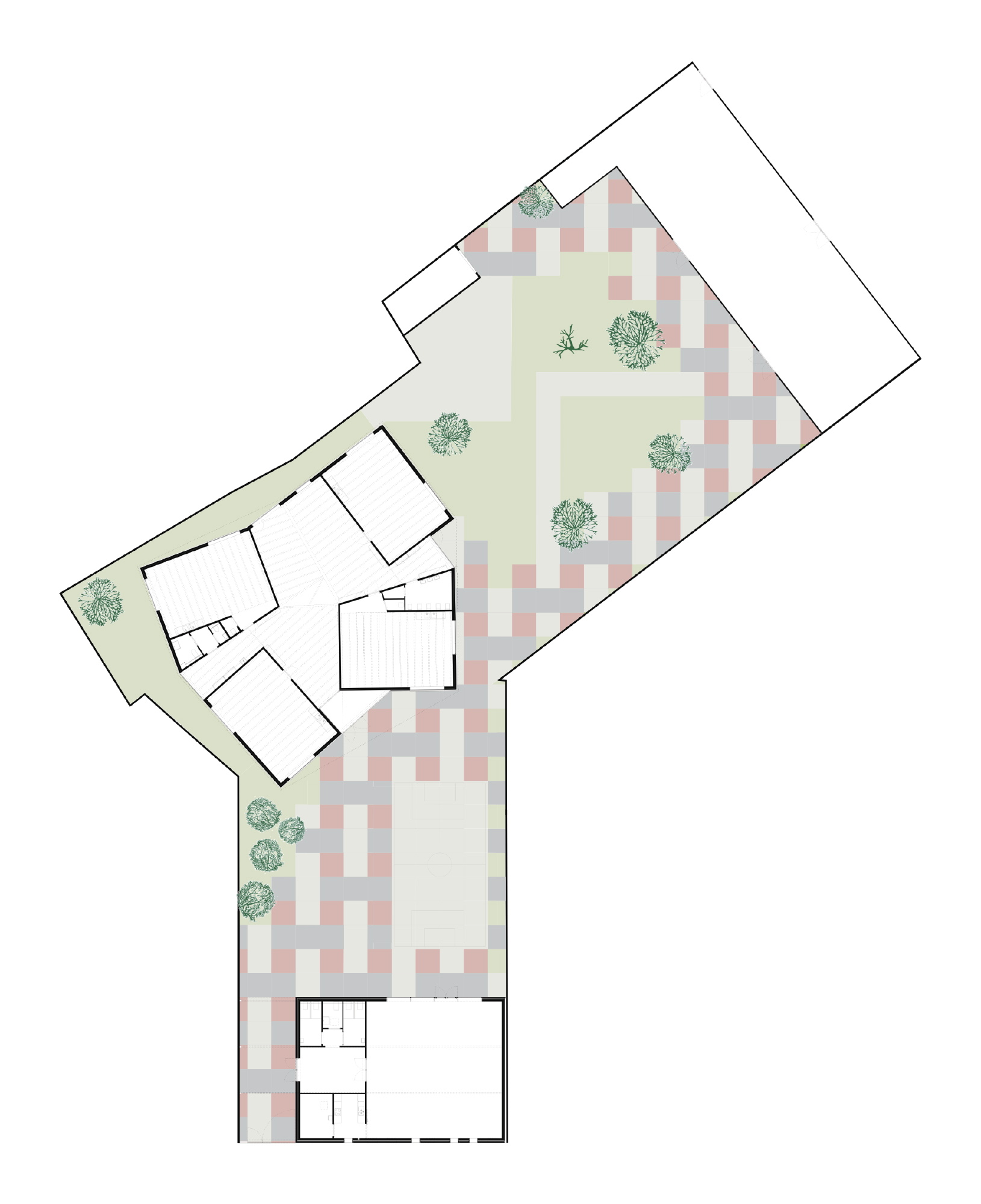 The two buildings mark off the site and define two playgrounds. A frayed carpet of interwoven clinkers encourages play.