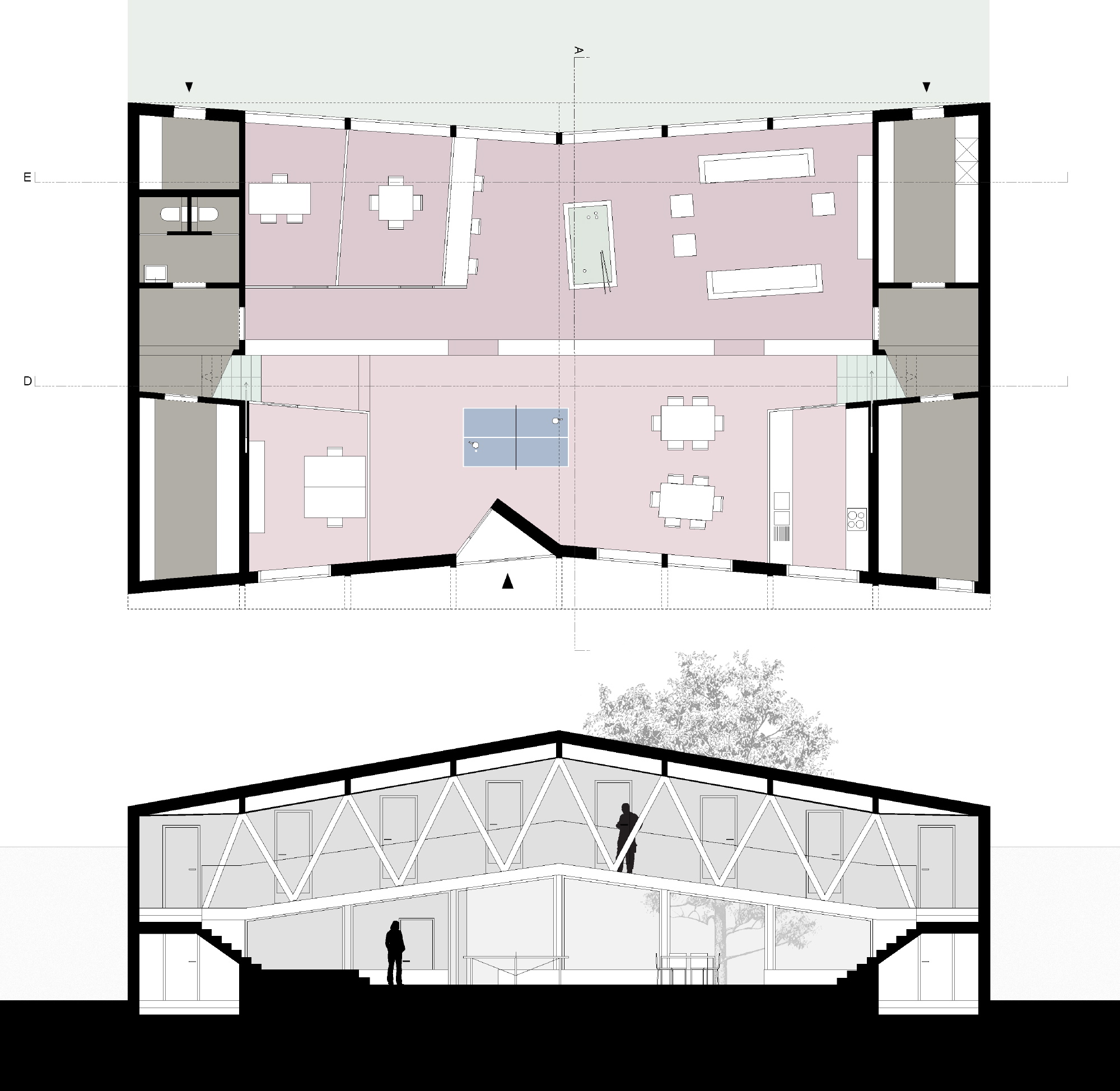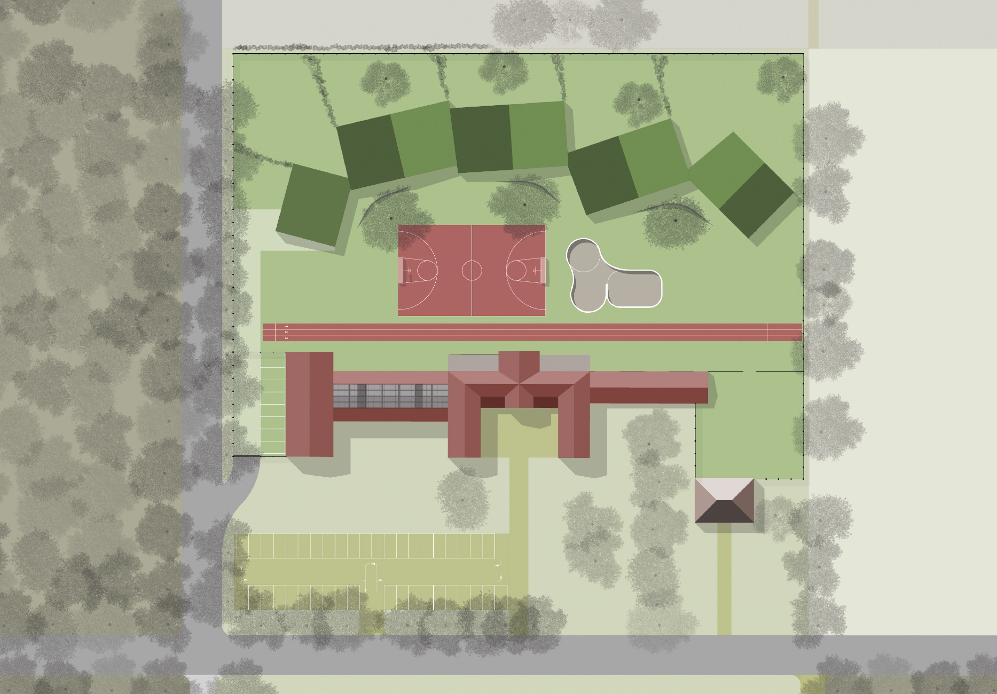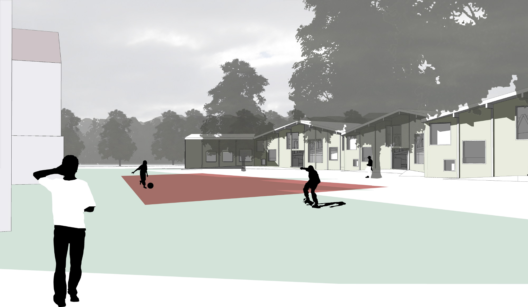 The location of the closed institution is far away from the urban home environment of most young people. They are isolated in an agricultural environment, which contrasts with the intended reintegration into society. The design aims to nuance the remote nature of the site and create a configuration that introduces elements of familiar urban life. This translates into the spatial relationship between housing and public buildings and a certain presence of street-related life. People go to school, to work, to home, to the library, to the gym, to the shop. These functions with recognisable public access are housed in the former Succursale, the existing building on the site.