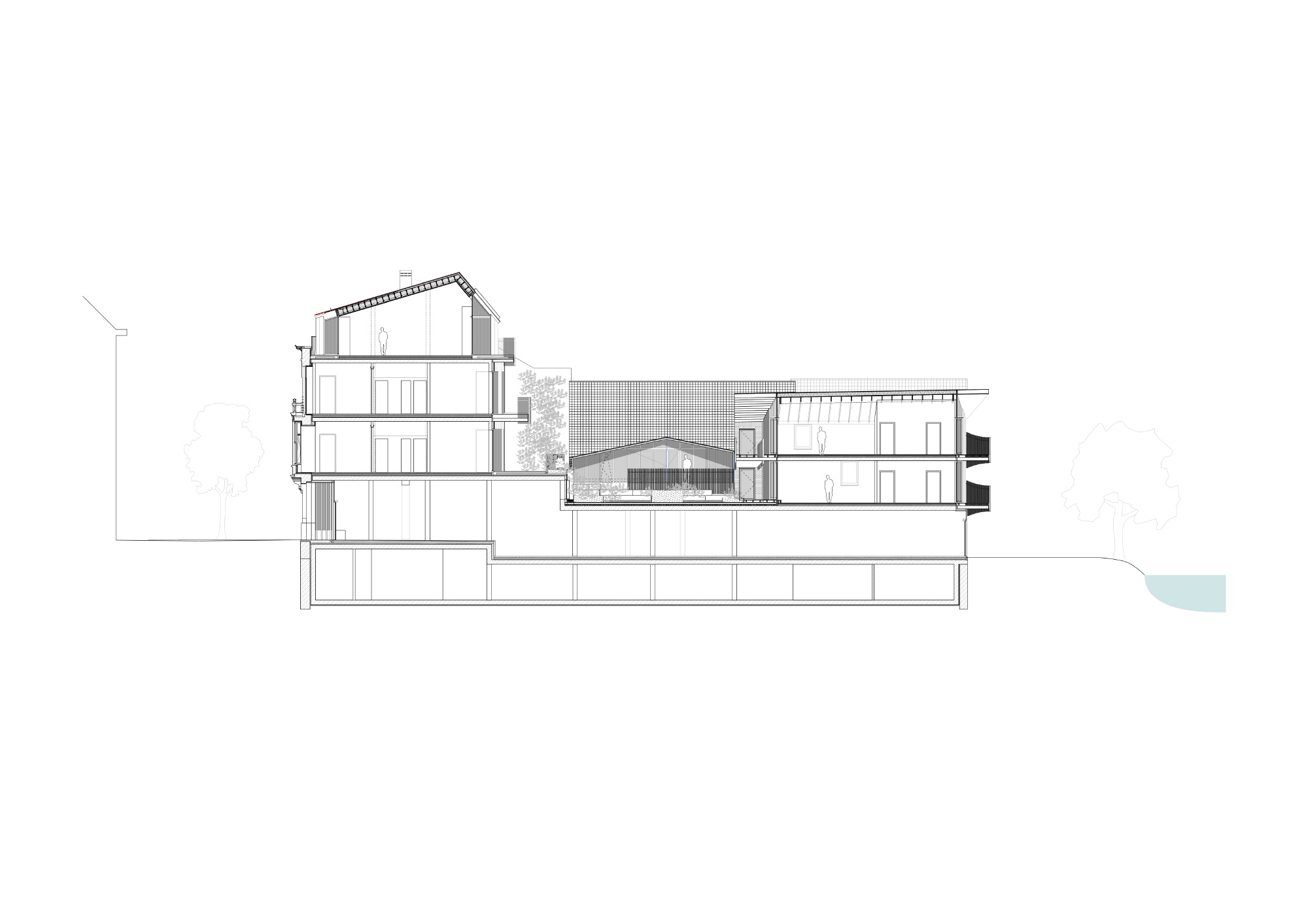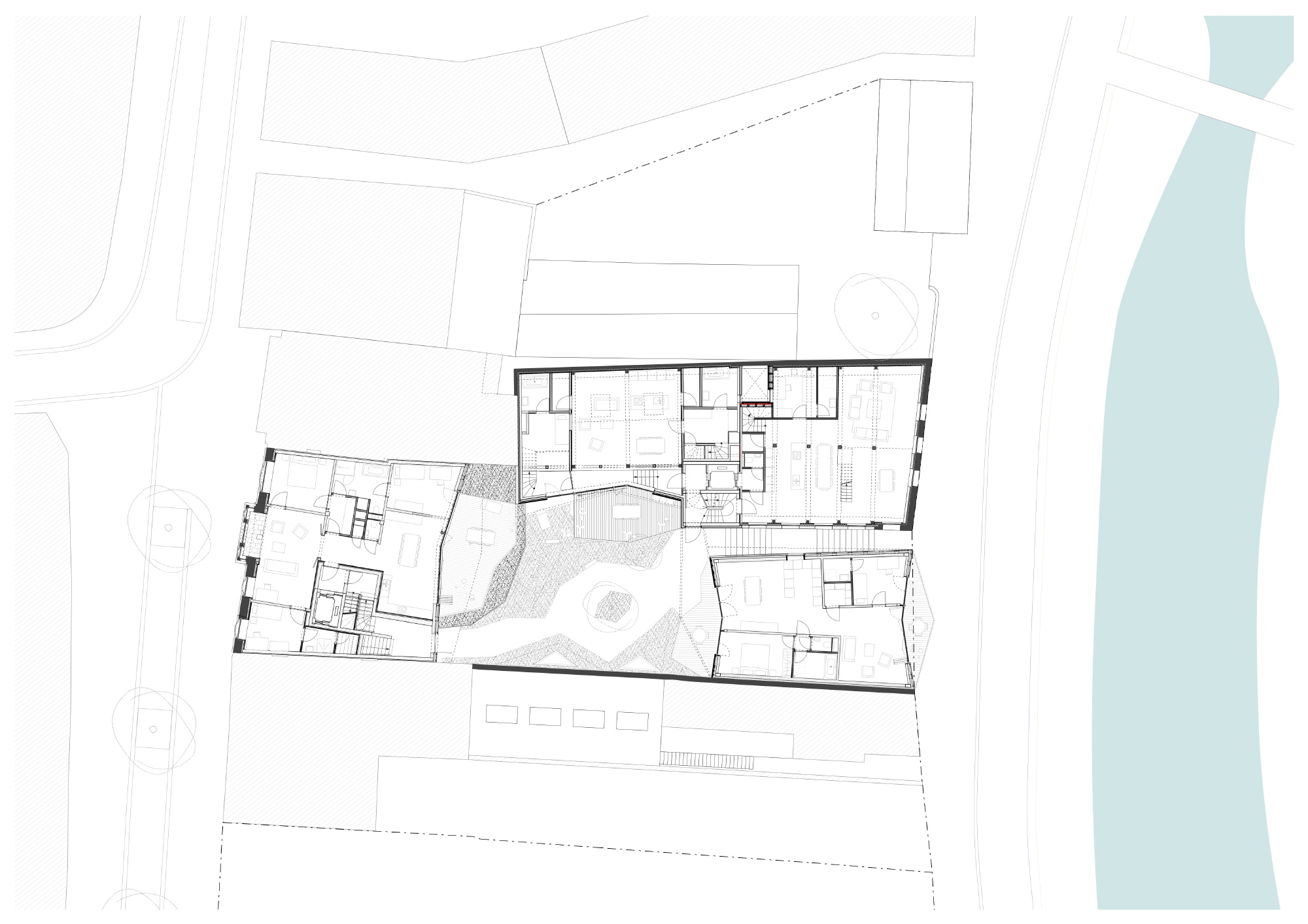 The ensemble fits in with the existing situation as much as possible, with great respect for the building-historical value of the townhouse facade and the sheds. The characteristic gables are also a reference to the historical situation along the old Demer with its intense industrial activity and warehouses. All buildings give onto a collective green inner garden with intensive green roofs. The courtyard garden is directly accessible via an external staircase from the old Demer side.