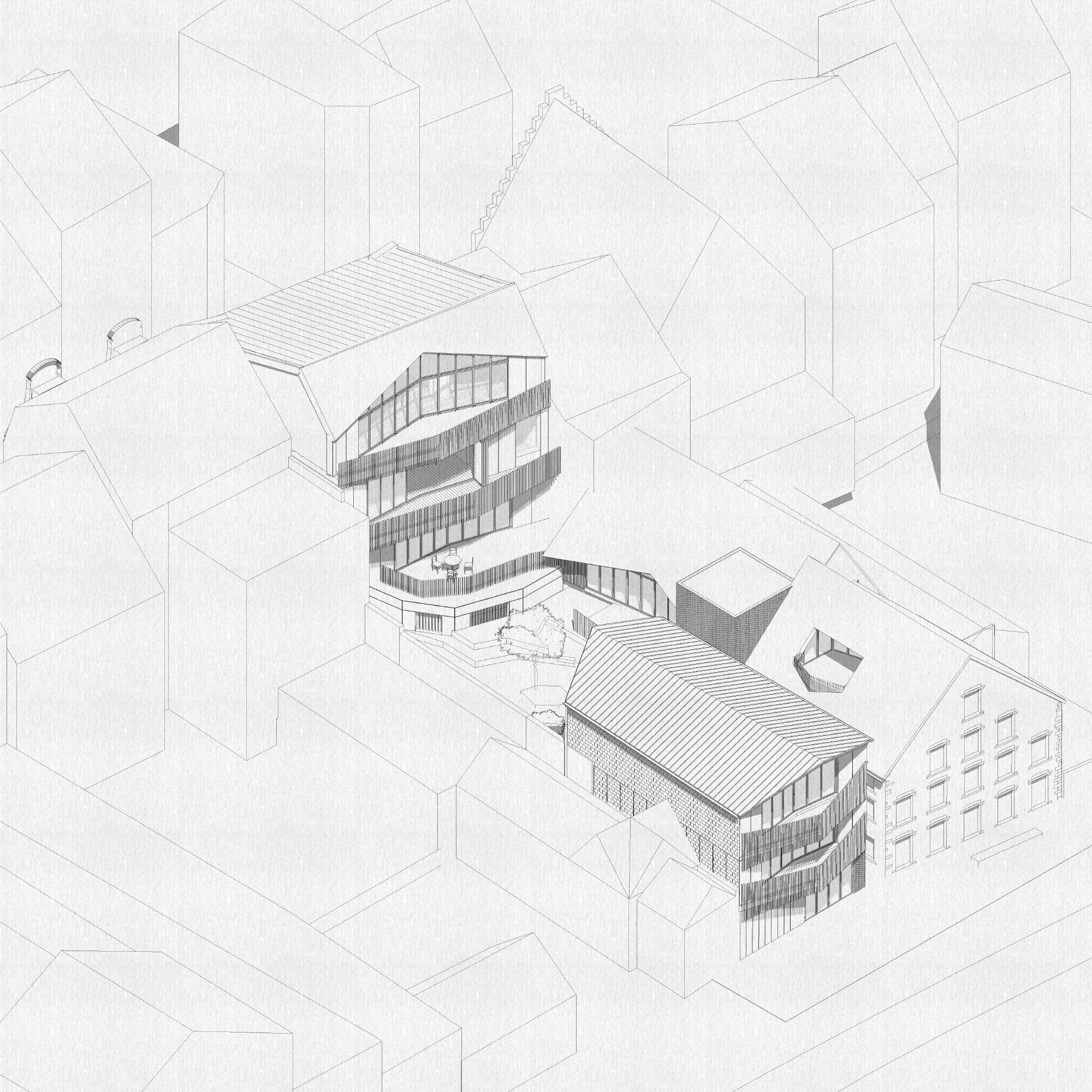The project is an ensemble of four buildings: a town house, two historic sheds and an adjacent new building.
