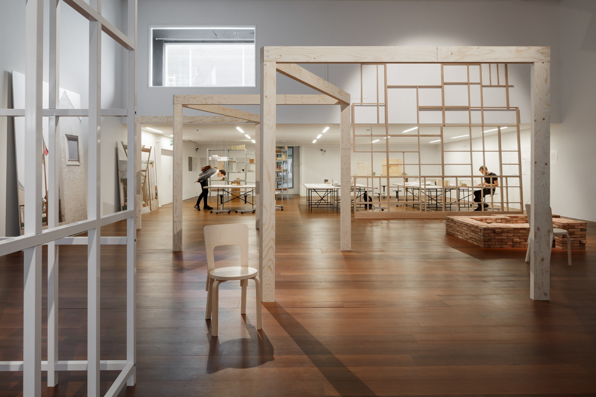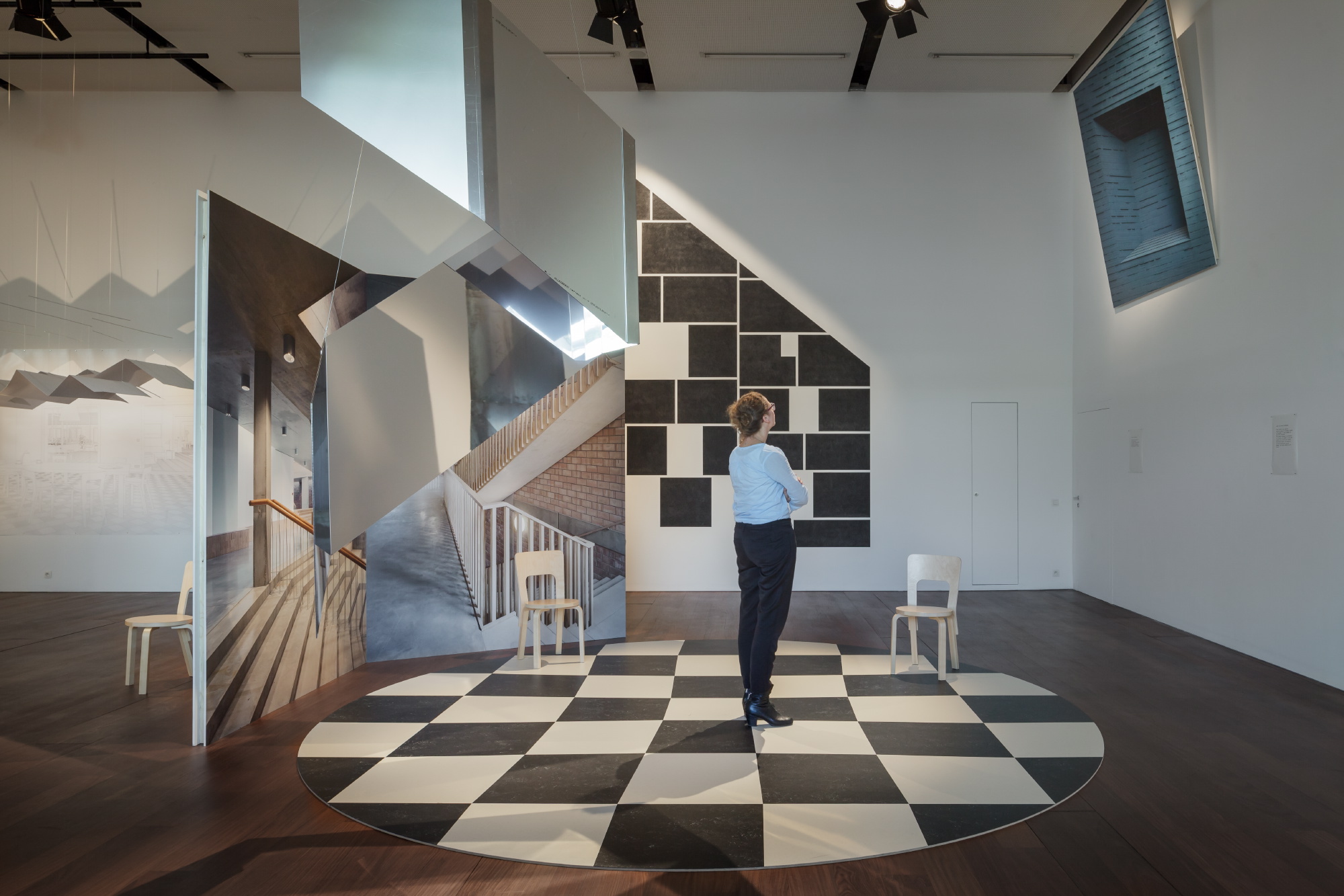 The exhibition offers loops with changing perspectives, vistas and repoussoirs in a succession of spaces and elements in line with each other. Anyone who gets to know the work of noAarchitecten will notice this pronounced attention to the spatial promenade, both on plan and in the structural construction of their buildings.