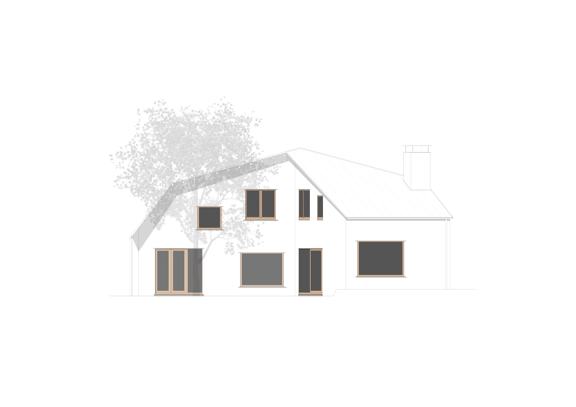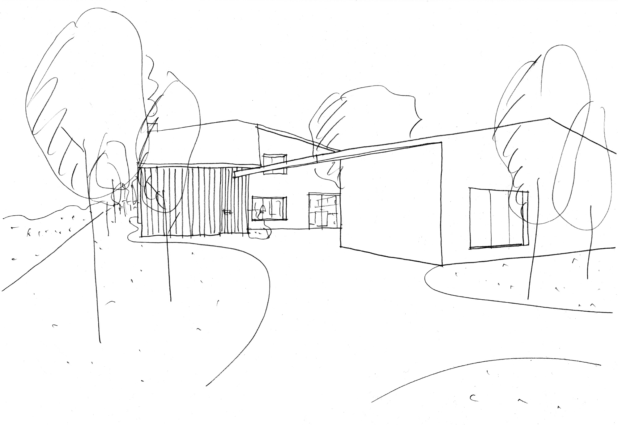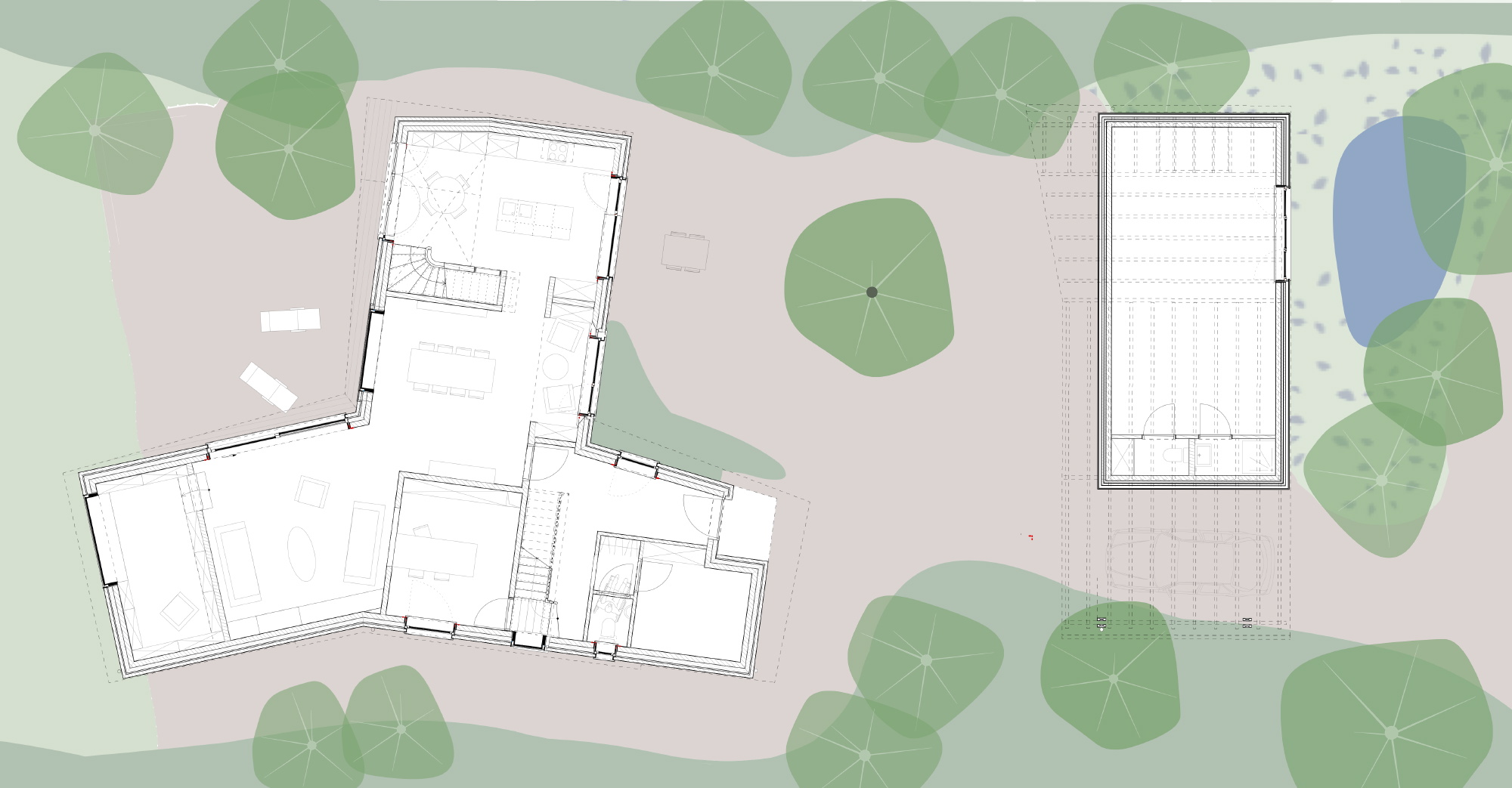 the house mediates with the surrounding outdoor spaces through overhanging roofs