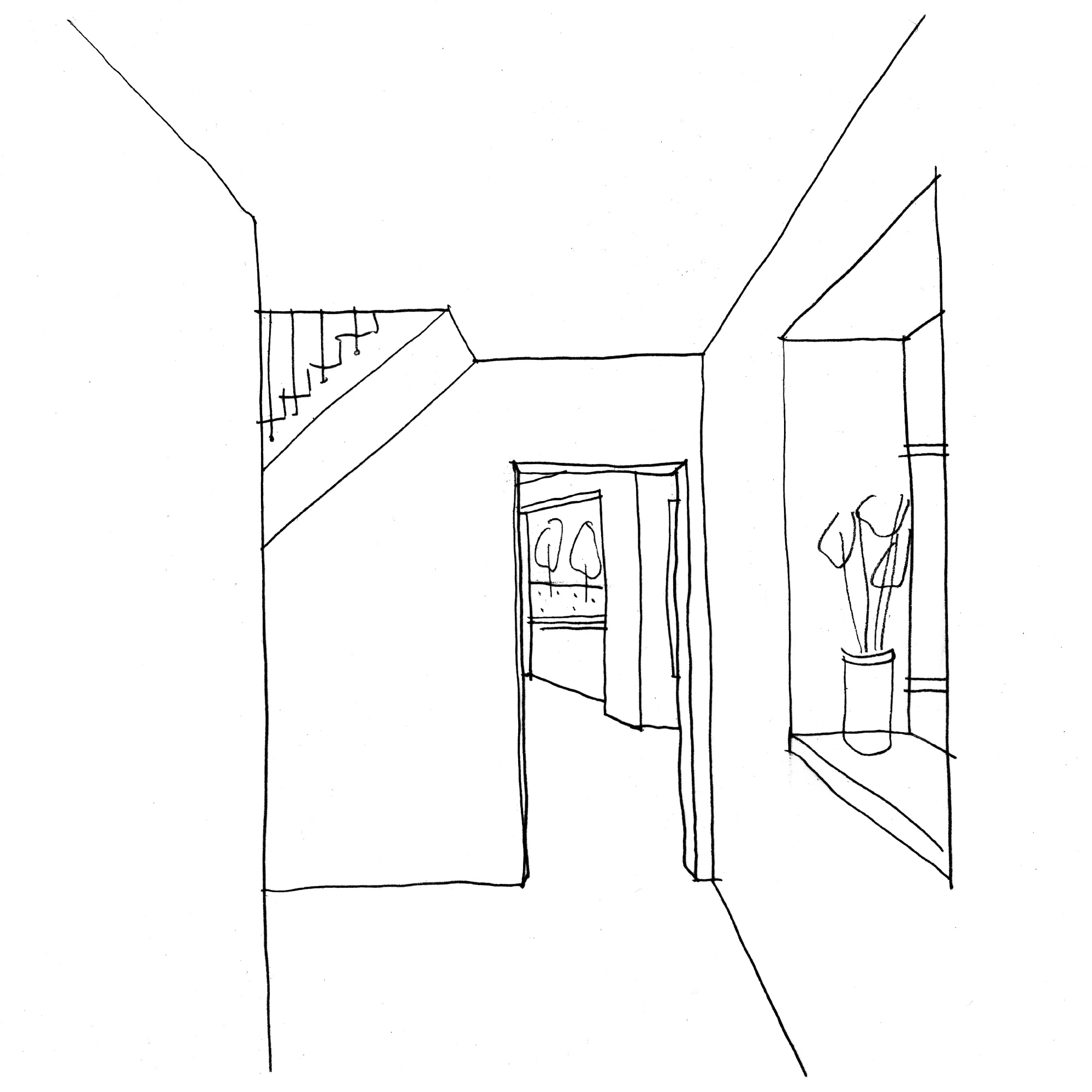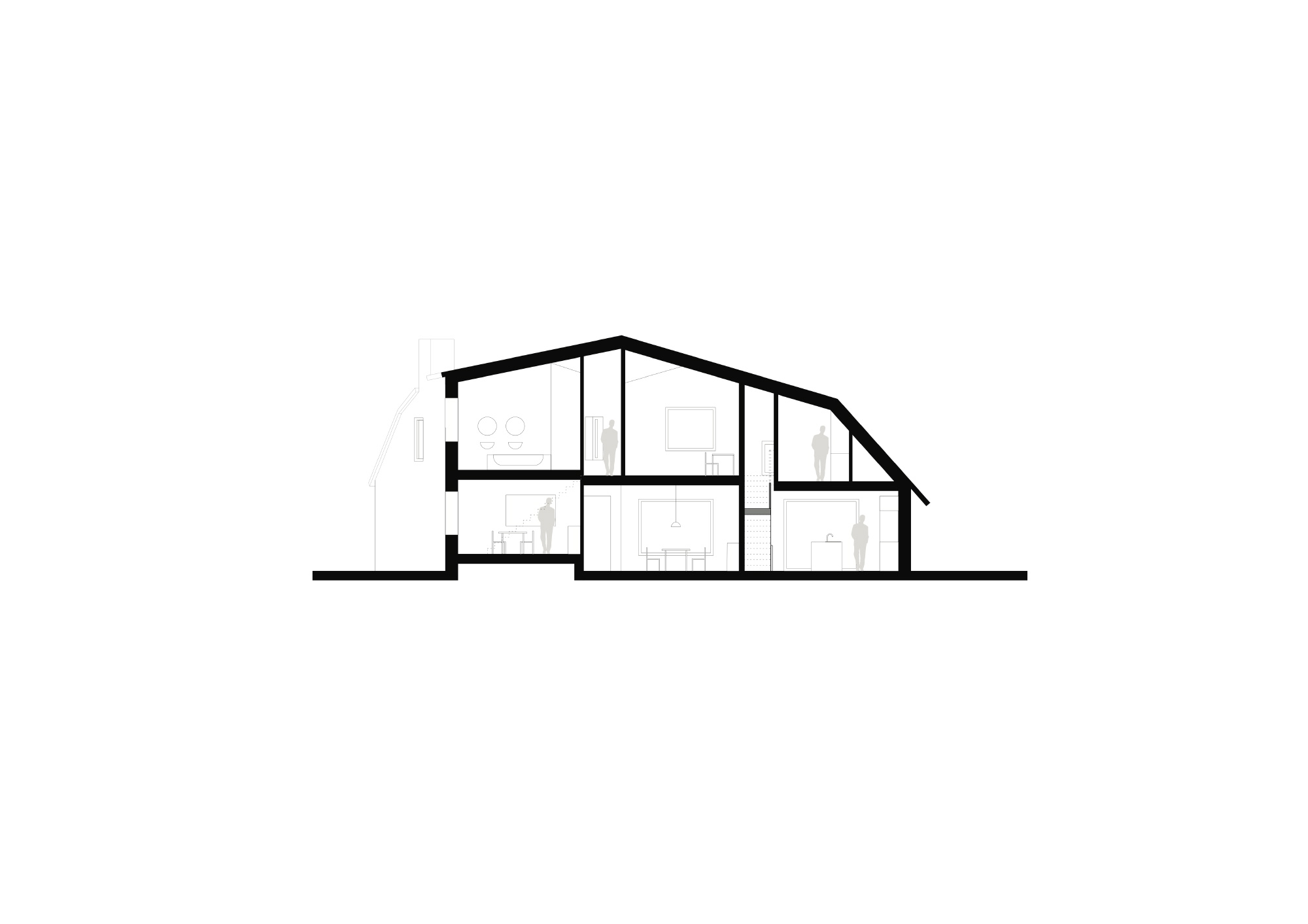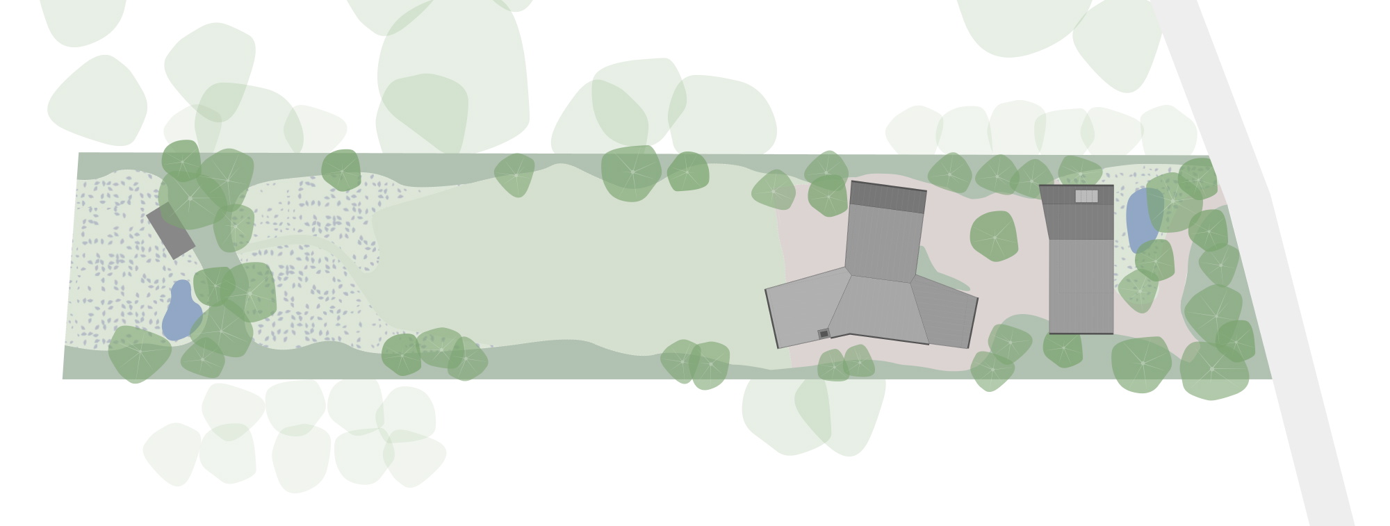 the house mediates with the surrounding outdoor spaces through overhanging roofs