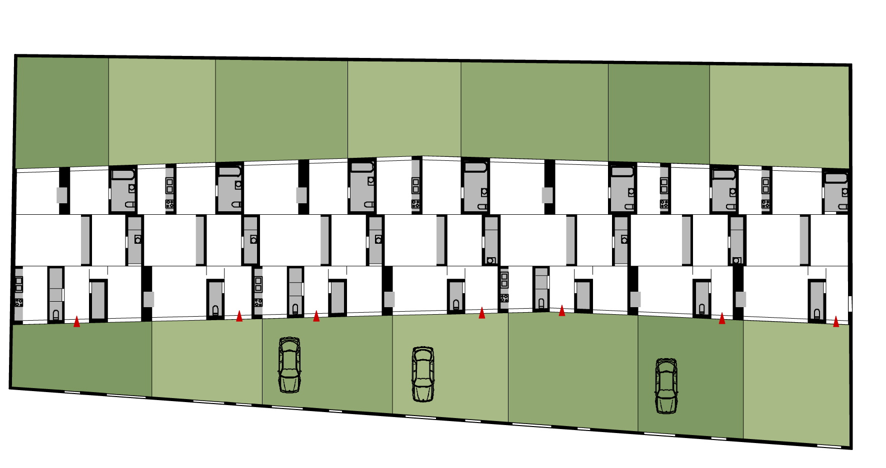 The new dwellings combine the qualities of various familiar housing types: the individuality of the row house, the spaciousness of the loft and the intimacy of the (beguinage) courtyard house. The flexibility inherent in the structure of factory buildings is translated into a domestic scale. Small closed volumes with sanitary cores or storerooms form the fixed structural elements. Their position determines or suggests separate spaces. This gives the dwellings an open plan structure that allows for flexible infill. The presence of the shed roofs combines freedom and a feeling of space with plenty of light and a great deal of privacy in the home. Views are possible between the spaces themselves and to the spacious gardens on both sides of the house.