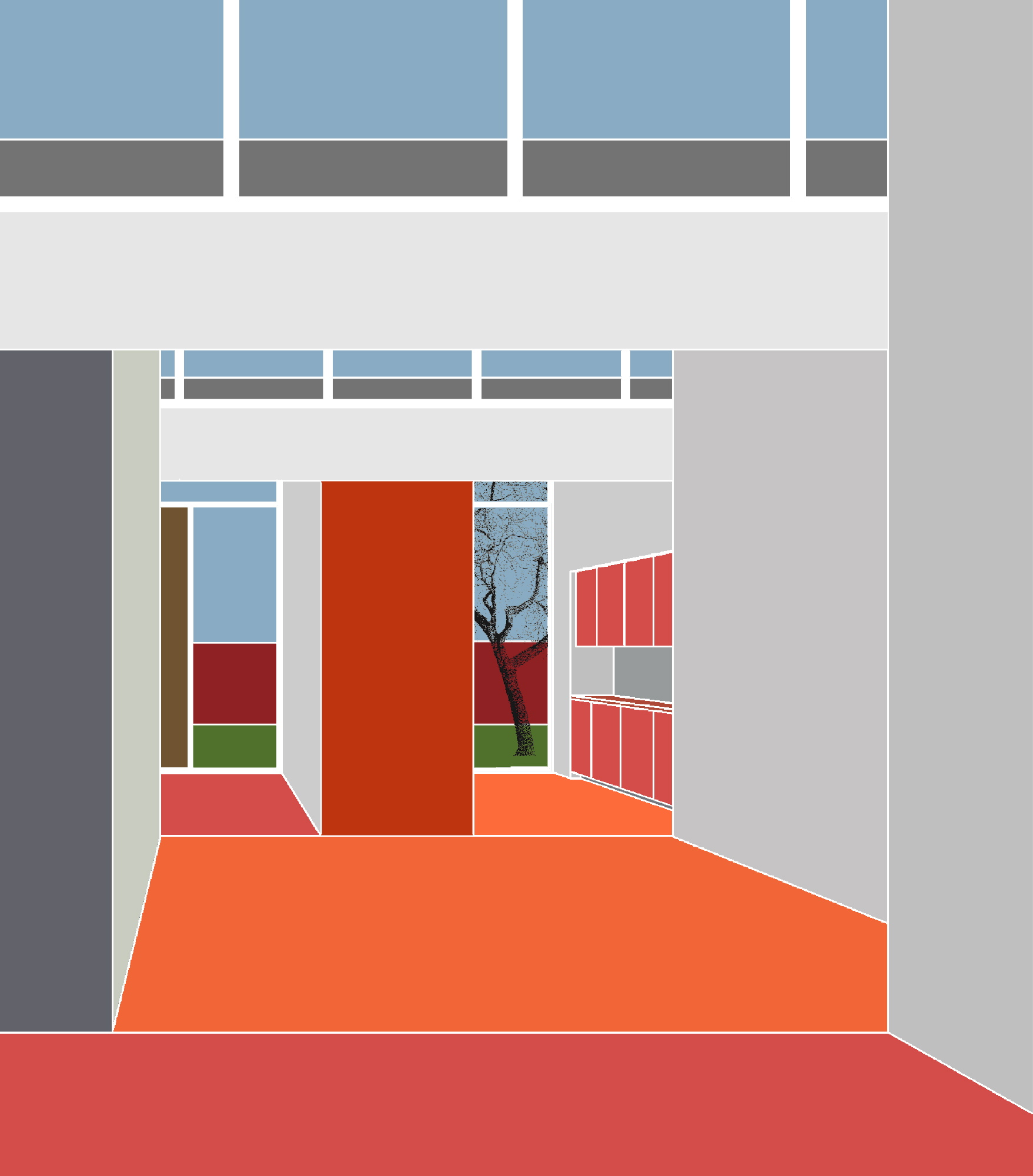The layout of the various squares draws inspiration from the structures and patterns of textiles. Large carpets give the public outdoor spaces a specific texture and colour. Walking through the area is like crossing a series of rooms with their own acoustics, hardness and softness, scent, colour and light.
