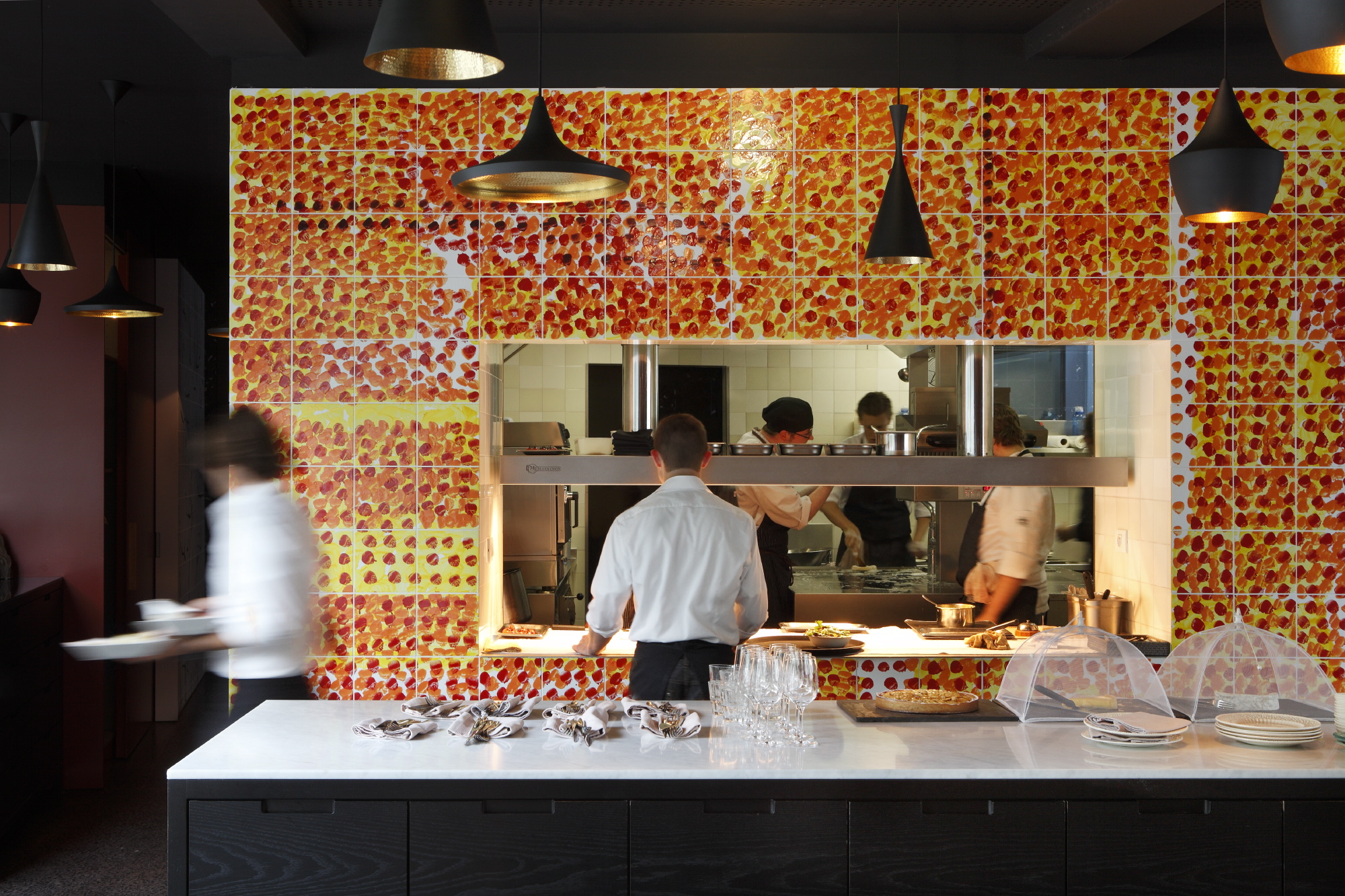 The walls are covered with tiles painted by Benoit van Innis, various strong colours that accompany the guest from the entrance to the apotheosis of the open kitchen.