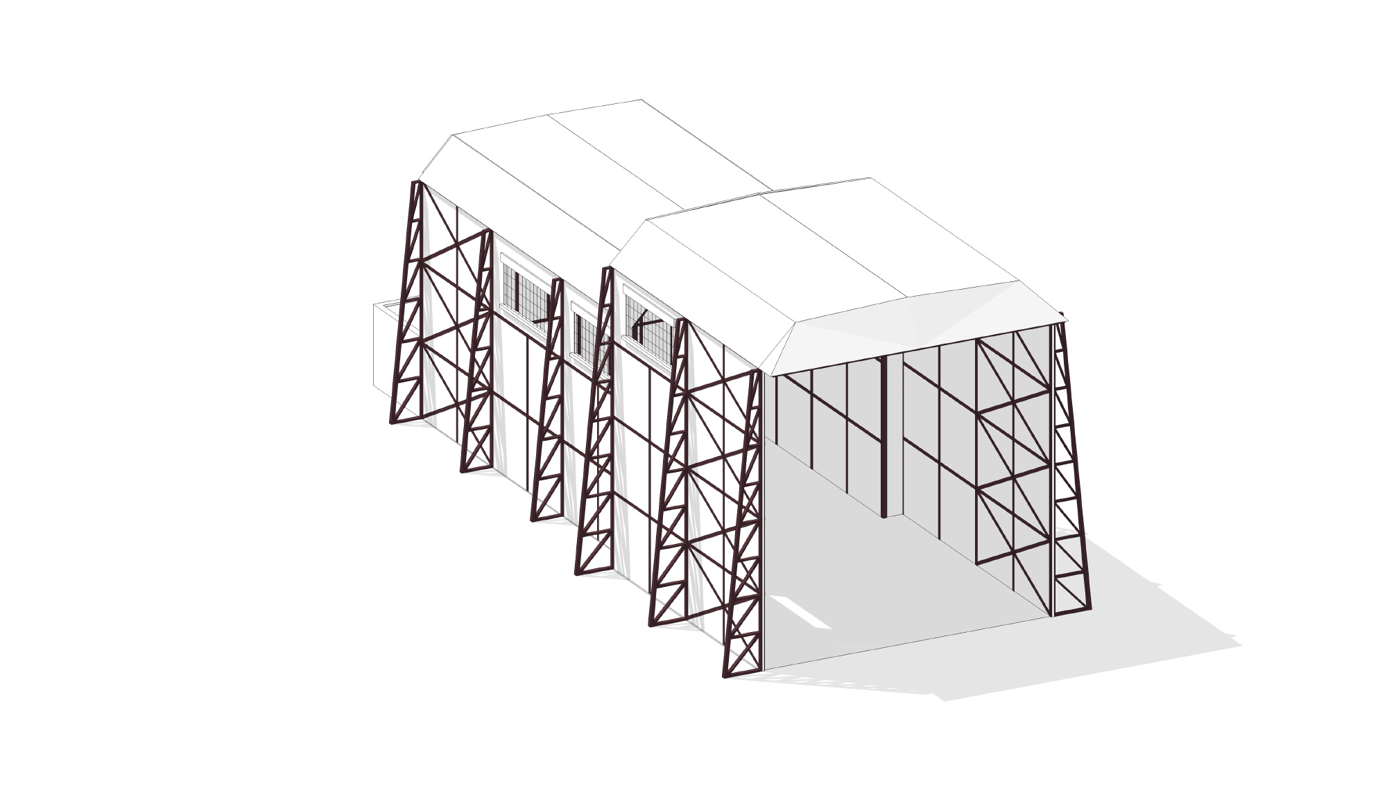 The steel structure is the main reminder, forming the skeleton of the balloon shed. The design proposal tries to evoke the scale and volume by literally reconstructing the steel structure.