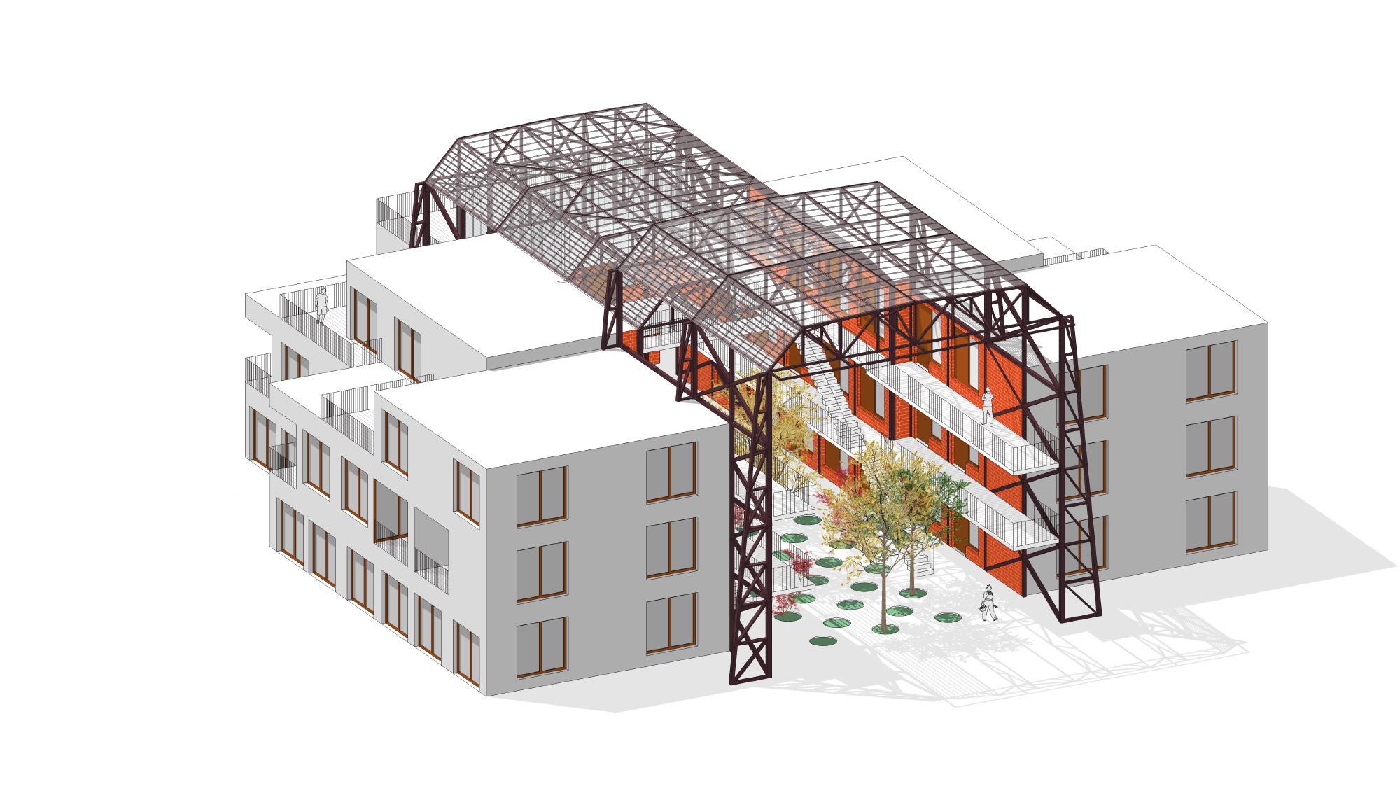 The roof of the balloon shed will be covered with a transparent ETFE foil. The balloon shed will have the function of a covered outdoor space, a multifunctional open atrium providing access to the residential units. A space that stimulates meeting and collective use.