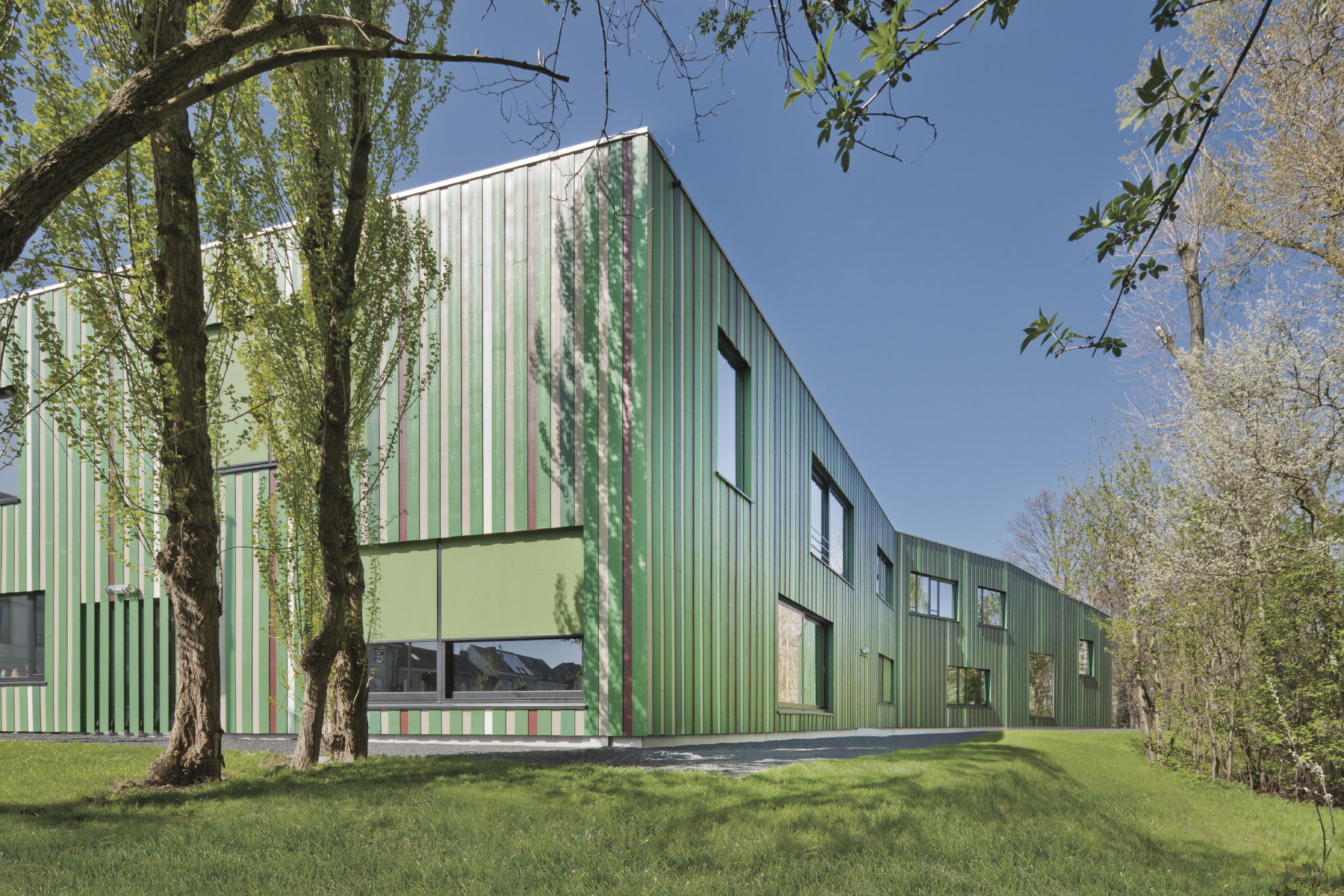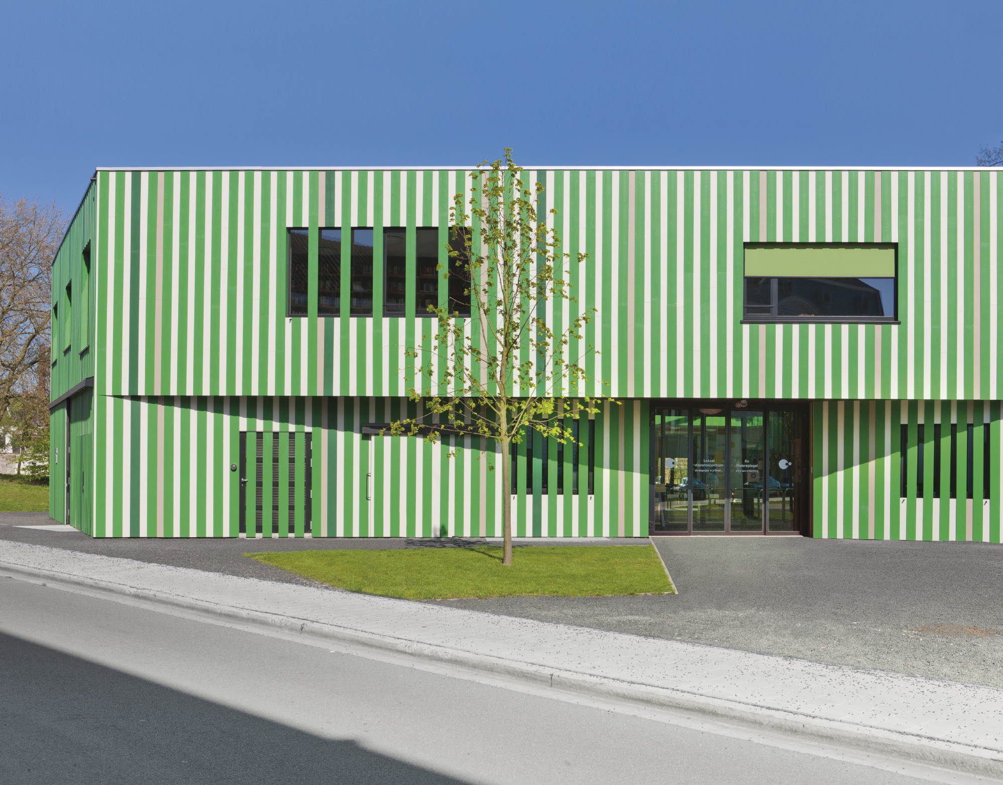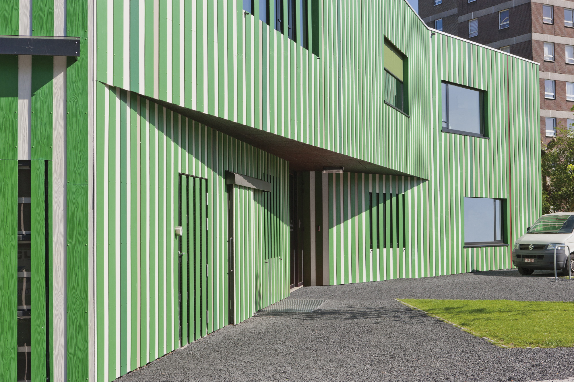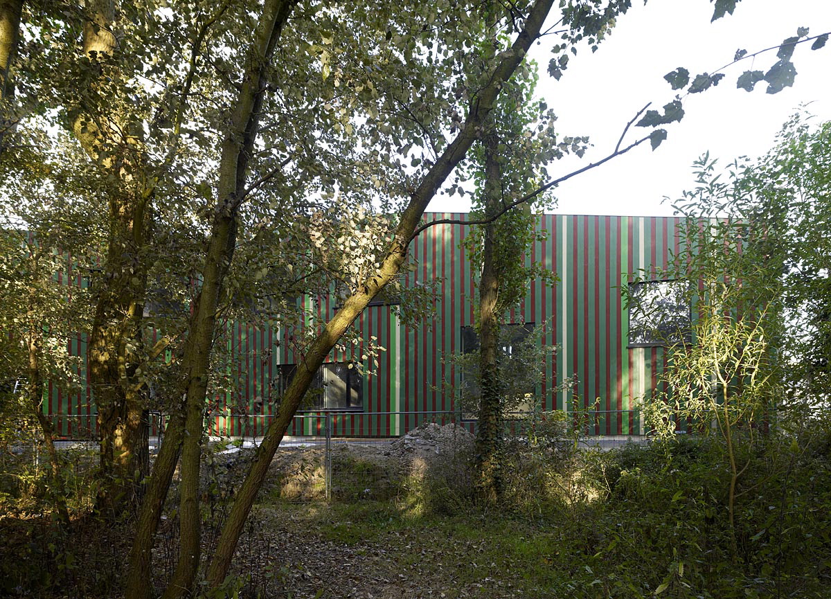 Building in the park demands a pavilion-like building with all sides treated equally. The footprint of the building reminds of a leaf, fallen from a tree. The facade, like a garden fence, is clad with fibre cement boards of dif-ferent colours. A studied colour scheme provides a gradual transition of the wallcolour depending on the context, street or park. The green roof is visible from the two adjacent residential towers.
