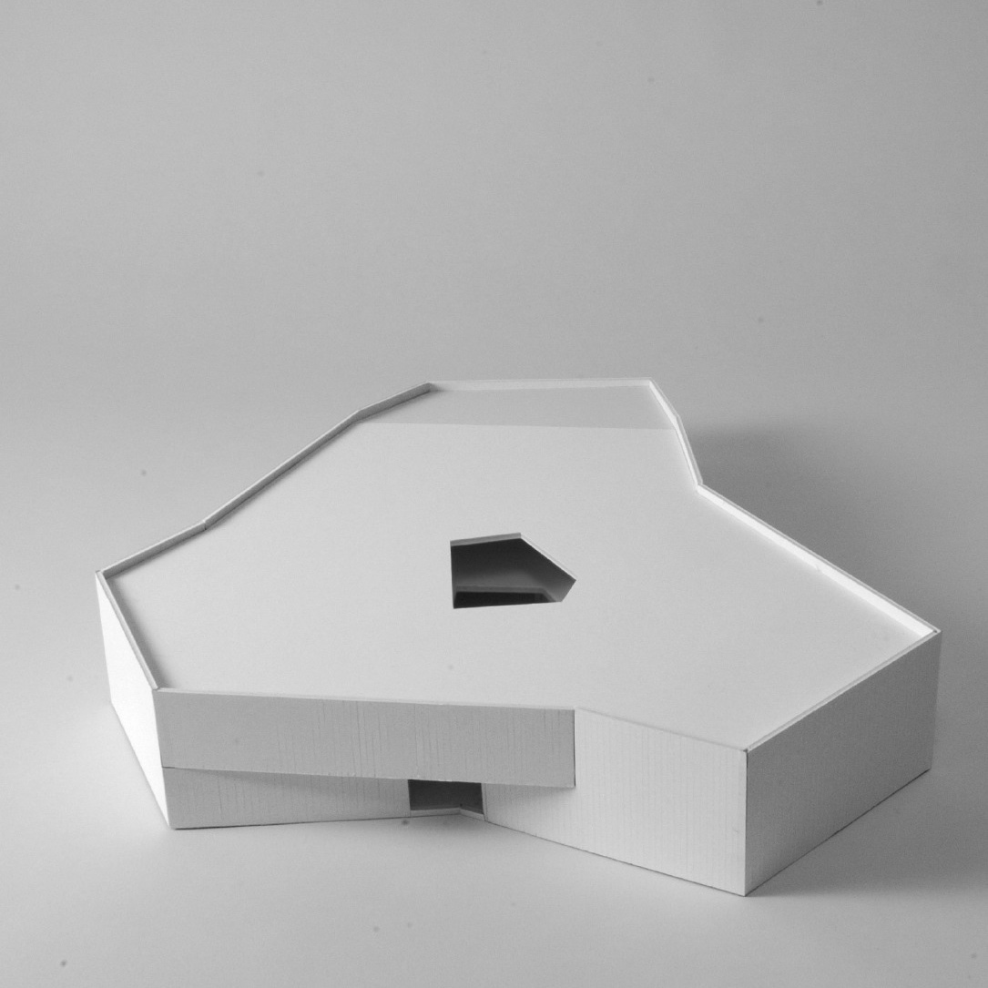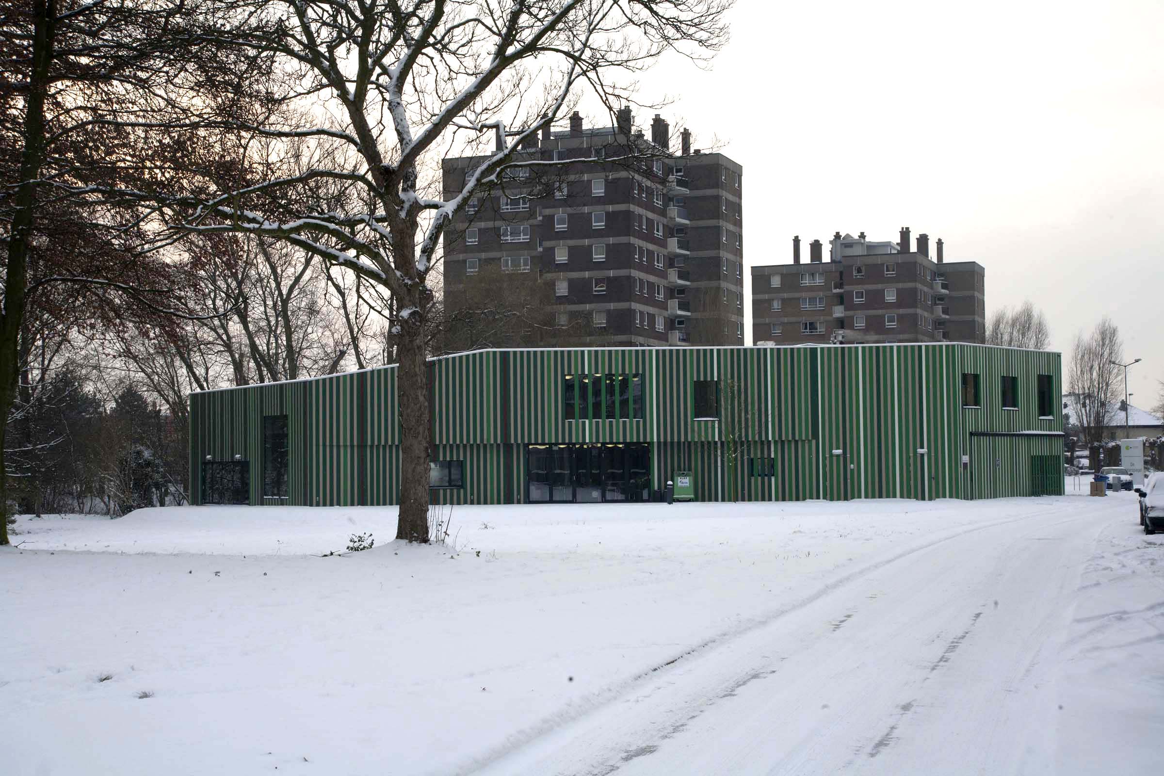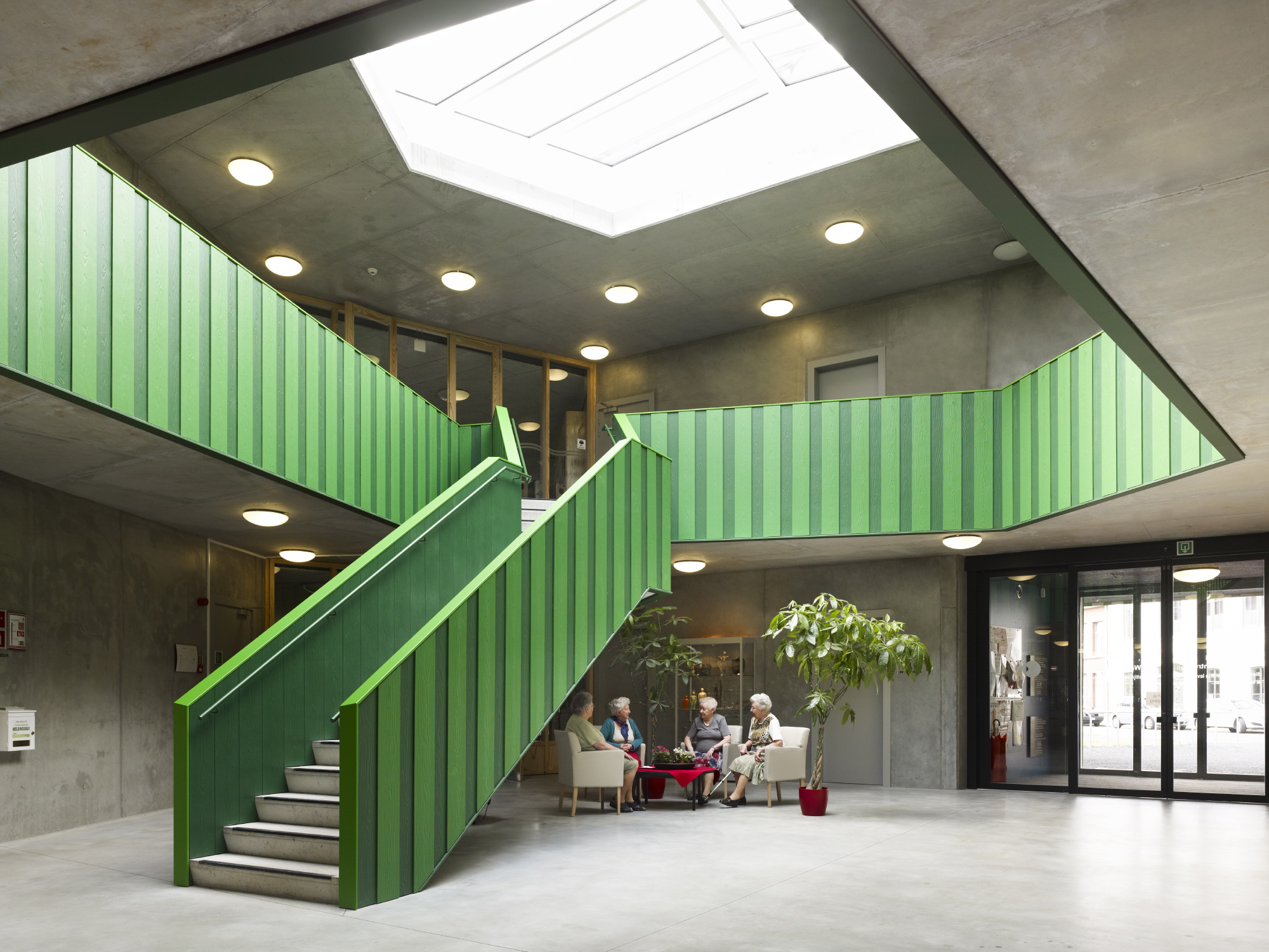 Building in the park demands a pavilion-like building with all sides treated equally. The footprint of the building reminds of a leaf, fallen from a tree. The facade, like a garden fence, is clad with fibre cement boards of dif-ferent colours. A studied colour scheme provides a gradual transition of the wallcolour depending on the context, street or park. The green roof is visible from the two adjacent residential towers.