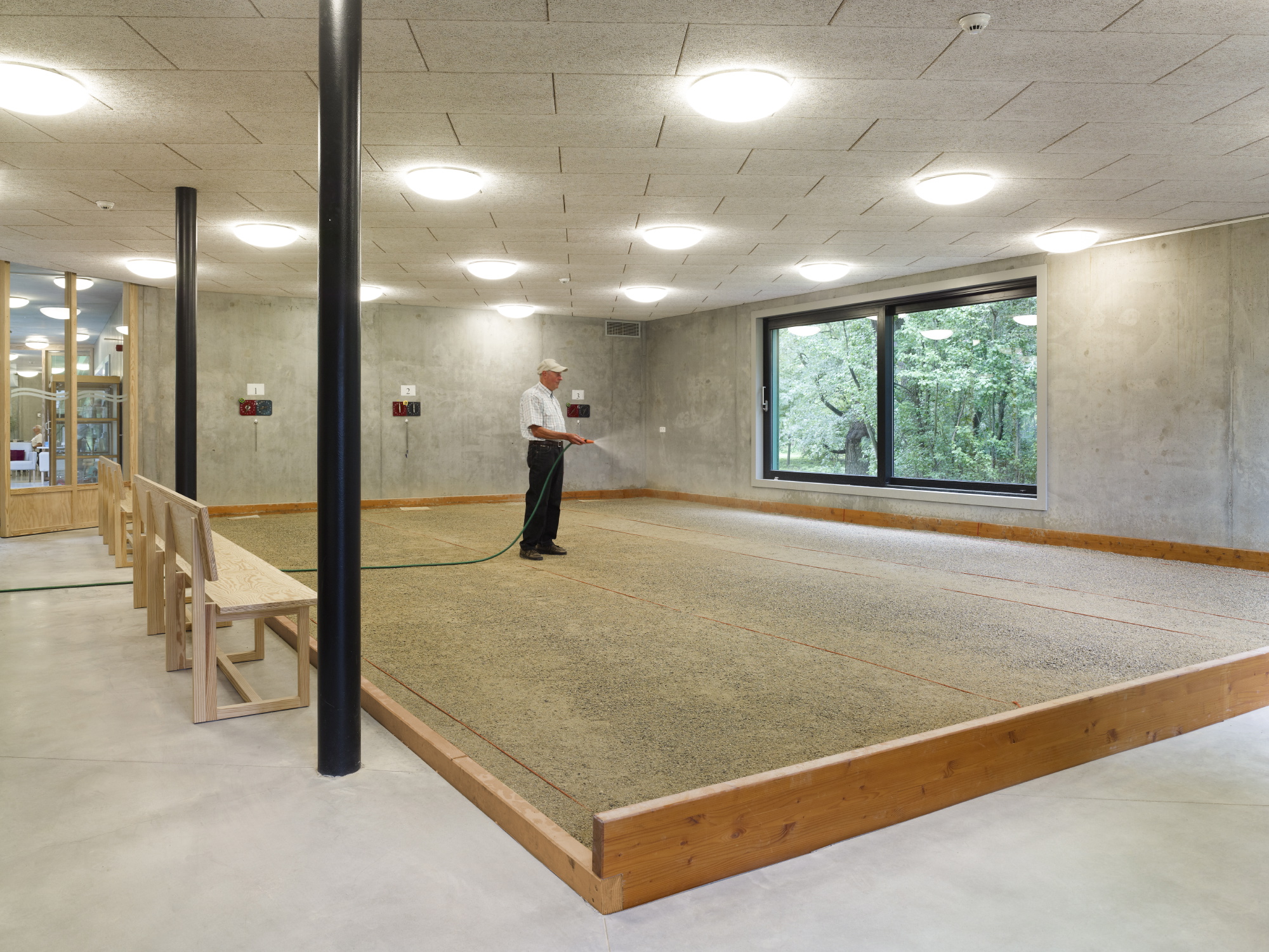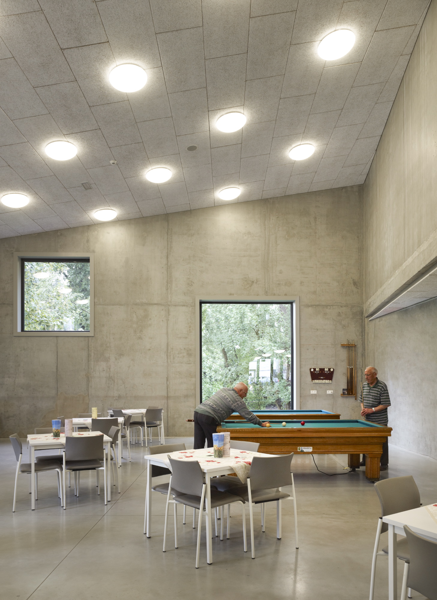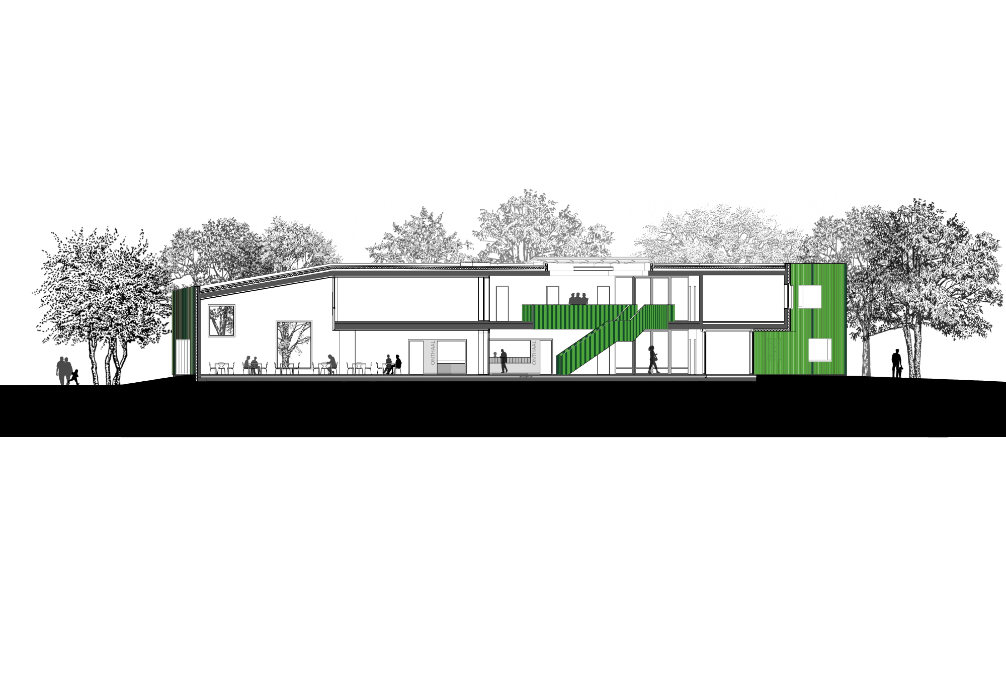 A large cafe is located on the park side. This area enjoys extra height under the roof and is in visual relationship with a large fitness room on the first floor.