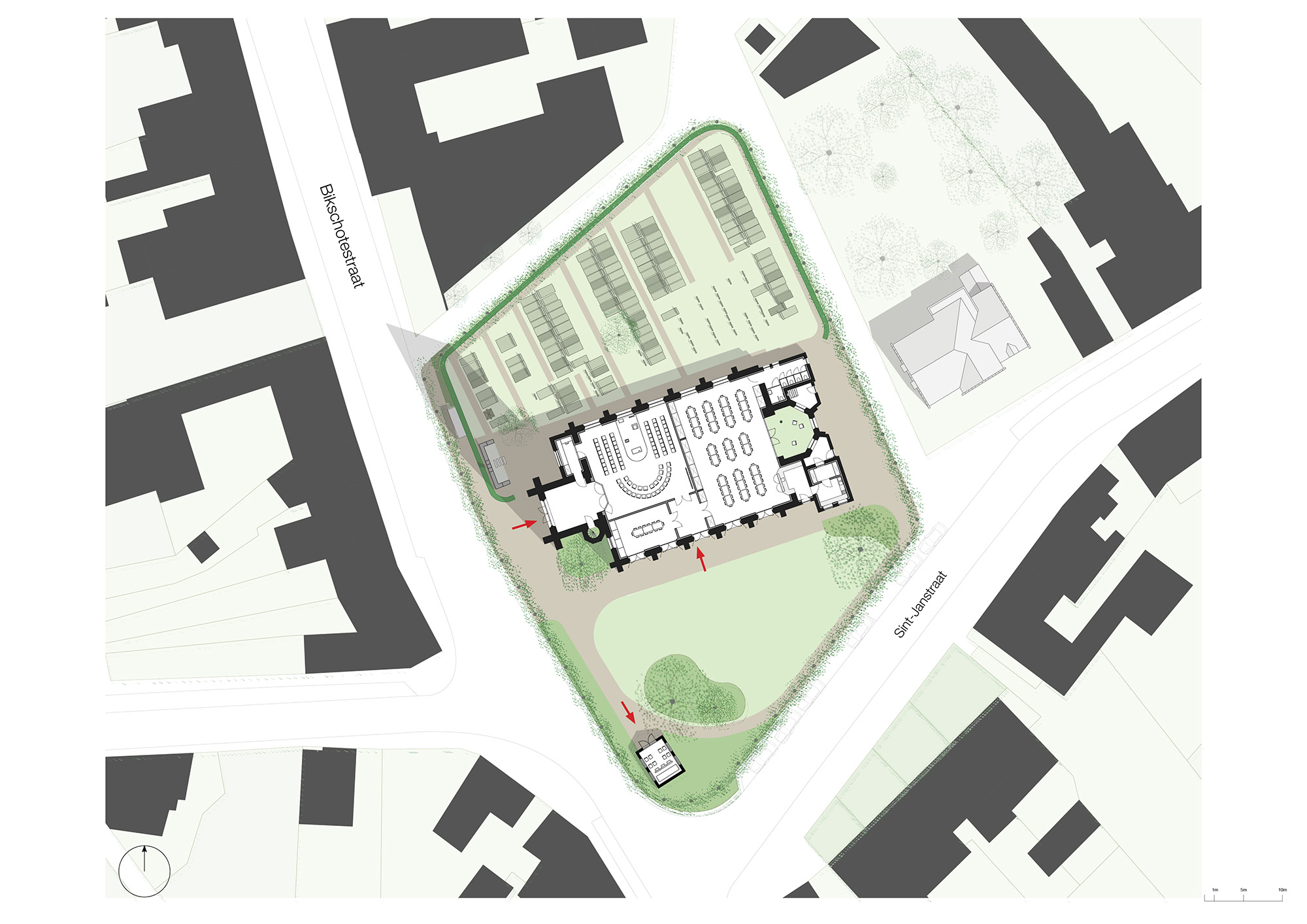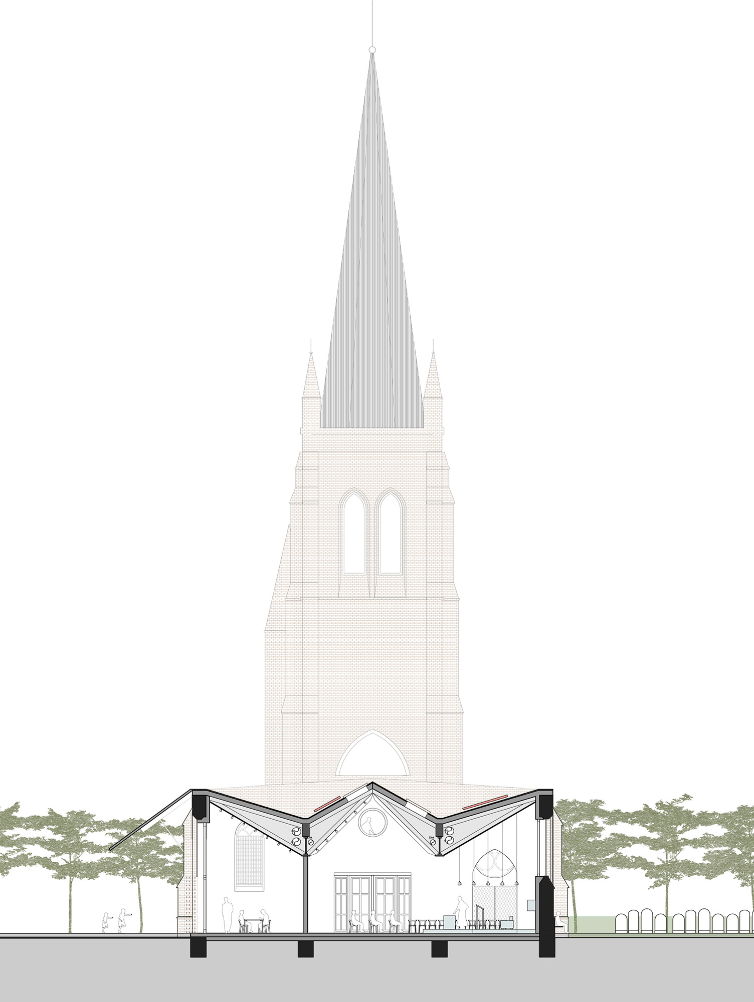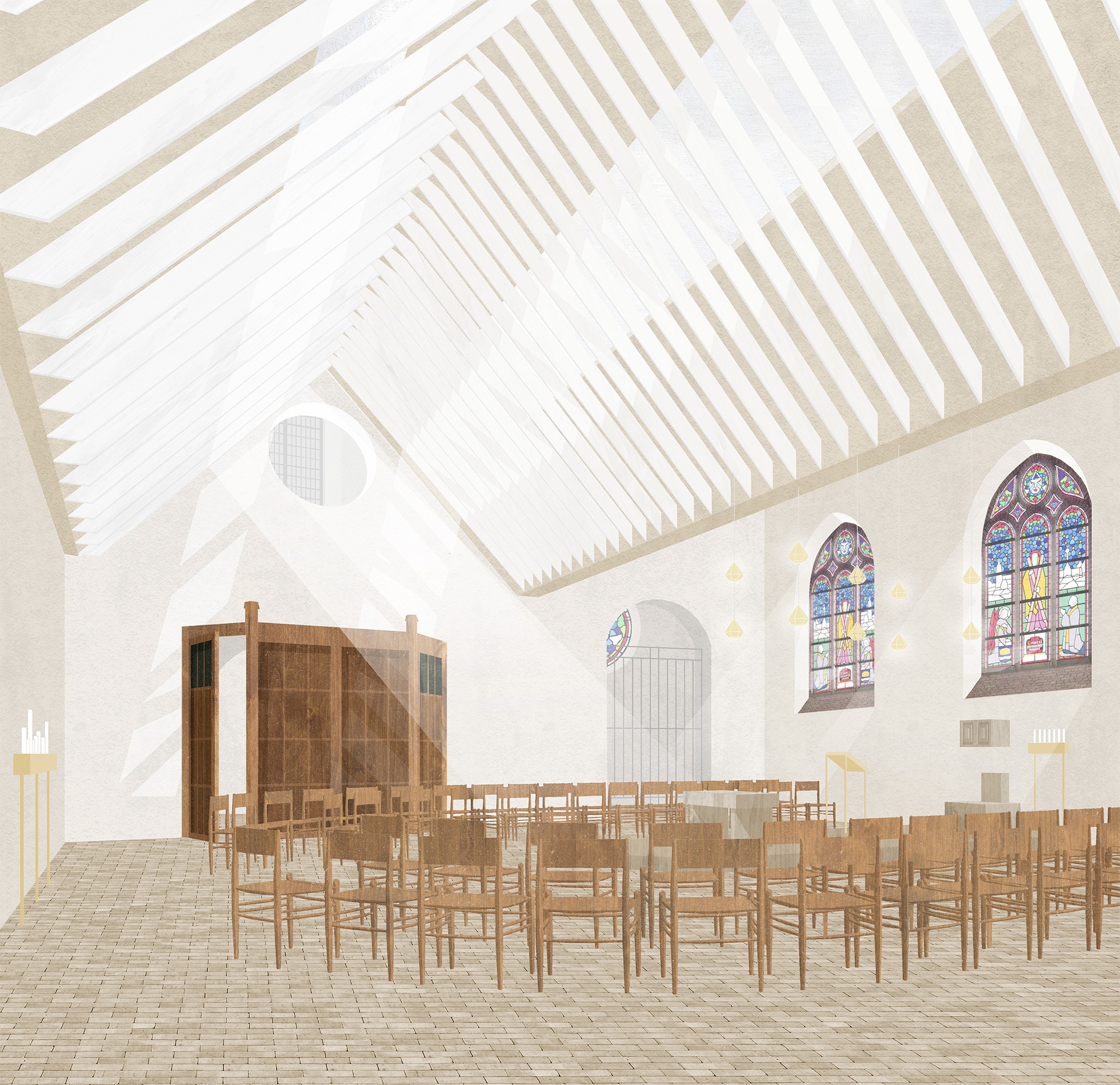 Like so many churches, St-Andreaskerk is becoming much less frequented for worship. A new use is added so that the church can be preserved: a village centre. The halls of the church will be divided, spaces will become smaller. To meet the changing scale, we will also lower the roof. The church will turn a quarter, part of the churchyard will become a village square, a canopy begins to form and the new spaces are more human-scaled.