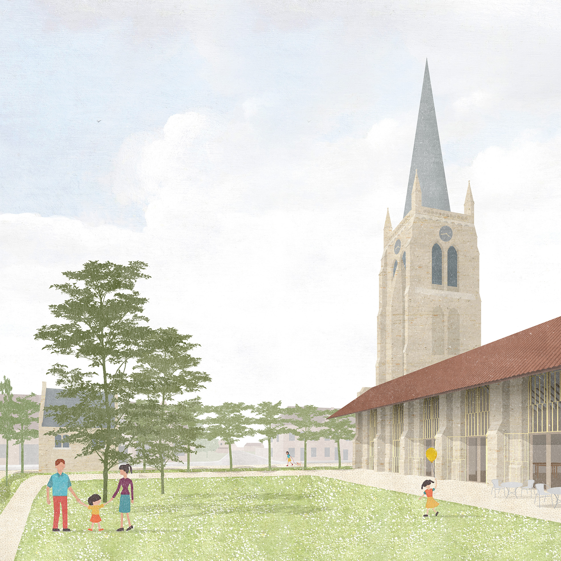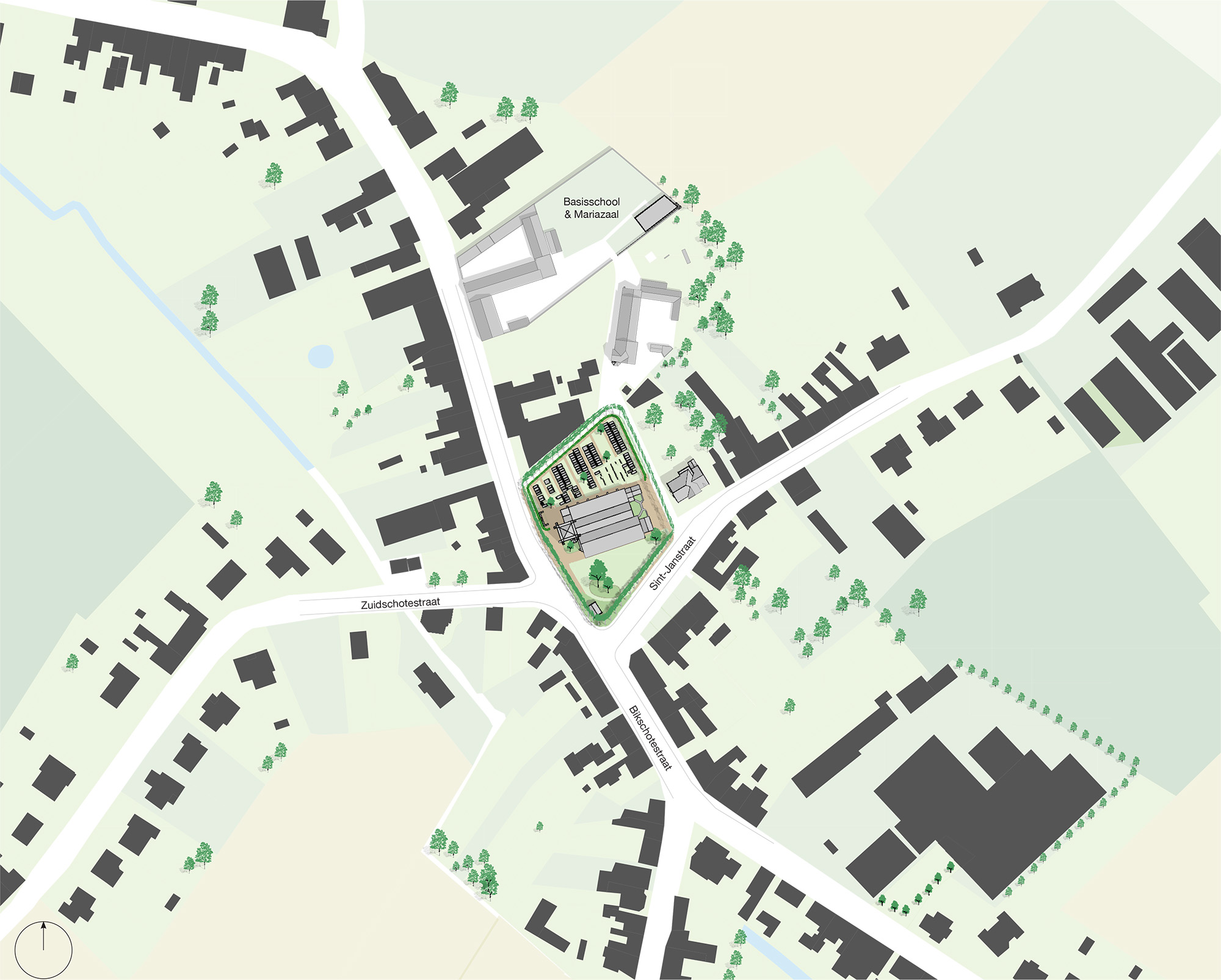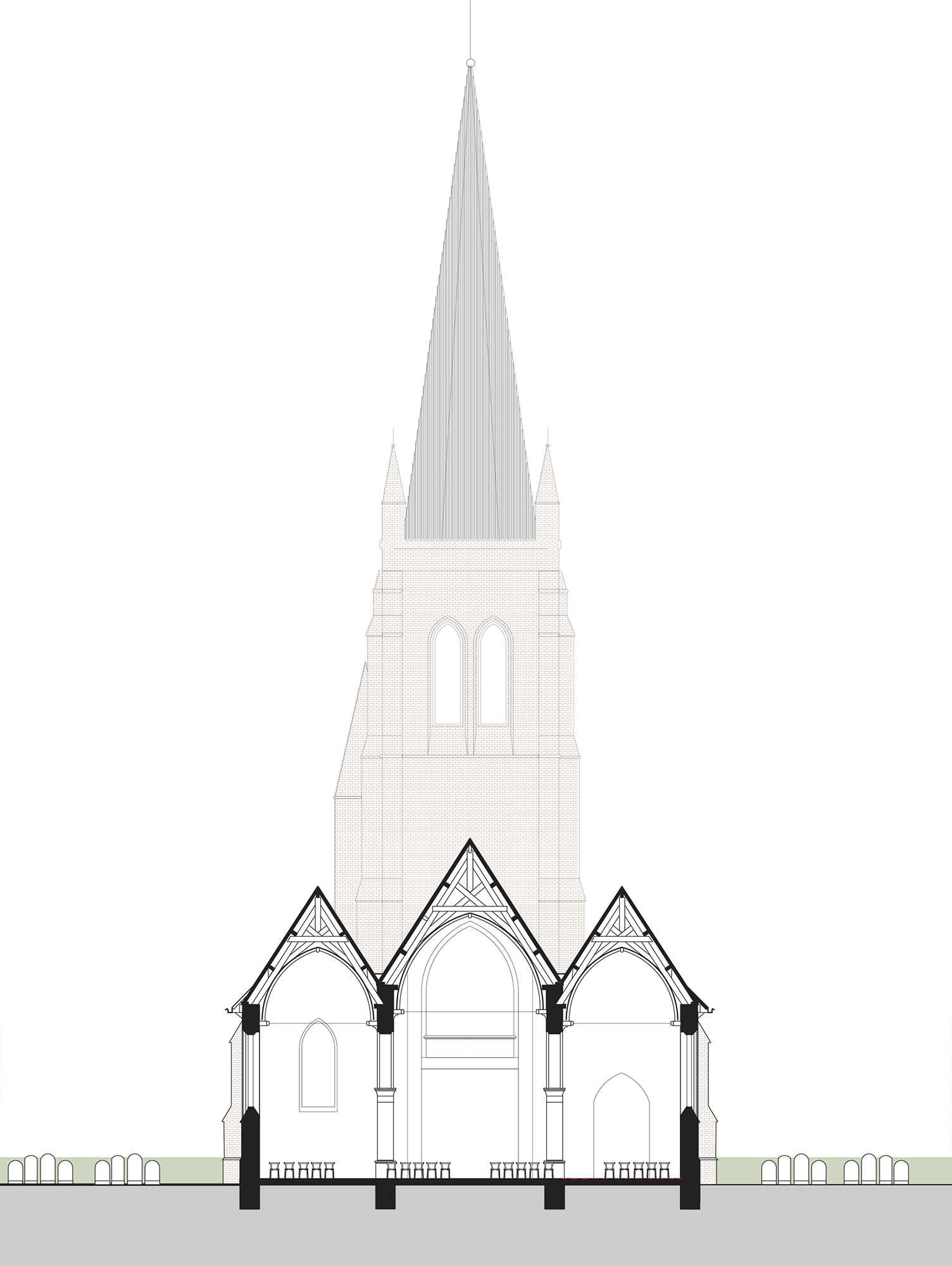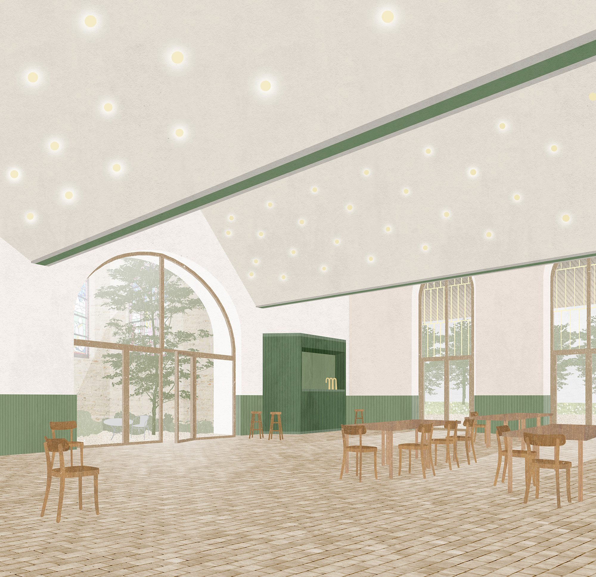Like so many churches, St-Andreaskerk is becoming much less frequented for worship. A new use is added so that the church can be preserved: a village centre. The halls of the church will be divided, spaces will become smaller. To meet the changing scale, we will also lower the roof. The church will turn a quarter, part of the churchyard will become a village square, a canopy begins to form and the new spaces are more human-scaled.