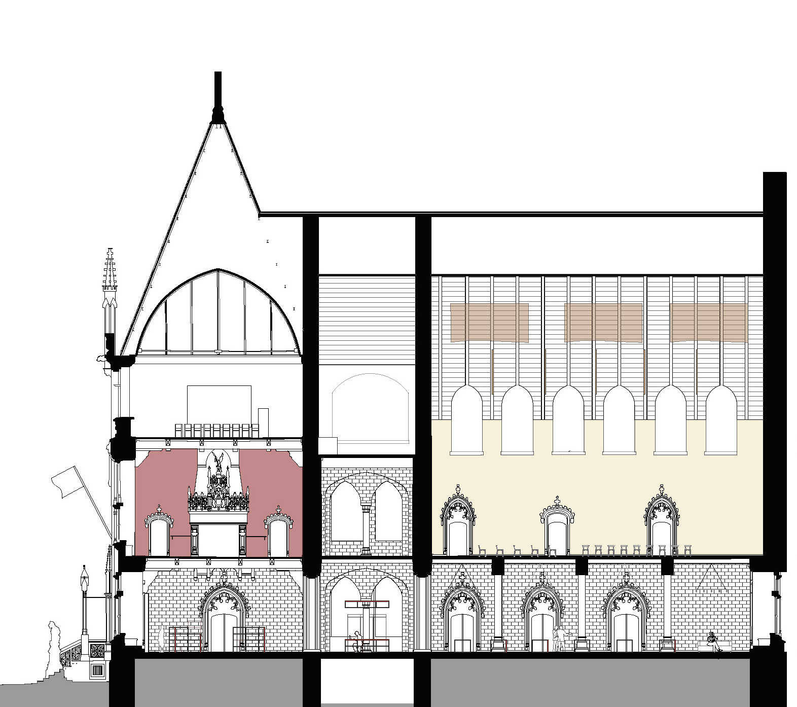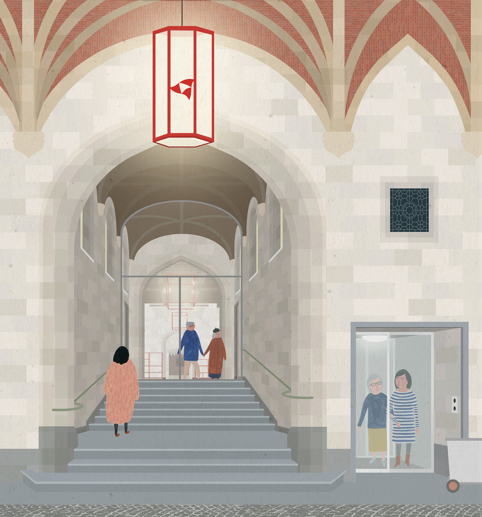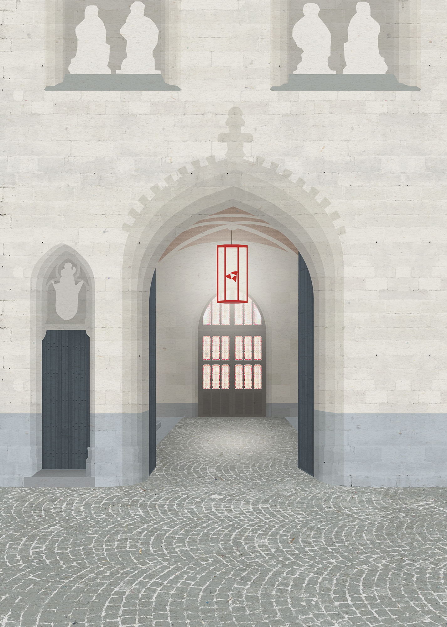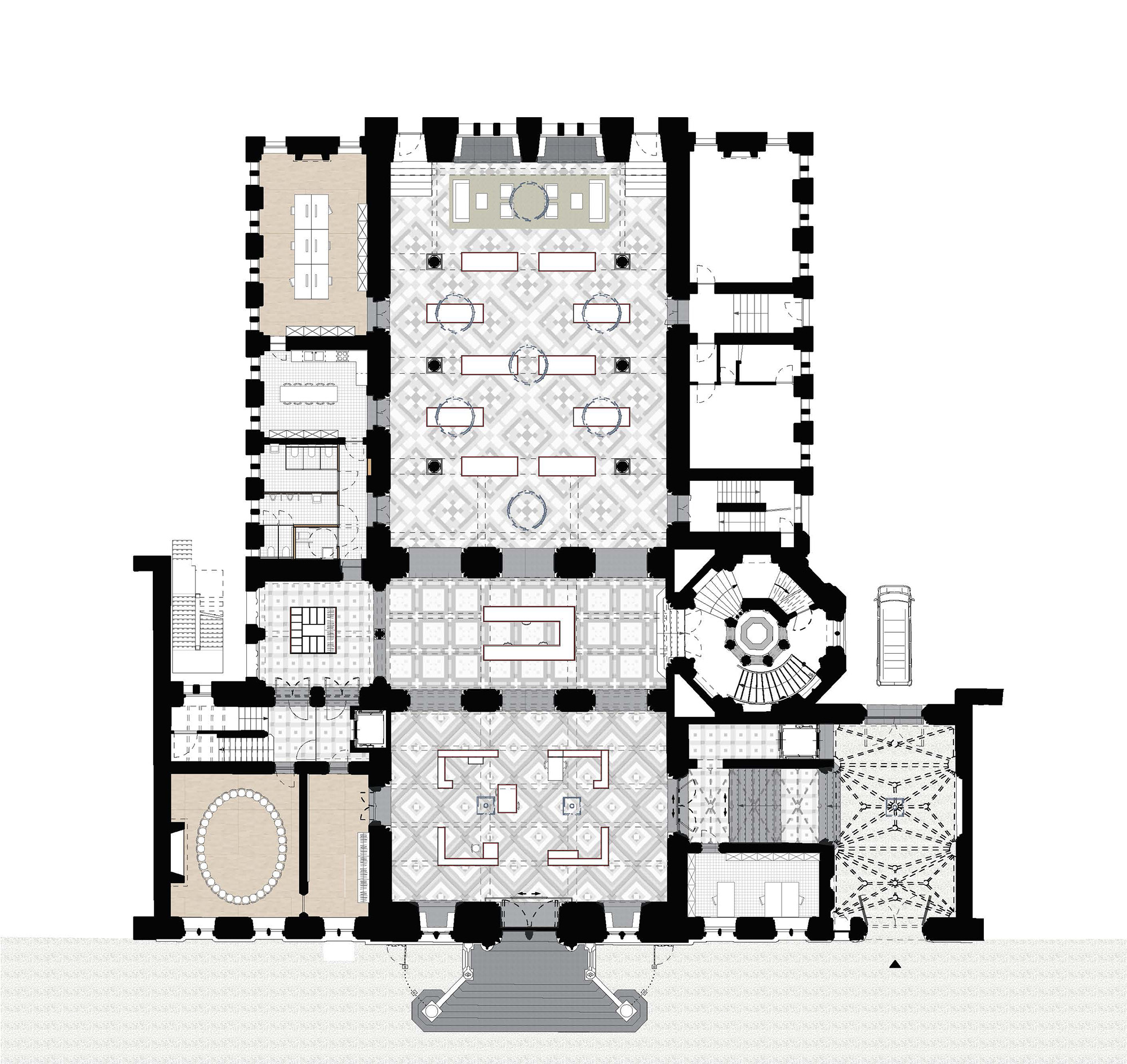 A century ago, city architect Louis Delacencerie built this slightly too imposing building to compete with nearby monuments, including the Belfry. The façade looks centrally over the market but, with its wide central staircase, the front door is not easy to reach. We don’t want to deface Delacencerie’s building so that it doesn’t lose its dignity and becomes a pastiche. We shift the entrée to the large entrance gate. This creates a generous portal and engaging sequence of entry for each. Once inside, we only need to restore the walls and floors to give the rooms back their grandeur and furnish them with fresh contrasting furniture.
