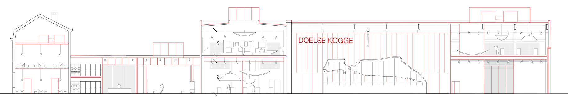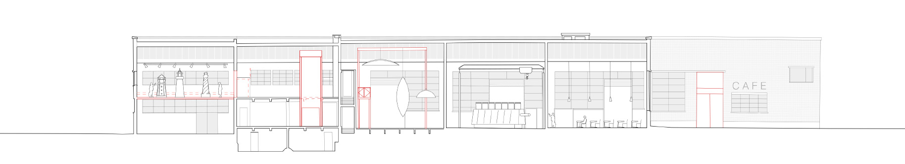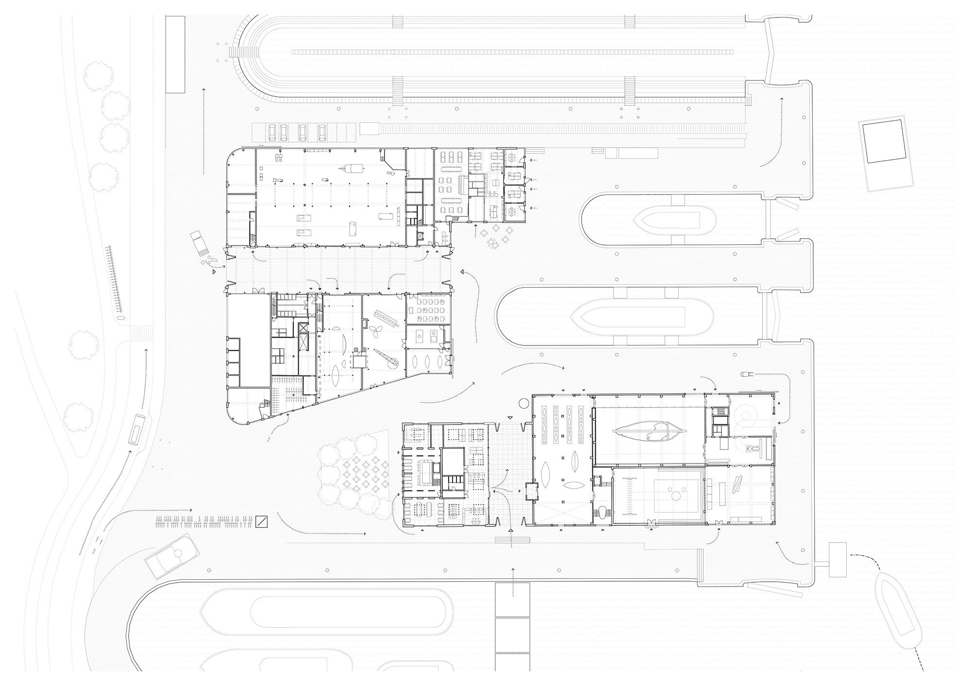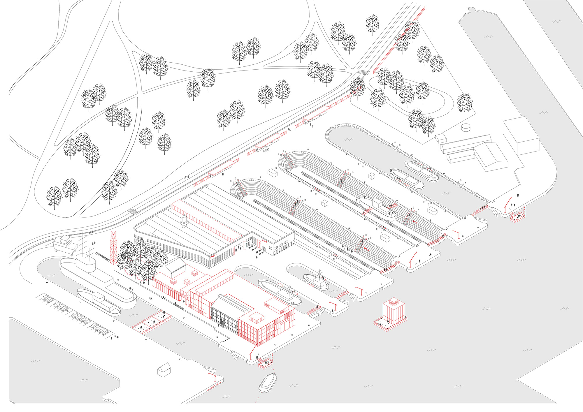 We preserve the work buildings. Even these that are not monuments. It is not about architecture but about how this site has evolved into what it is with the logic of an industrial workshop. We show things in the old workshops and only change the shell by metal plates, mainly to insulate them. We proceed like ships that are given metal hulls. The work, as if it were a ship, can be done on site as the first new work in the shipyard.
