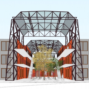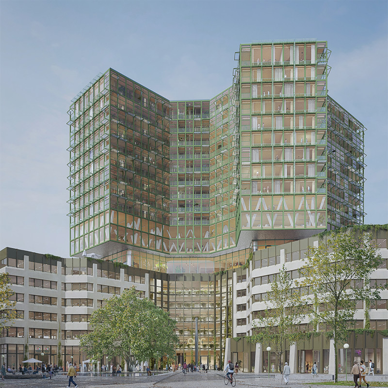 Reconversion of a monofunctional office building into an open mixed-use urban component